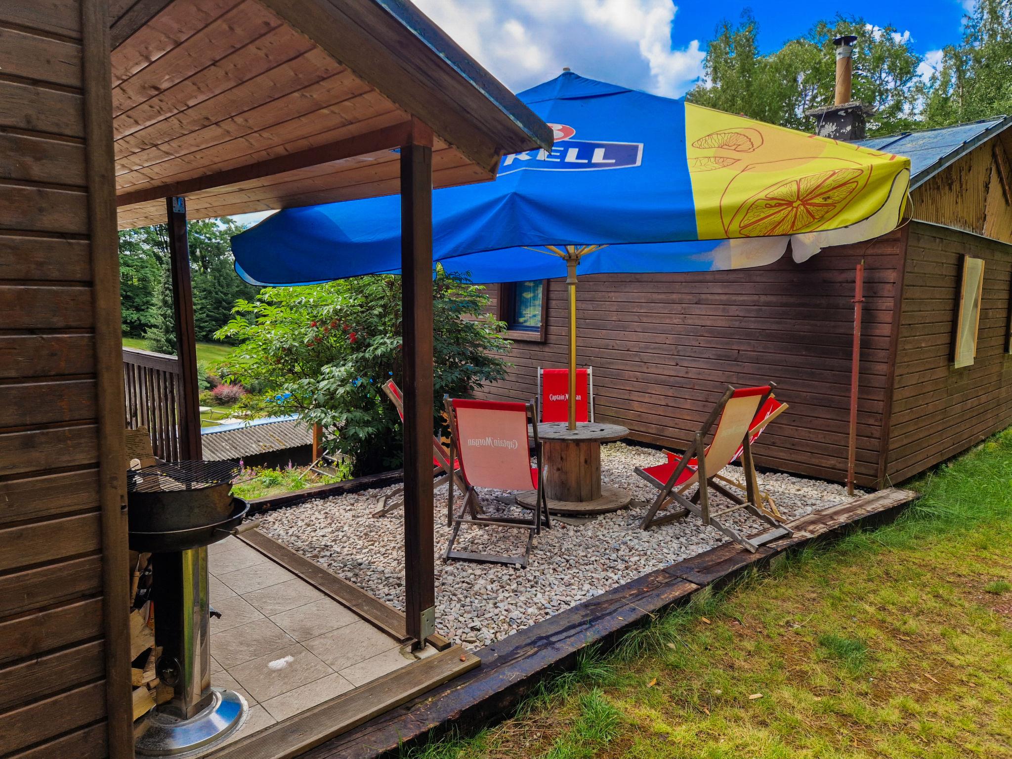 "Lesní plovárna B3", 1-room bungalow. Comfortable furnishings: living/sleeping room with 1 x 2 bunk beds, 1 double bed, Scandinavian wood stove, dining table and TV (flat screen). Kitchenette (2 hot plates, toaster, kettle, microwave, electric coffee machine, Capsules for coffee machine (Tchibo)). Shower/WC. Electric heating, wood heating. Terrace. Terrace furniture, barbecue (portable), deck chairs. Facilities: Internet (WiFi, free). Please note: suitable for families. Non-smoking house. 1 small pet/ dog allowed.