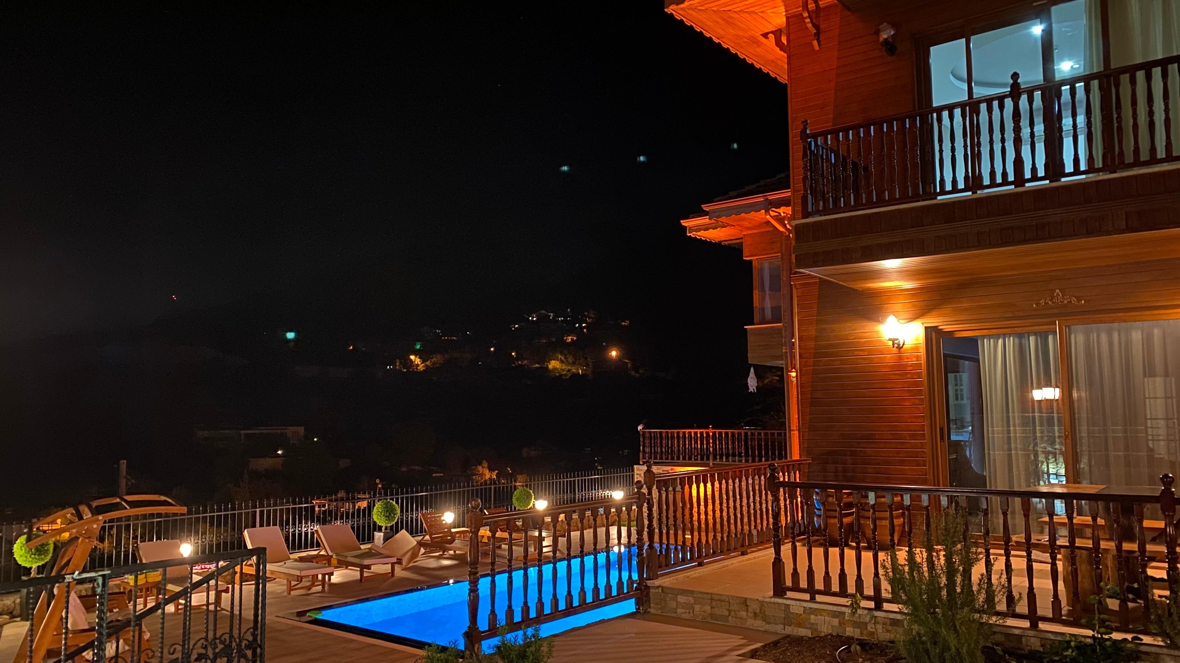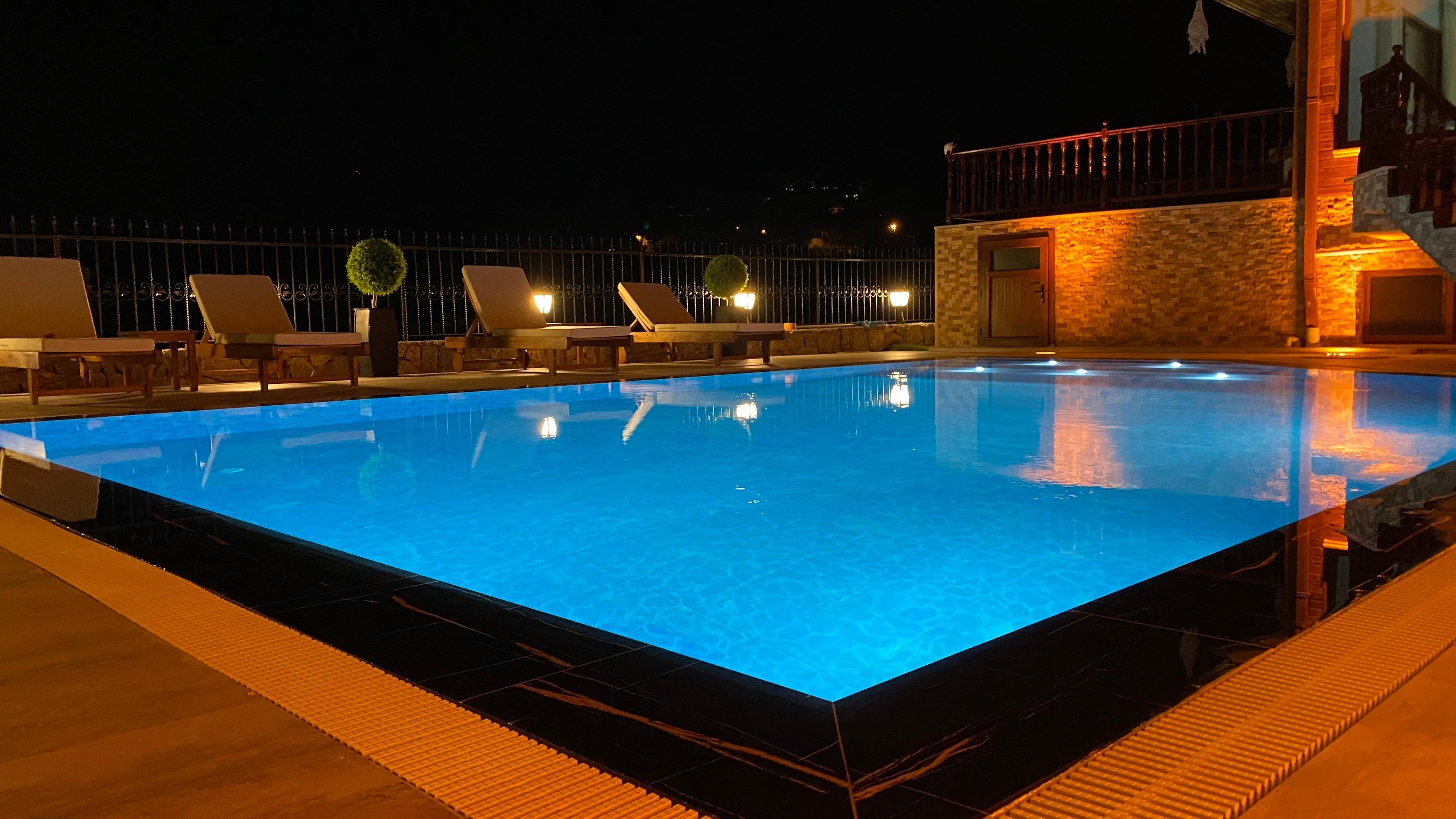 Das Haus sowie das Pool sind nachts beleuchtet.