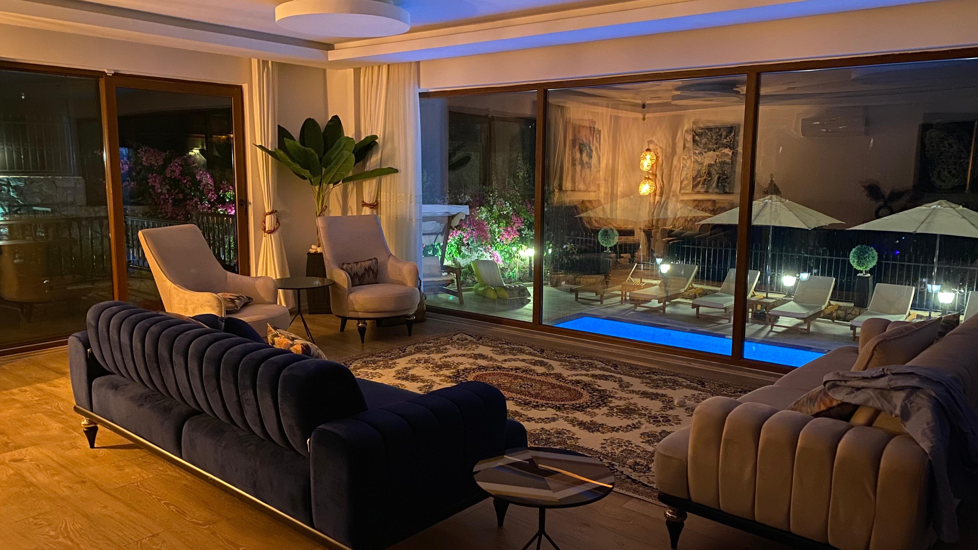 Das 60qm große Wohnzimmer mit Blick auf den Pool verfügt über zahlreiche Sitzplätze und eine durch maßgeschneiderte Holzdekoration abgelegene Fernsehecke. Die hochwertige Ausstattung rundet die gemütliche Atmosphäre ab. Vom Wohnzimmer erreicht man die Vordere Terrasse mit einem 3 m langen Holztisch aus einem Natur Baumstamm.