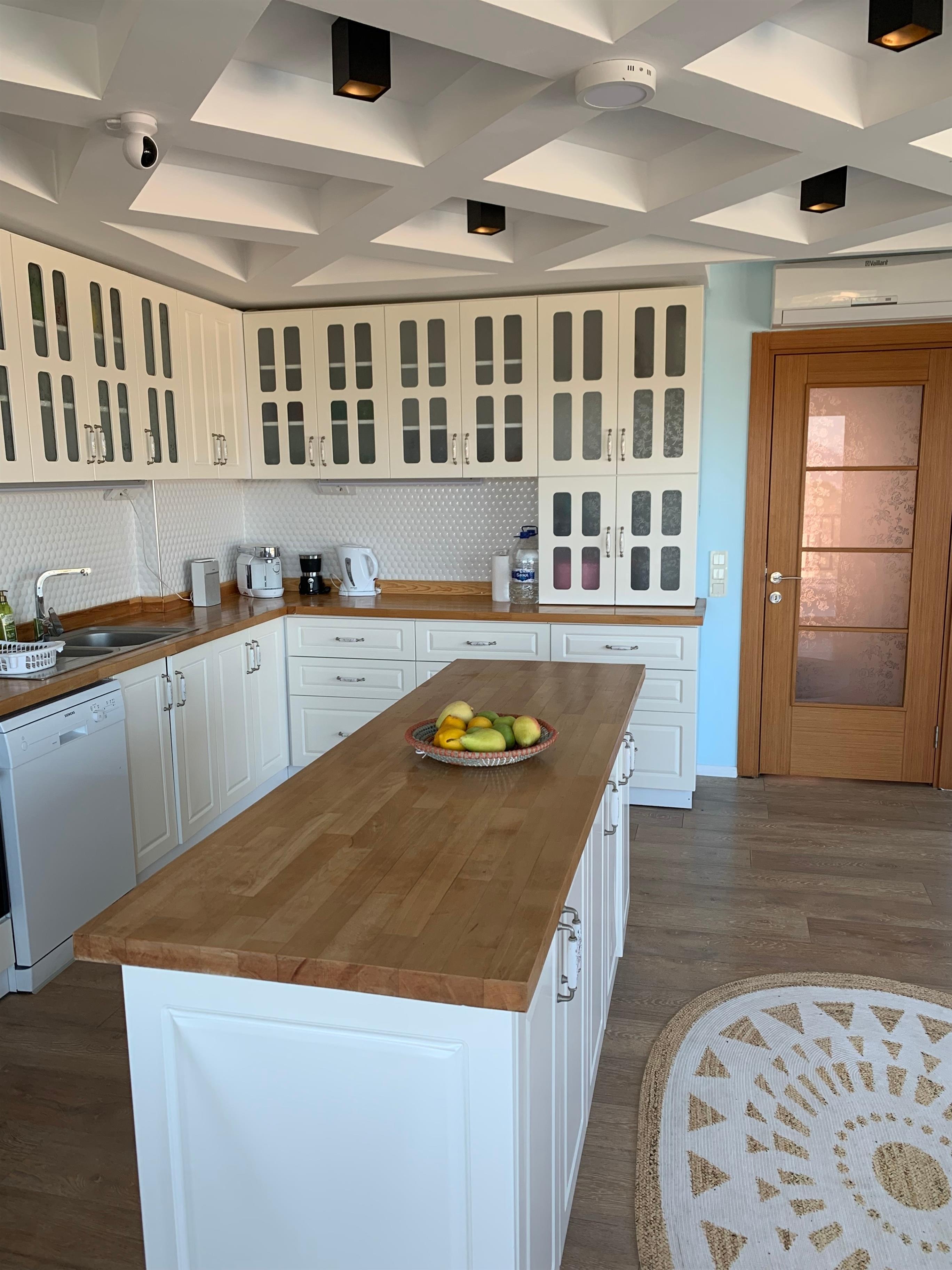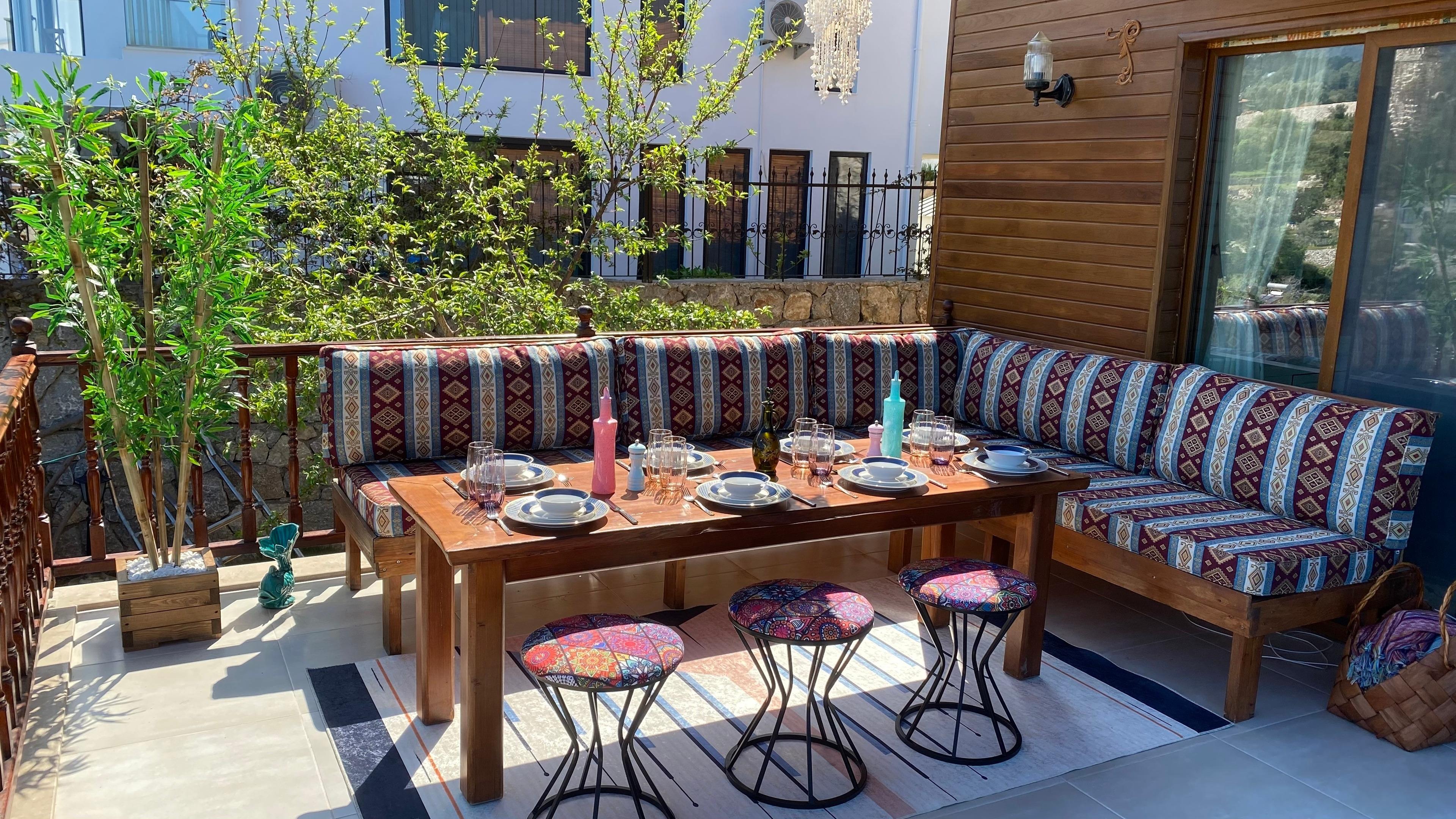 Die große Küche mit ihrer ganzheitlichen Ausstattung auf höchstem Niveau führt zu einer Aussen Terrasse mit gemütlicher Sitzmöglichkeiten, Am Tisch oder in der orientalischen Sitzecke.