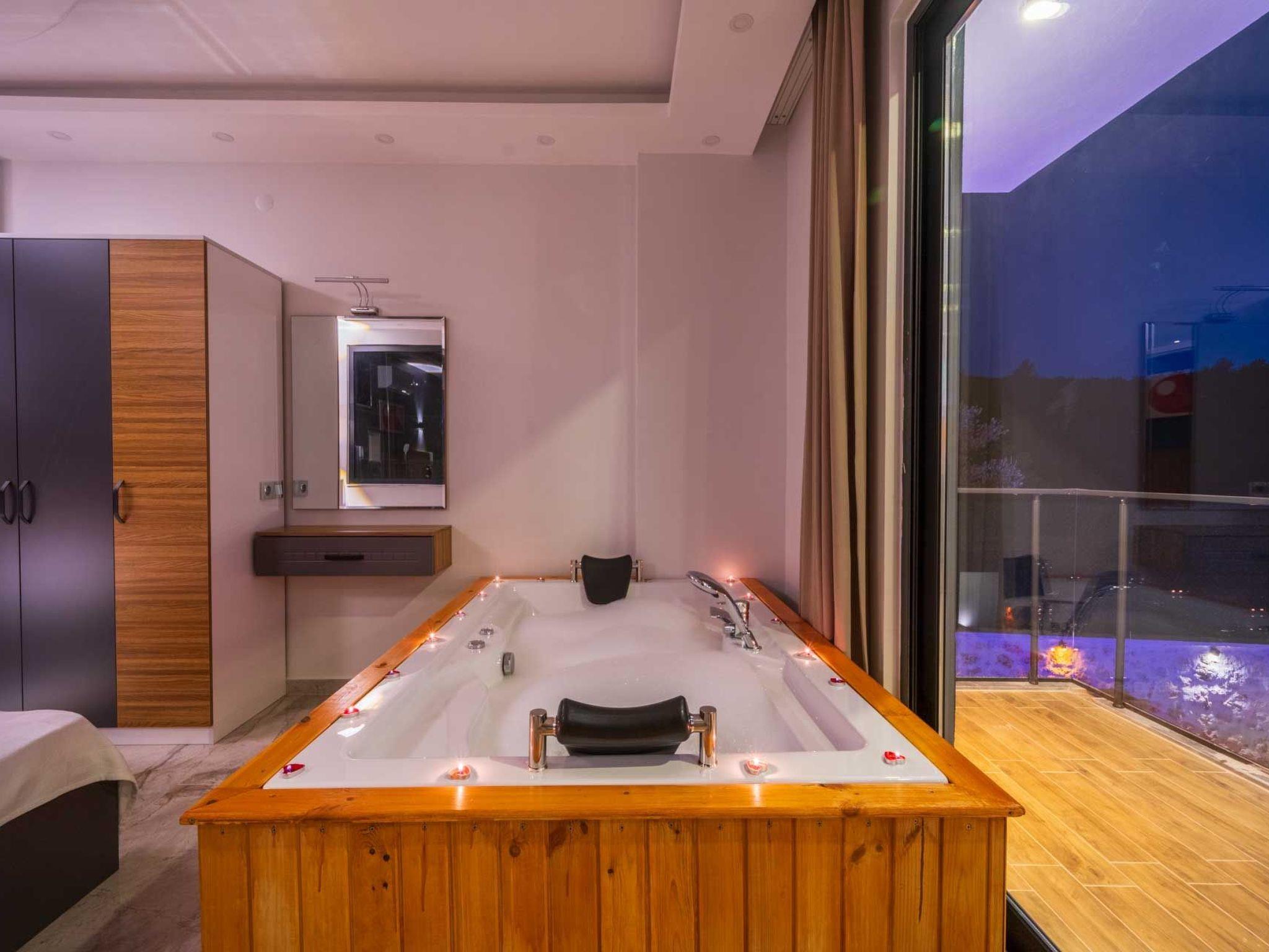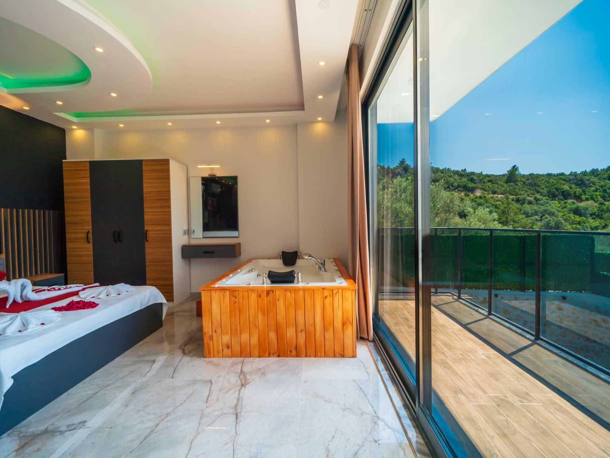 The villa is located in Kalkan Islamlar, surrounded by lush greenery and a picturesque landscape. It offers a spacious bedroom equipped with a luxurious Jacuzzi where you can spend relaxing hours. The villa is secluded and offers you complete privacy so that you can enjoy your time undisturbed.