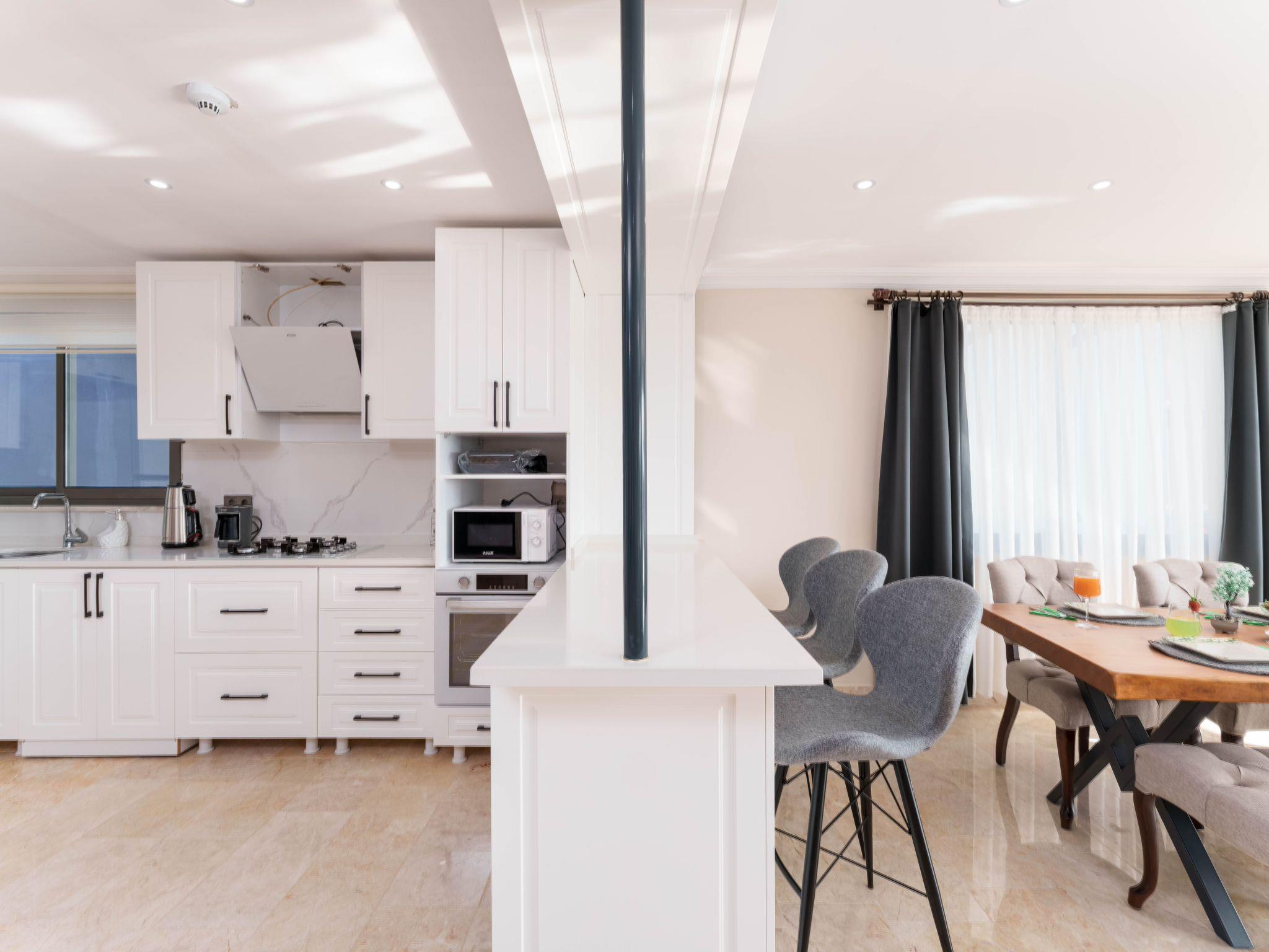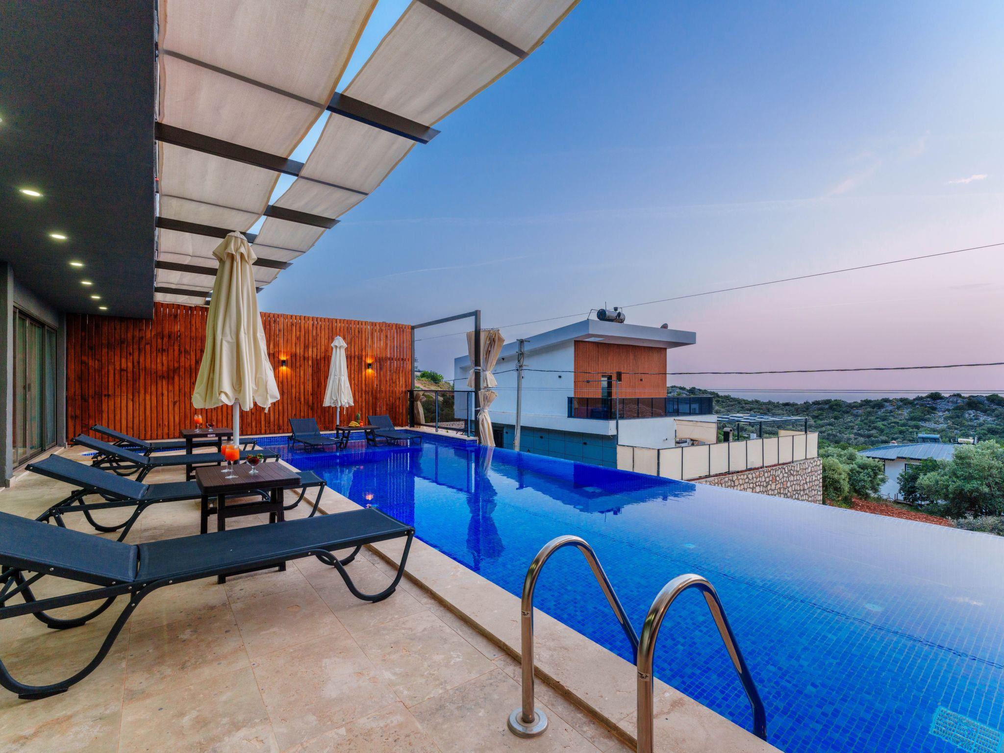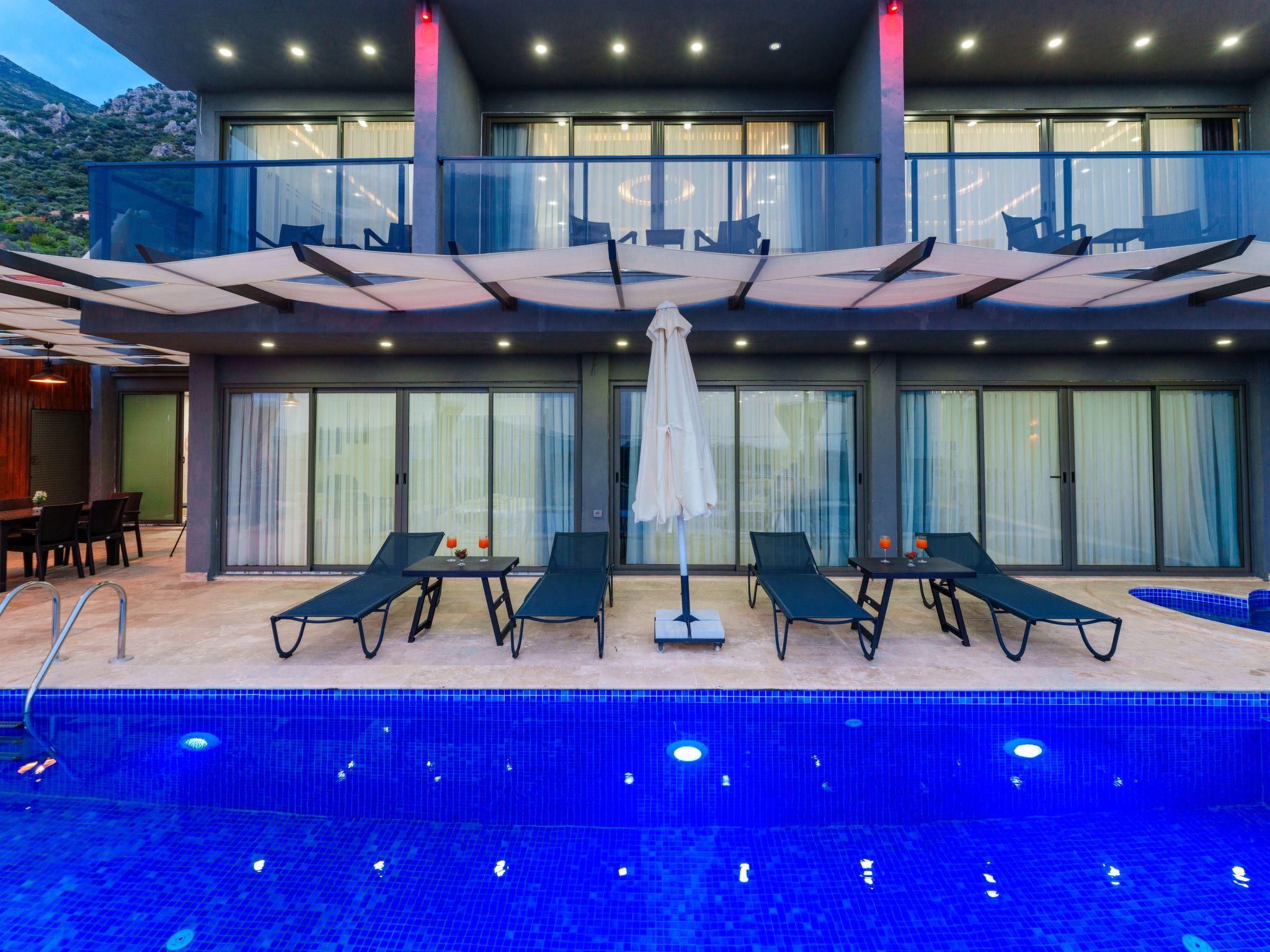 This luxurious villa is located in the Kalkan Kördere area and has 4 bedrooms and can accommodate up to 8 guests. With its mesmerising blue tones, luxurious design and modern architecture, it offers you a dream holiday experience. It is the ideal sea view rental villa for large families or groups of friends.
