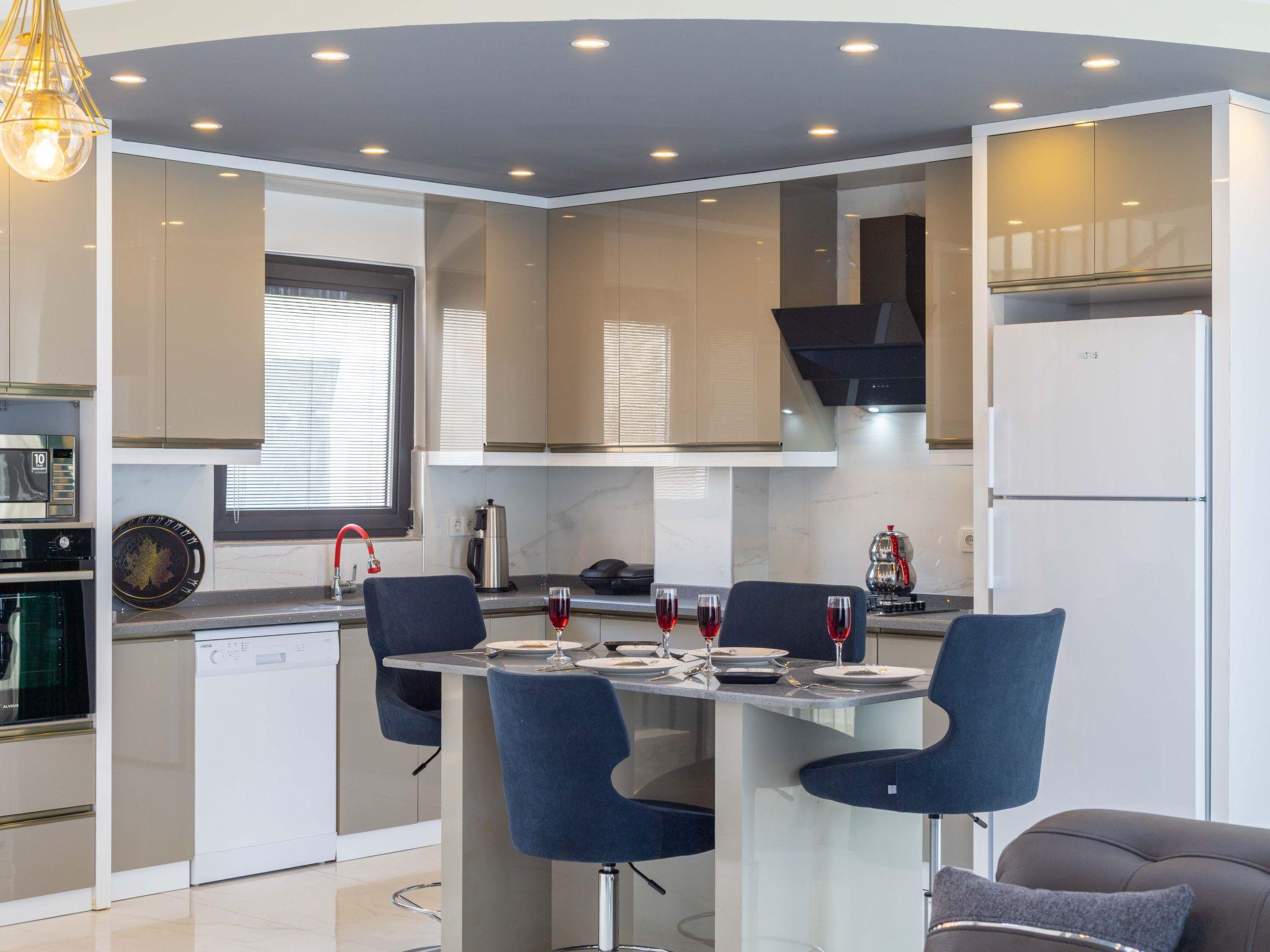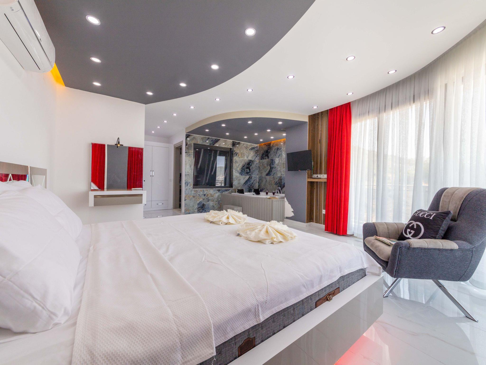 The location of the holiday home in Üzümlü is perfect for those looking for both relaxation and activities. Although you are in a quiet and peaceful environment, you are only 20 minutes away from the centre of Kalkan, where you will find a variety of shops, restaurants and cultural offerings. The beach is 9 km away and a grocery store is 2 km away, giving you the freedom to organise your days as you wish.