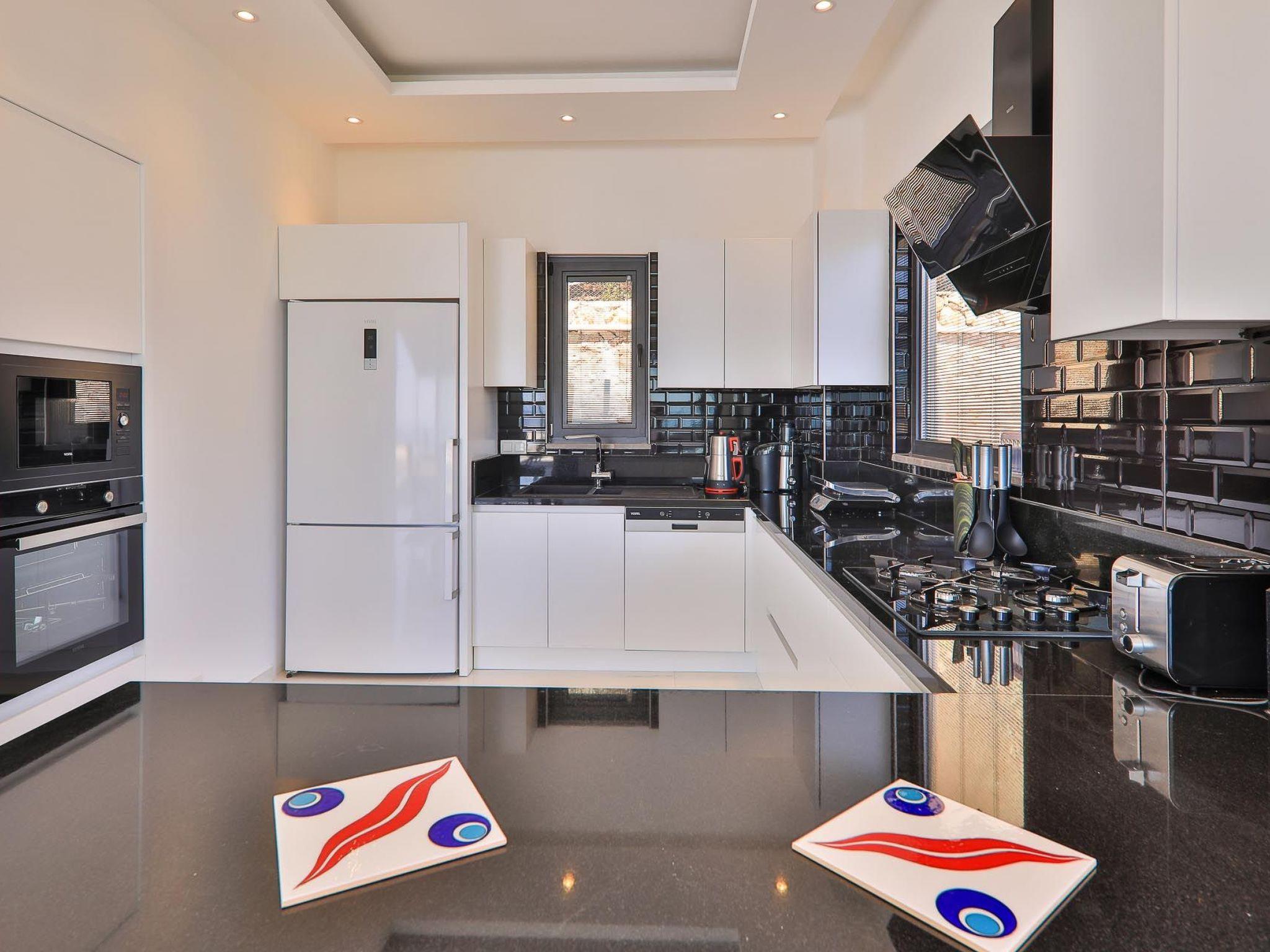 The location of the villa allows you to easily explore the charming surroundings of Kalkan. The beach and the sea are only 4000 metres away, ideal for those who love sand between their toes and salty sea air. The nearest town centre is around 3300 metres away and offers access to charming cafés and restaurants. For everyday shopping, you will find a grocery store just 900 metres away.