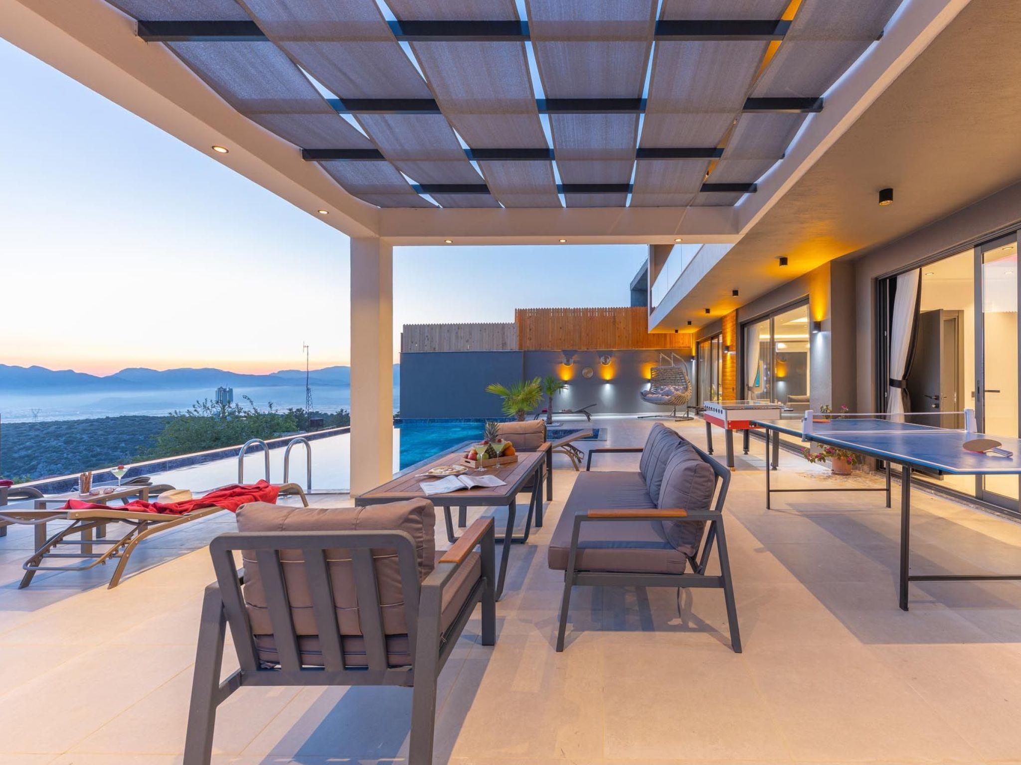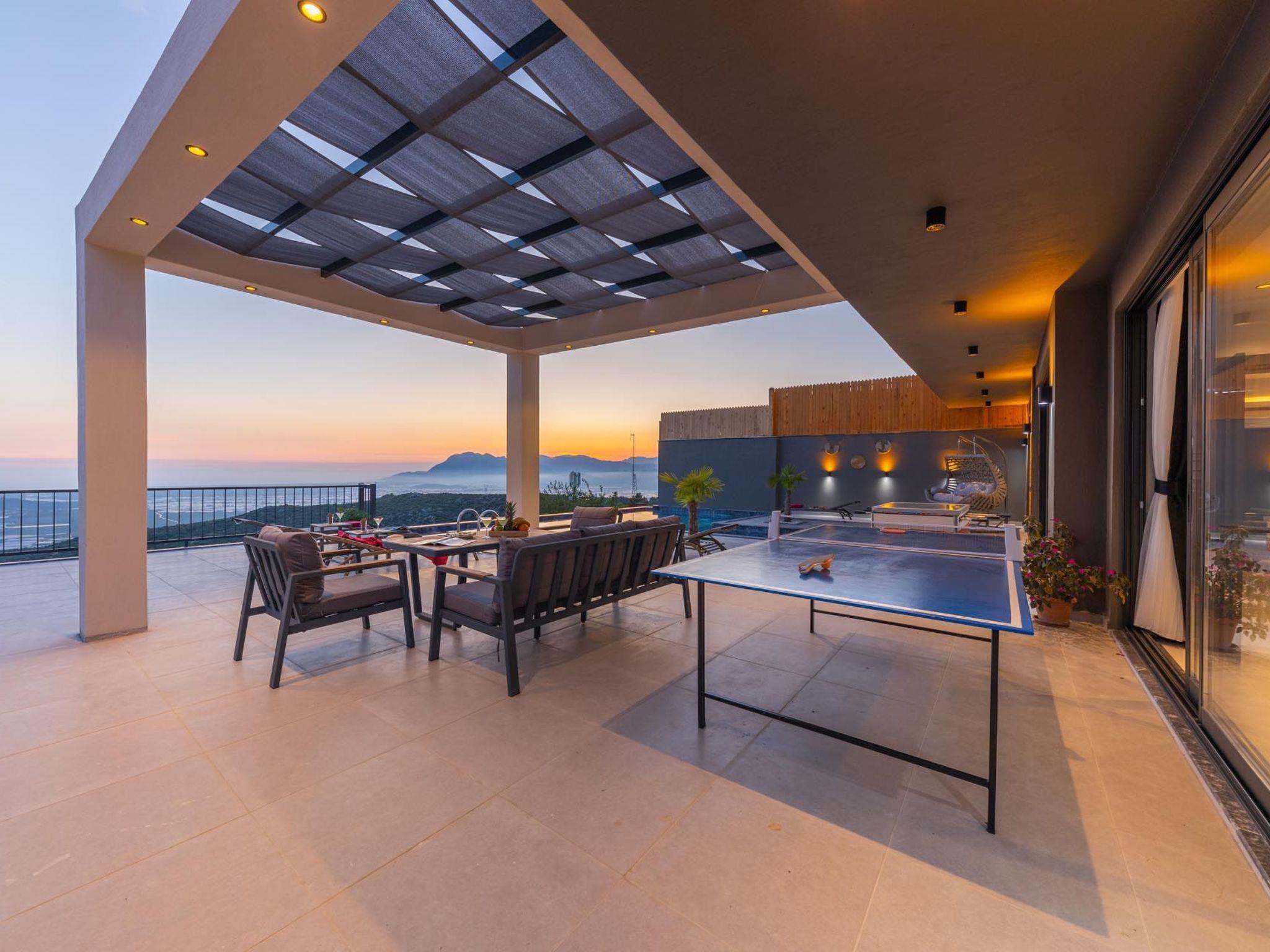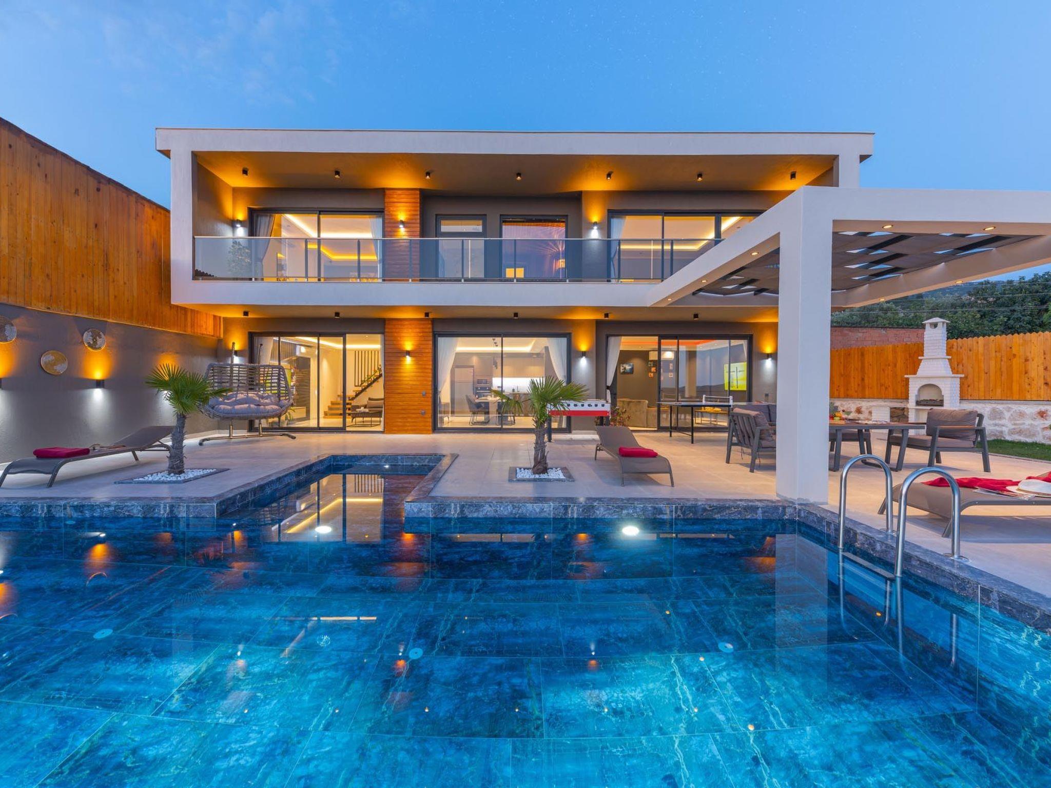 The villa is a luxurious villa located in Üzümlü, a quiet area and the best holiday resort of Kalkan. It offers a breathtaking view and you can even see the world famous Patara beach with a length of 13 km in the distance. The villa is spacious and has a special children's playground, a park and a garden area for families with children. The pool and pool terrace are generously designed and offer privacy. Therefore, the villa is an ideal choice for conservative families and honeymoon couples. The villa consists of a total of 2 suites. On the ground floor there is a modern kitchen and a living room. Thanks to the bed in the cinema room in the basement, a total of 7 people can be accommodated. Our villa offers a marvellous view from every room and provides a comfortable service with its sauna. There is a hot tub in both rooms, making it a villa with two hot tubs. With all these features, our villa awaits its valued guests. In addition, there is table tennis and table football for your entertainment in the villa.