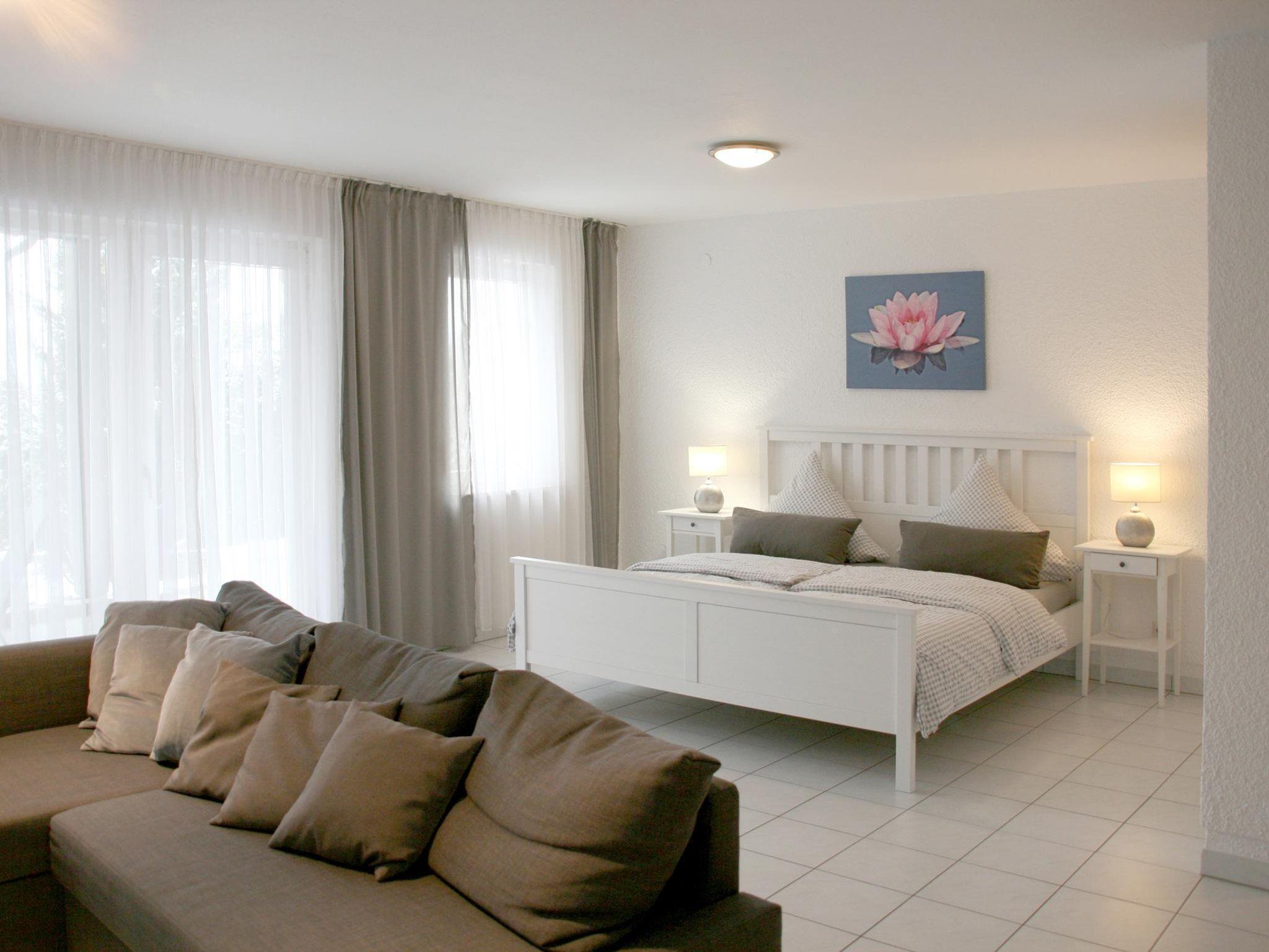 Die charmante Ferienwohnung liegt in ruhiger, zentrumsnaher Lage in Überlingen. Die 1-Zimmer Wohnung befindet sich in einem Mehrfamilienhaus im Erdgeschoss mit Zugang zum Garten. Innerhalb etwa fünf Gehminuten erreichen Sie das Strandbad und in fünfzehn Gehminuten die Stadtmitte der historischen Altstadt Überlingens. Von der Terrasse aus haben Sie blick auf den etwa 200 Meter entfernten Bodensee. Überlingen ist der ideale Ausgangspunkt für Ausflüge rund um den Bodensee, ob mit dem Fahrrad, zu Fuß, per Schiff oder mit anderen öffentlichen Verkehrsmitteln.