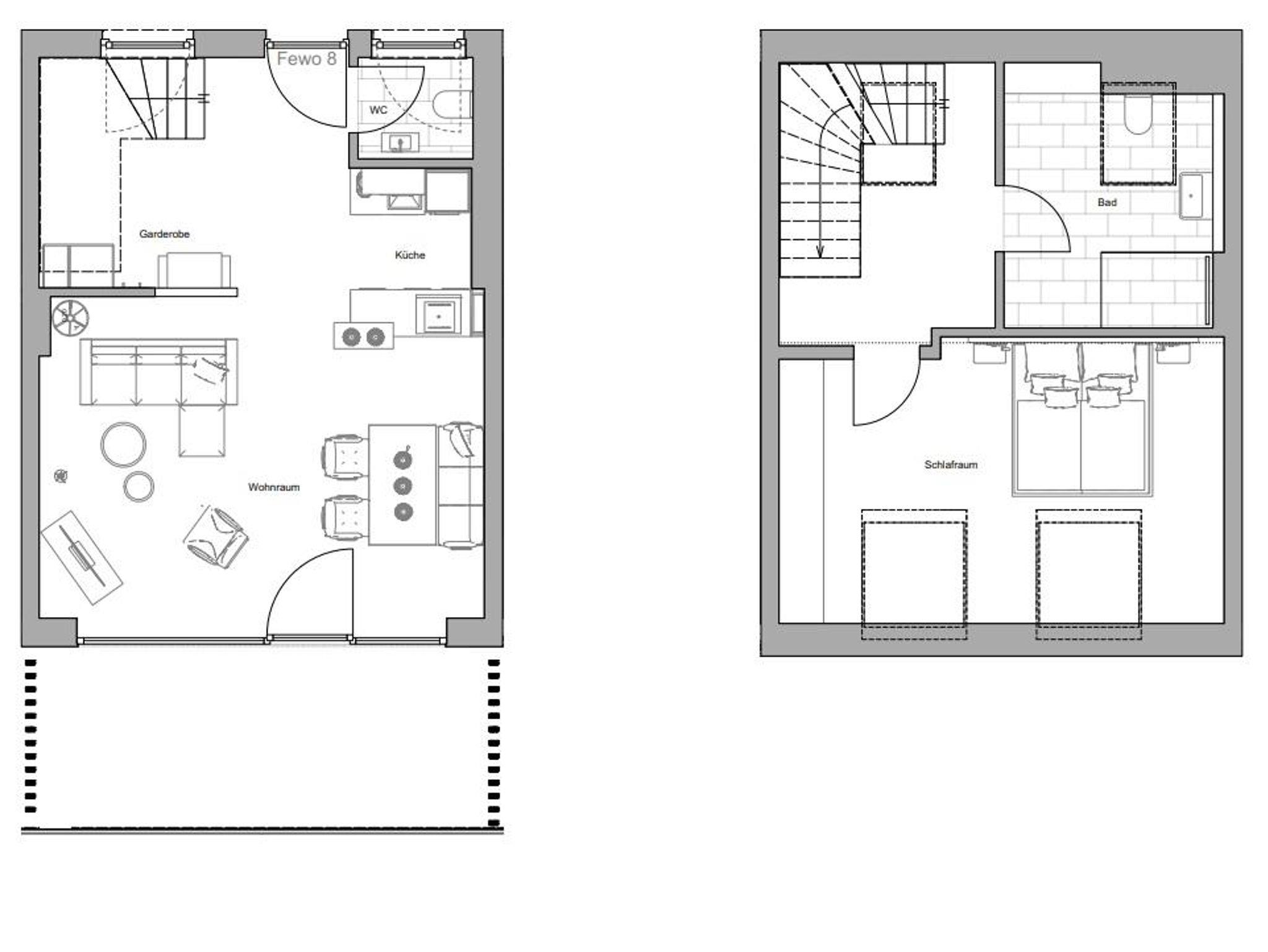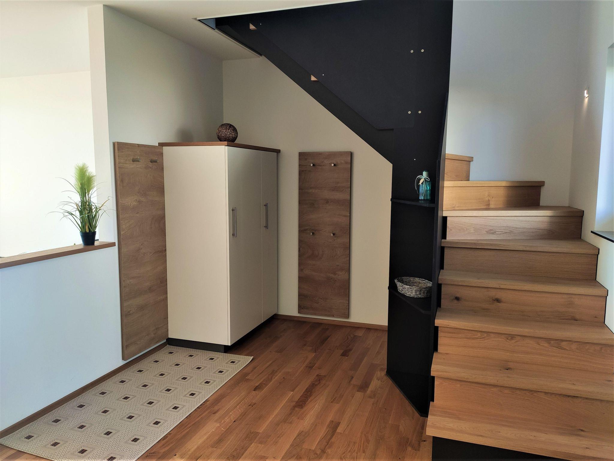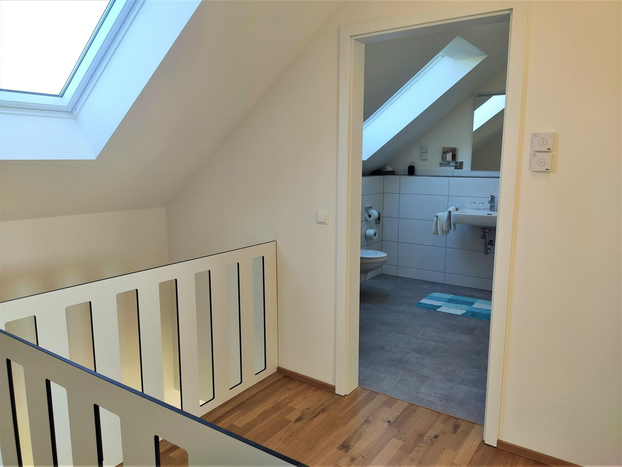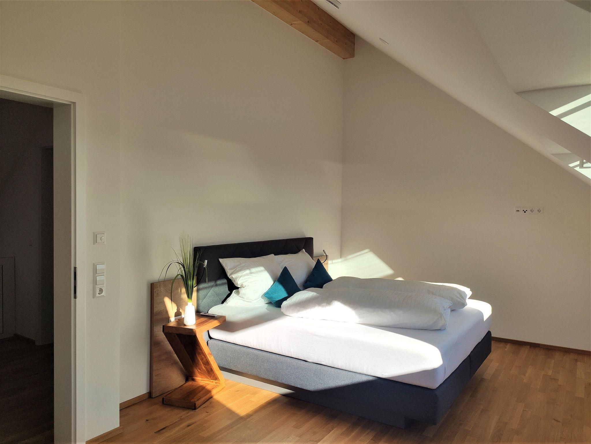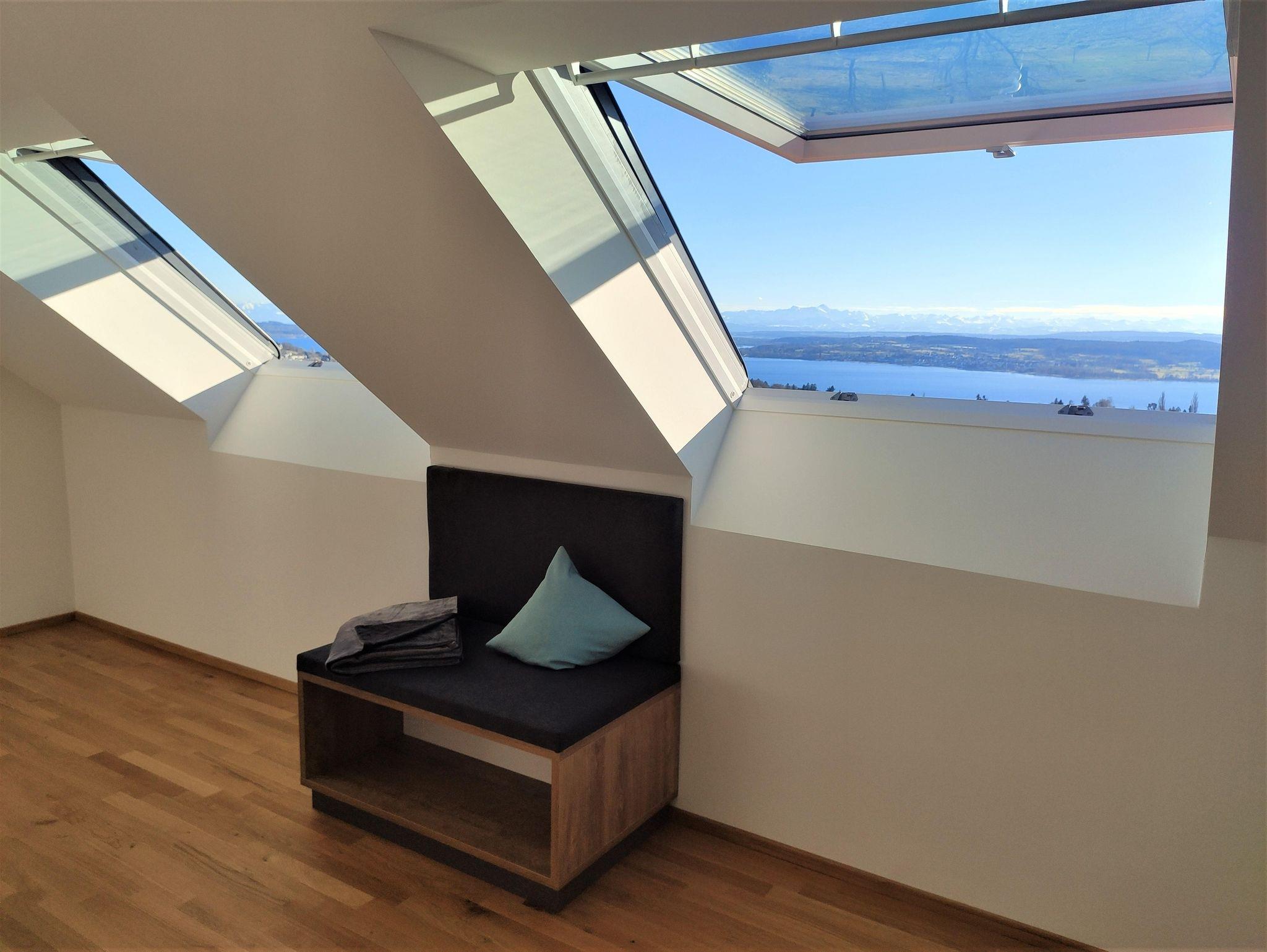 Die Maisonette-Wohnungen im Obergeschoss unserer beiden Häuser sind gemütlich ausgestattet und durch die große Glasfront hell und lichtdurchflutet. Im Eingangsbereich befinden sich eine Toilette und die Garderobe. Auf der gleichen Ebene ist die vollausgestatte Küche, sowie der Wohn- und Essbereich mit überdachtem Südbalkon, von dem aus Sie bei Fernsicht die unverwechselbare See- und Alpensicht genießen. Im Dachgeschoß liegt das Schlafzimmer mit zwei großen Dachfenstern als Rückzugsort. Daneben das Badezimmer mit Regendusche.