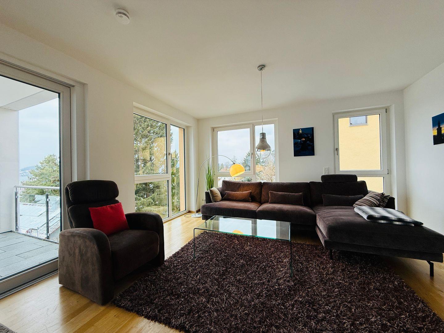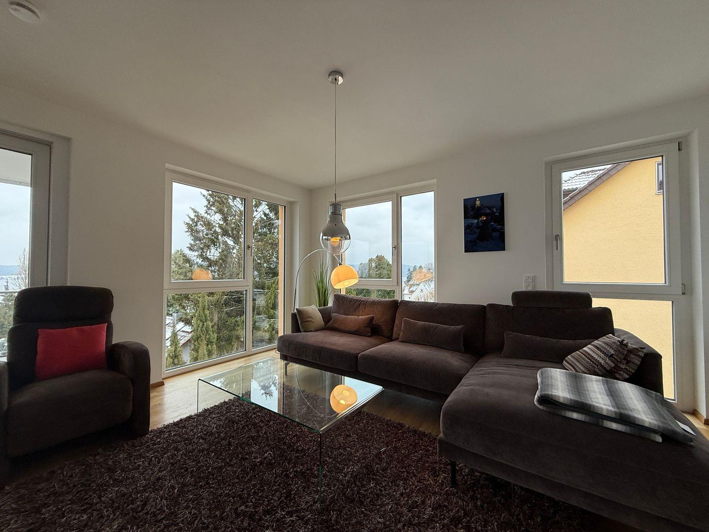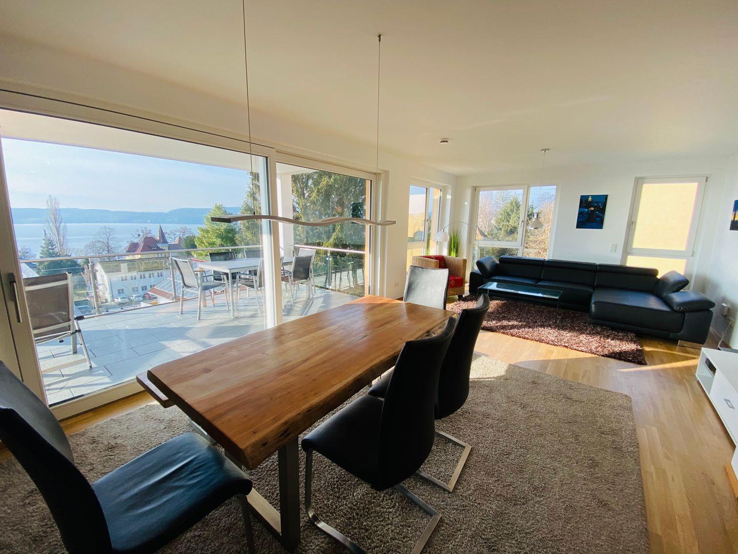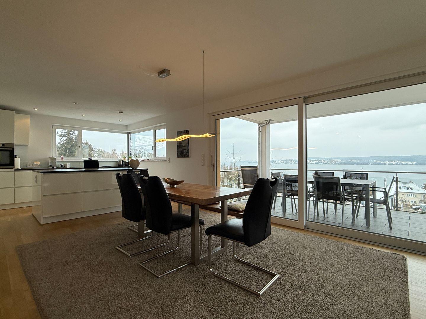 Zwei Schlafzimmer mit hochwertigen Boxspringbetten, ein Schlafzimmer mit Schlafsofa, eine moderne ALNO Star Highline Hochglanz-Küche und die Sonnenterrasse mit modernen Möbeln bieten höchsten Komfort für bis zu 6 Personen. Lifestyle beeindruckt mit luxuriöser Design-Ausstattung, die höchsten Ansprüchen gerecht wird. Moderne Möbel und stilvolle Details schaffen ein exklusives Ambiente. Die Sonnenterrasse ist mit wasserfesten modernen Möbeln ausgestattet und lädt zu entspannten Momenten mit Blick auf den Bodensee ein.