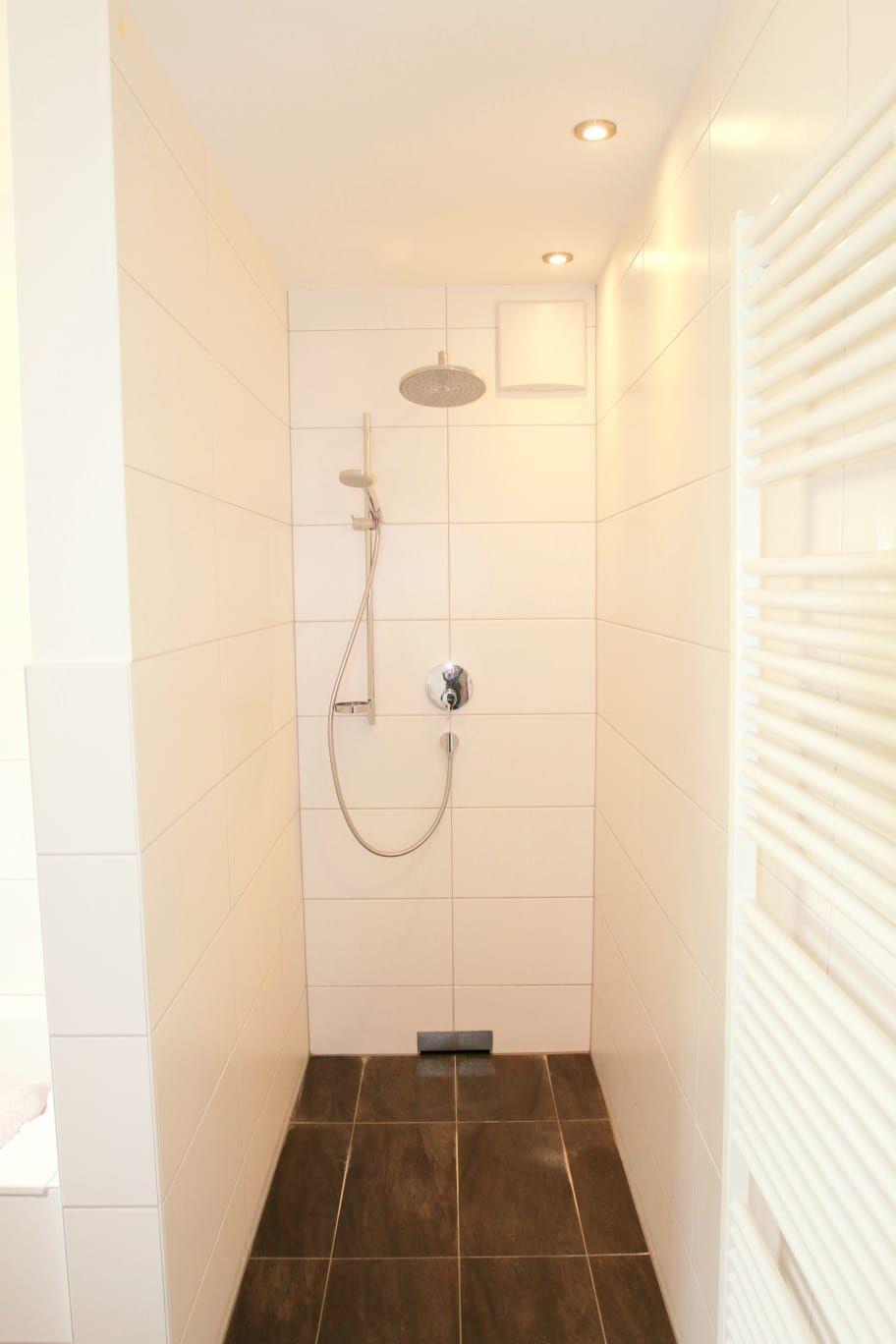 Im modernen Naturstein-Badezimmer finden Sie eine großzügige, bodenebene Regendusche, eine entspannende Badewanne, einen beleuchteten Waschtisch mit Ablagefläche sowie ein WC. Ein zusätzliches, separates Gäste-WC erhöht den Komfort.