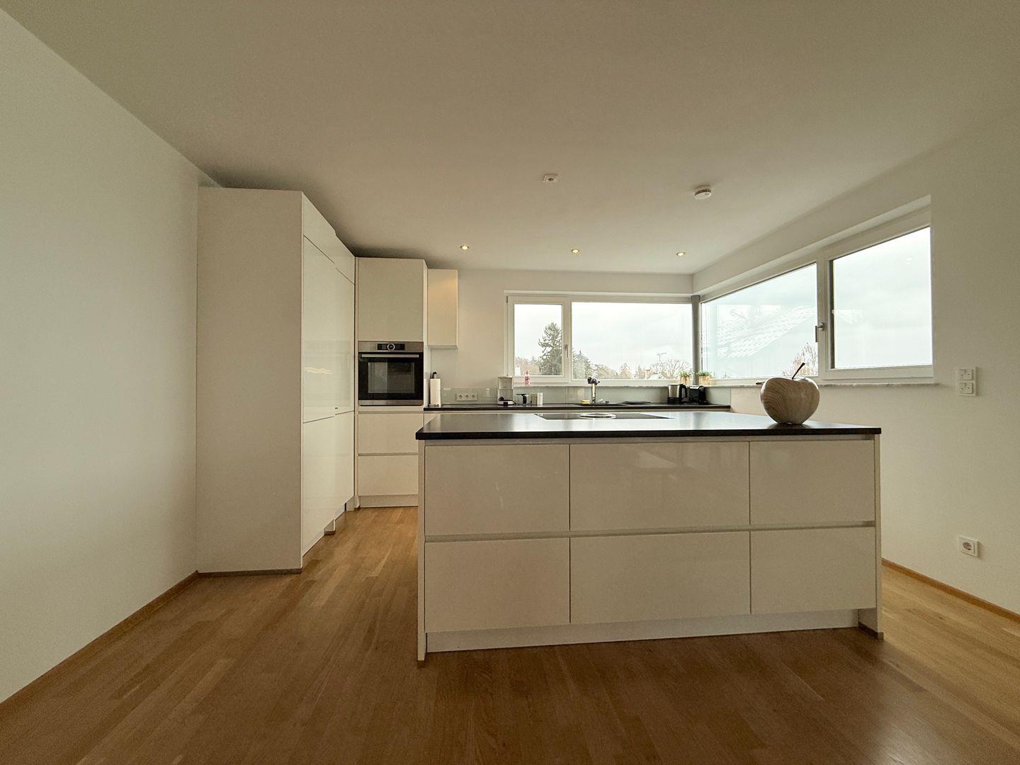 Die offen gestaltete Küche verfügt über einen modernen Induktionsherd, einen geräumigen Kühlschrank, eine Spülmaschine und eine vollständige Kochausstattung. Die großzügige Kücheninsel ermöglicht ein geselliges Kocherlebnis.