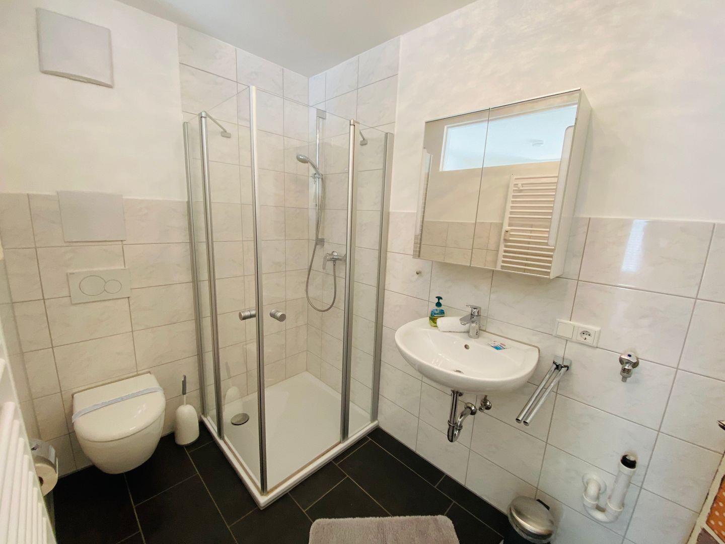 Vom Wohnraum gelangen Sie in das Schlafzimmer mit einem Doppelbett (140x200 cm). Das moderne Badezimmer begeistert mit einer bodenebenen Dusche, Waschbecken und WC.