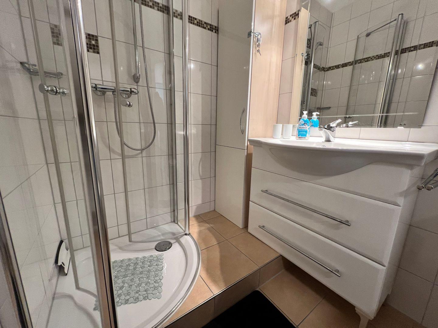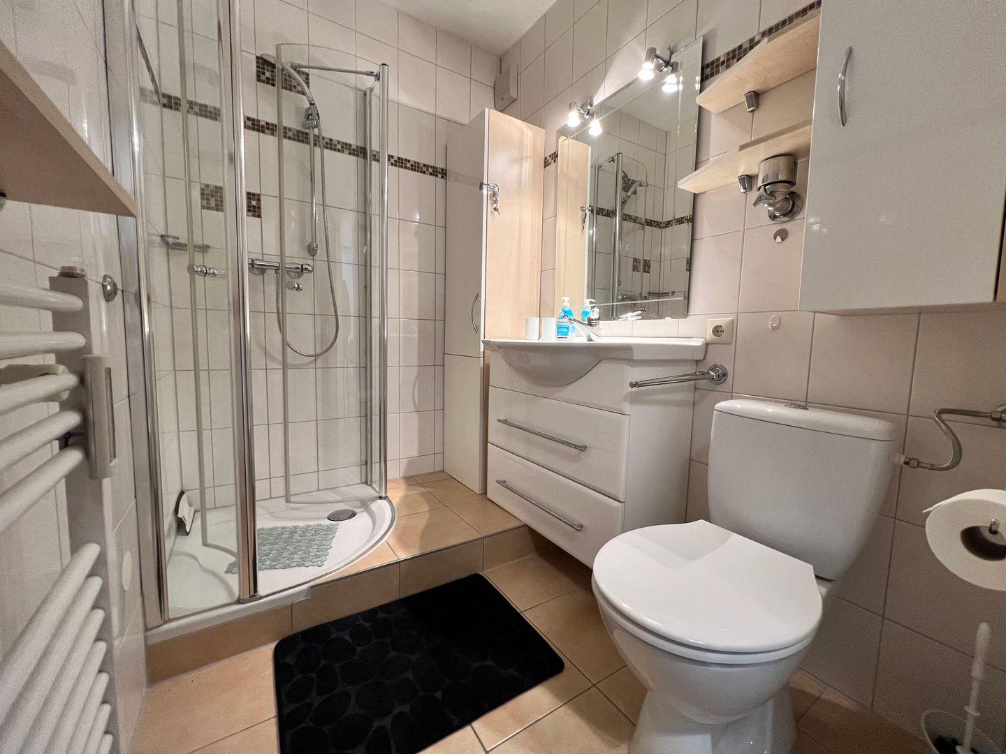 Das Schlafzimmer beeindruckt mit einem komfortablen Boxspring-Doppelbett (160x200 cm) und einer Garderobe für Ihre persönlichen Sachen. Das moderne Badezimmer bietet eine Dusche, einen beleuchteten Waschtisch, ein Stauraum-Regal und ein WC. Die Einrichtung der Wohnung ist gepflegt und setzt Akzente in Dunkelgrün und Grau, was eine moderne und entspannte Atmosphäre schafft.