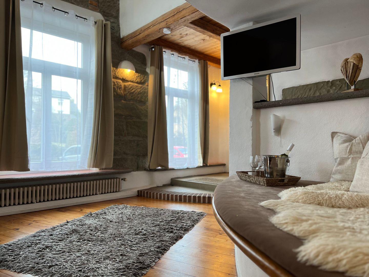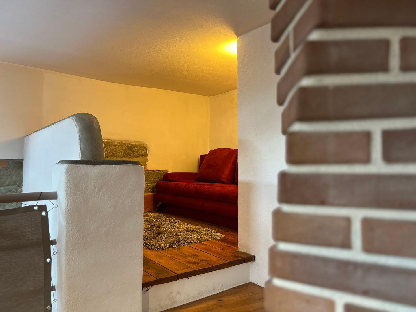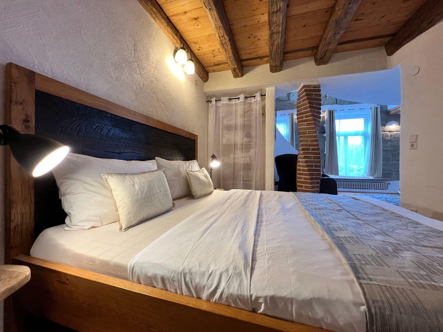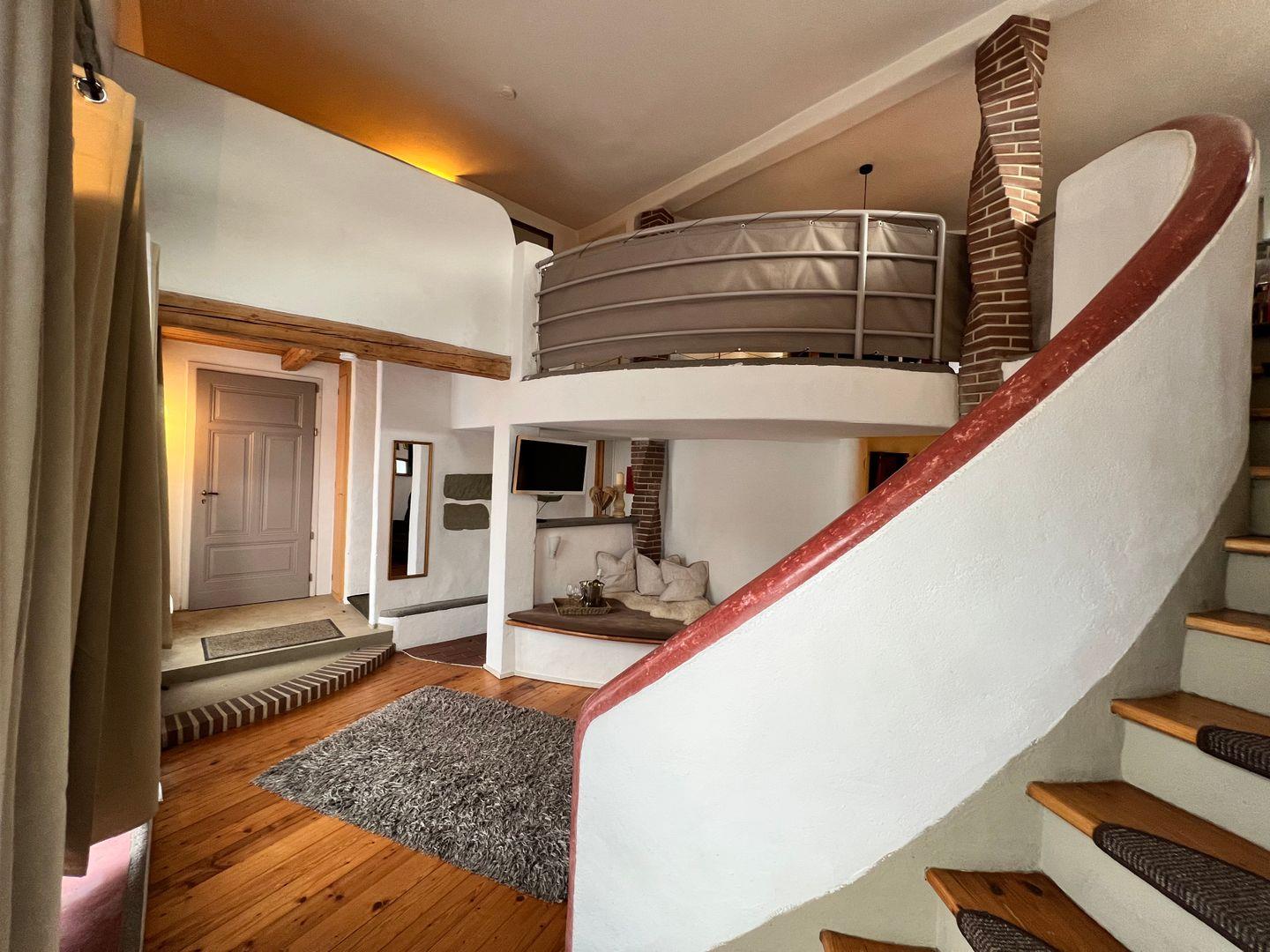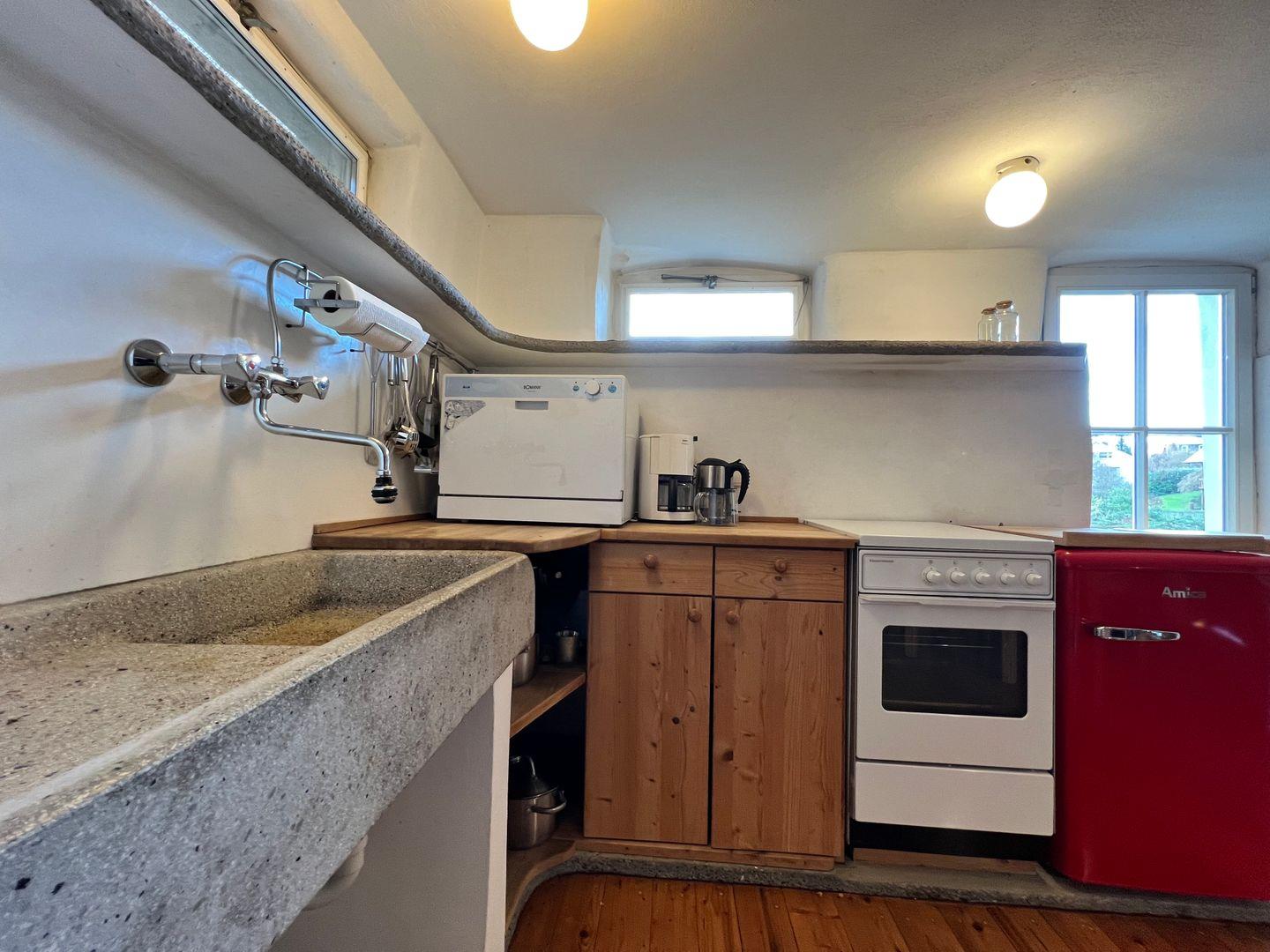 Im Erdgeschoss der offen gestalteten Galeriewohnung befindet sich der Wohn- und Schlafbereich mit gemütlichem Kachelofen. Der Schlafbereich im Erdgeschoss der Ferienwohnung bietet ein großzügiges Doppelbett (180x200 cm) sowie eine funktionale Garderobe mit Stauraum. Als weitere Schlafmöglichkeit steht in einer gemütlichen Nische im Obergeschoss eine Schlafcouch (160x200 cm ) zur Verfügung. Im Obergeschoss befinden sich die funktionale Küchenzeile sowie ein Essplatz für bis zu vier Personen. In der Küche steht neben Gasherd, Backofen und Kühlschrank auch eine Spülmaschine zur Verfügung. Im Tageslicht-Badezimmer finden Sie eine historische Dusch-Badewanne (mit Duschvorhang), einen Waschtisch mit beleuchtetem LED-Spiegel sowie ein WC. Durch einen separaten Zugang am Seitengebäude genießen Sie in der Ferienwohnung absolute Ruhe und Privatsphäre.