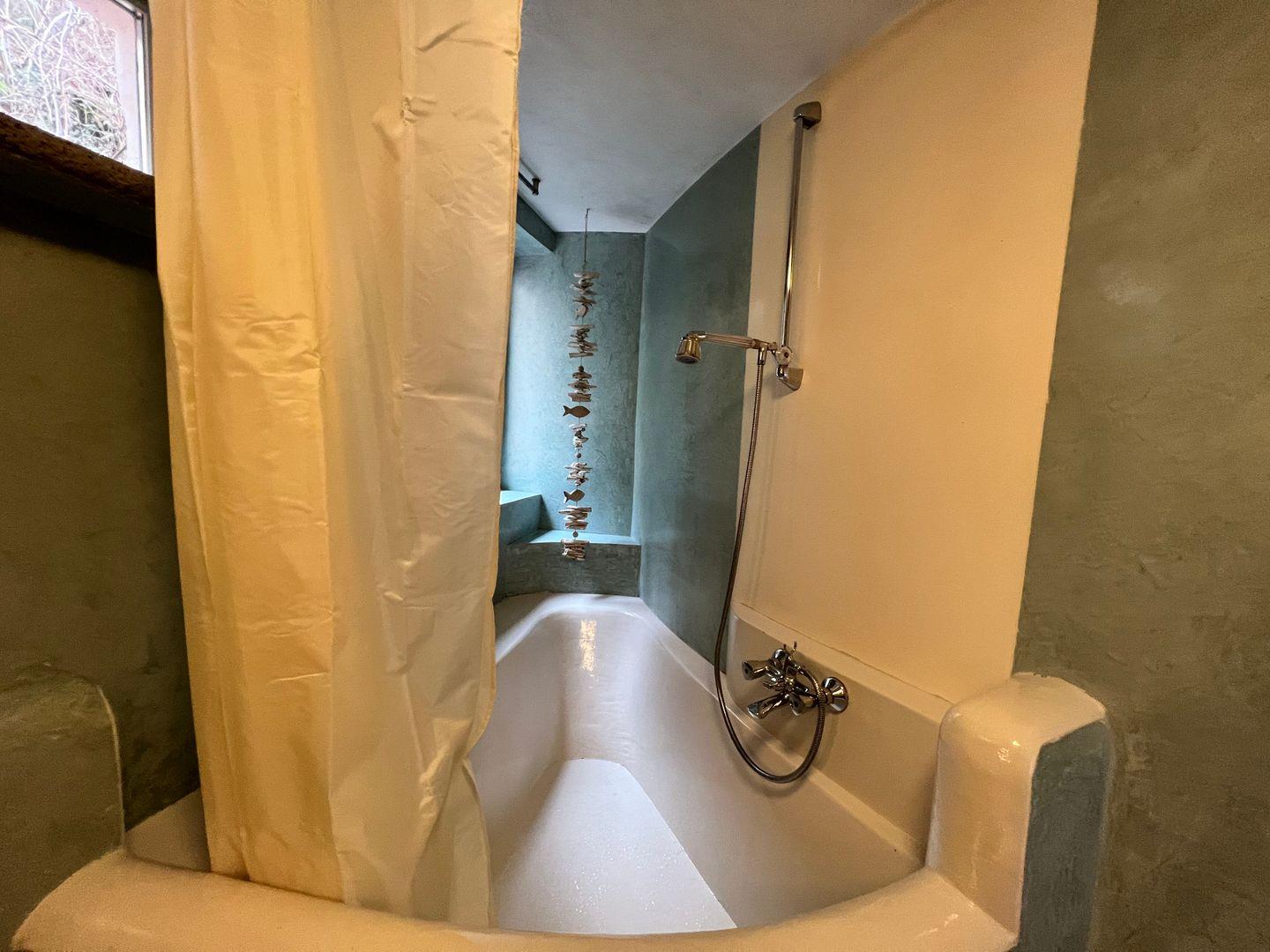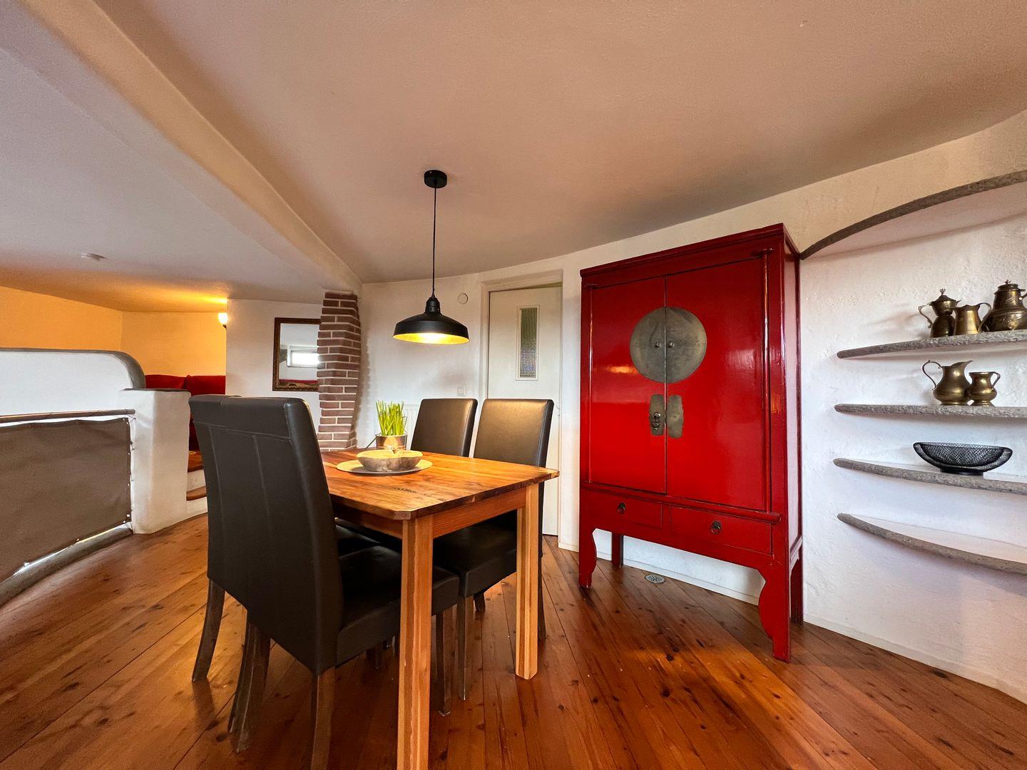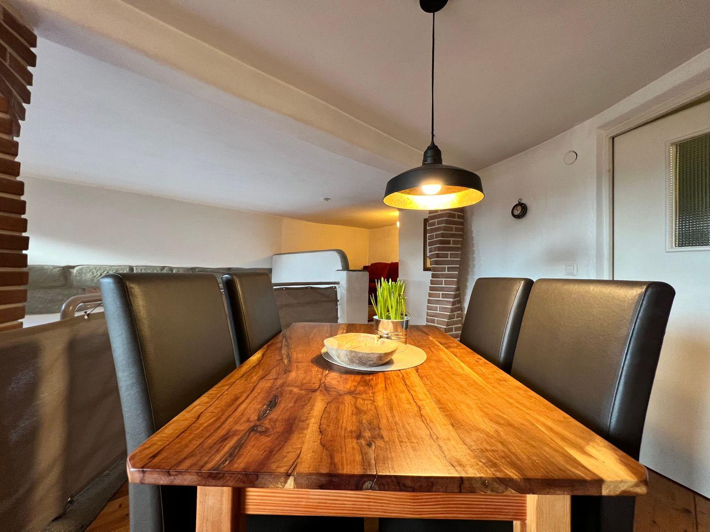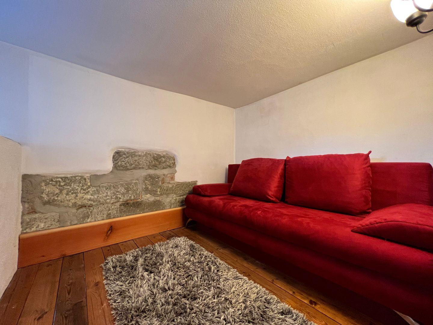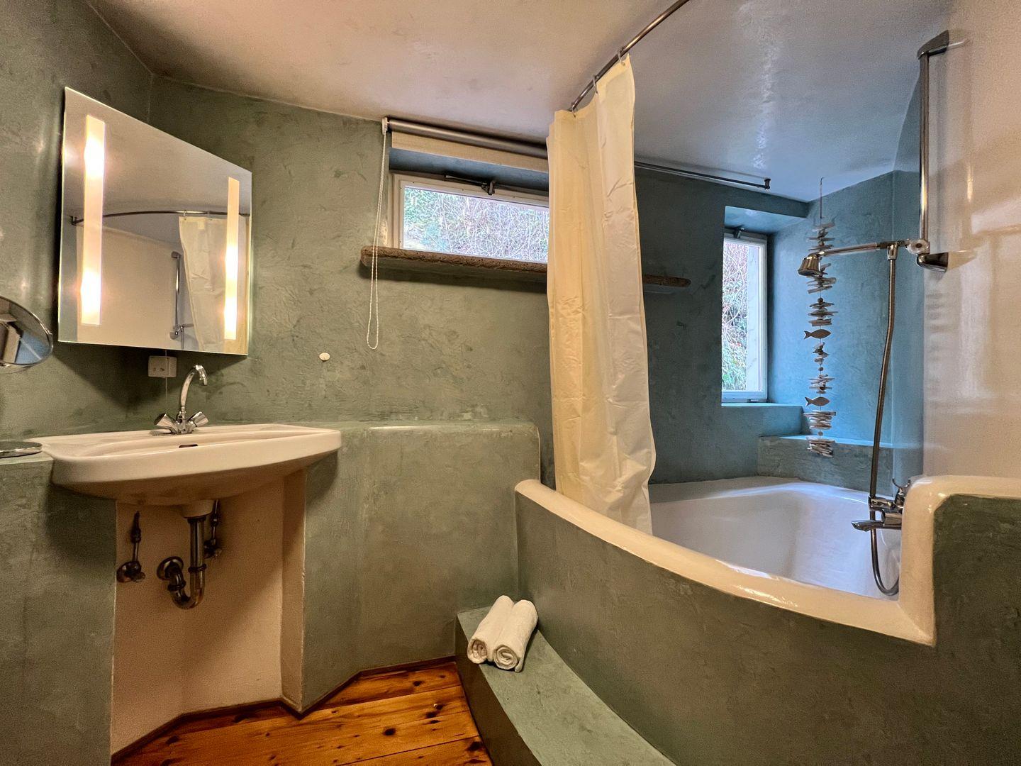 Im Erdgeschoss der offen gestalteten Galeriewohnung befindet sich der Wohn- und Schlafbereich mit gemütlichem Kachelofen. Der Schlafbereich im Erdgeschoss der Ferienwohnung bietet ein großzügiges Doppelbett (180x200 cm) sowie eine funktionale Garderobe mit Stauraum. Als weitere Schlafmöglichkeit steht in einer gemütlichen Nische im Obergeschoss eine Schlafcouch (160x200 cm ) zur Verfügung. Im Obergeschoss befinden sich die funktionale Küchenzeile sowie ein Essplatz für bis zu vier Personen. In der Küche steht neben Gasherd, Backofen und Kühlschrank auch eine Spülmaschine zur Verfügung. Im Tageslicht-Badezimmer finden Sie eine historische Dusch-Badewanne (mit Duschvorhang), einen Waschtisch mit beleuchtetem LED-Spiegel sowie ein WC. Durch einen separaten Zugang am Seitengebäude genießen Sie in der Ferienwohnung absolute Ruhe und Privatsphäre.