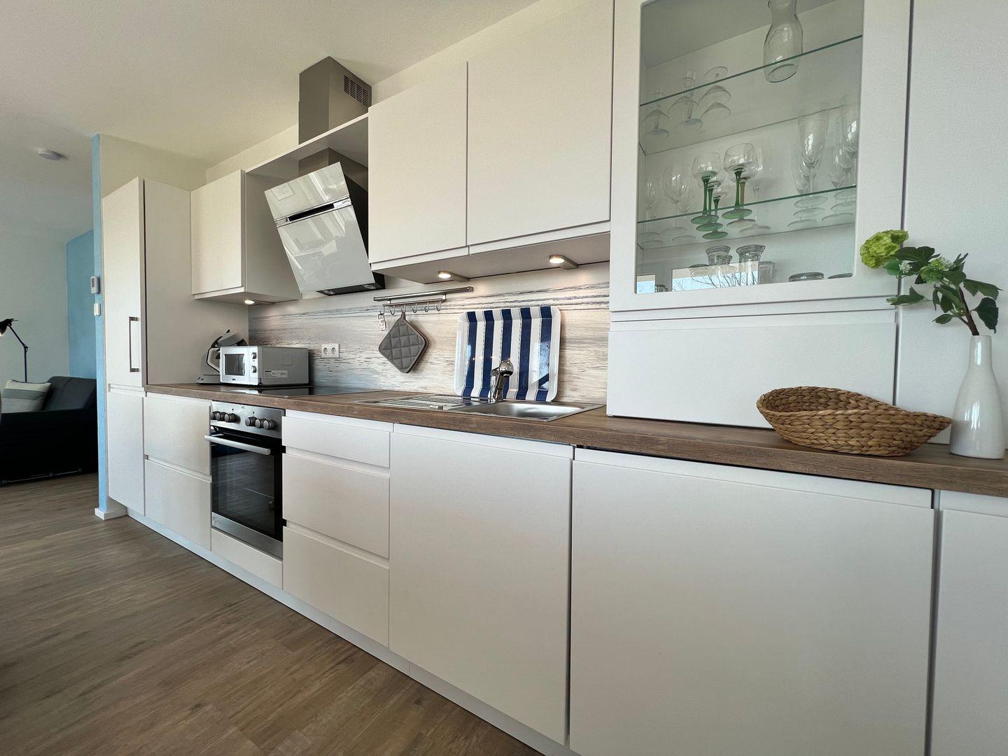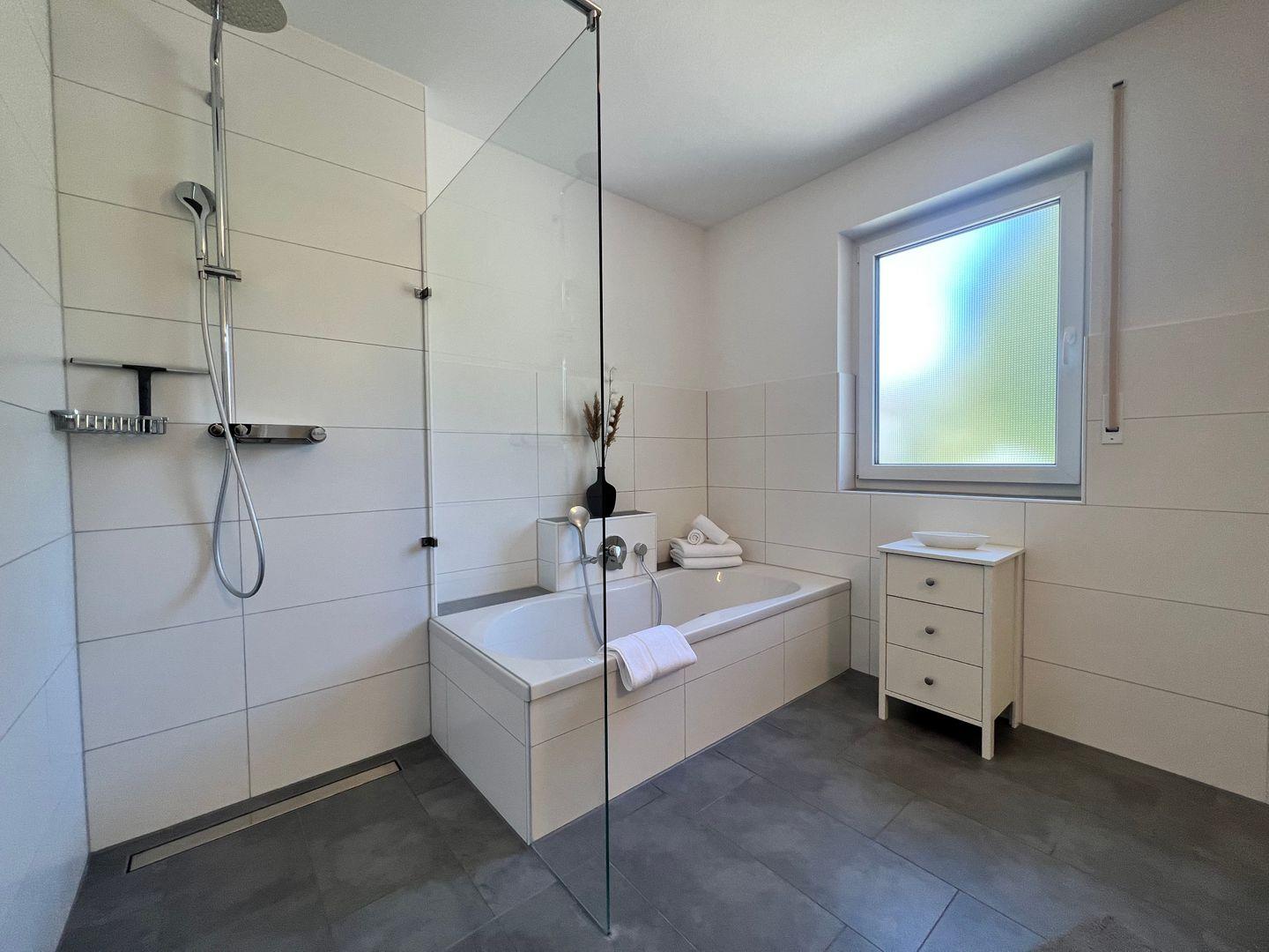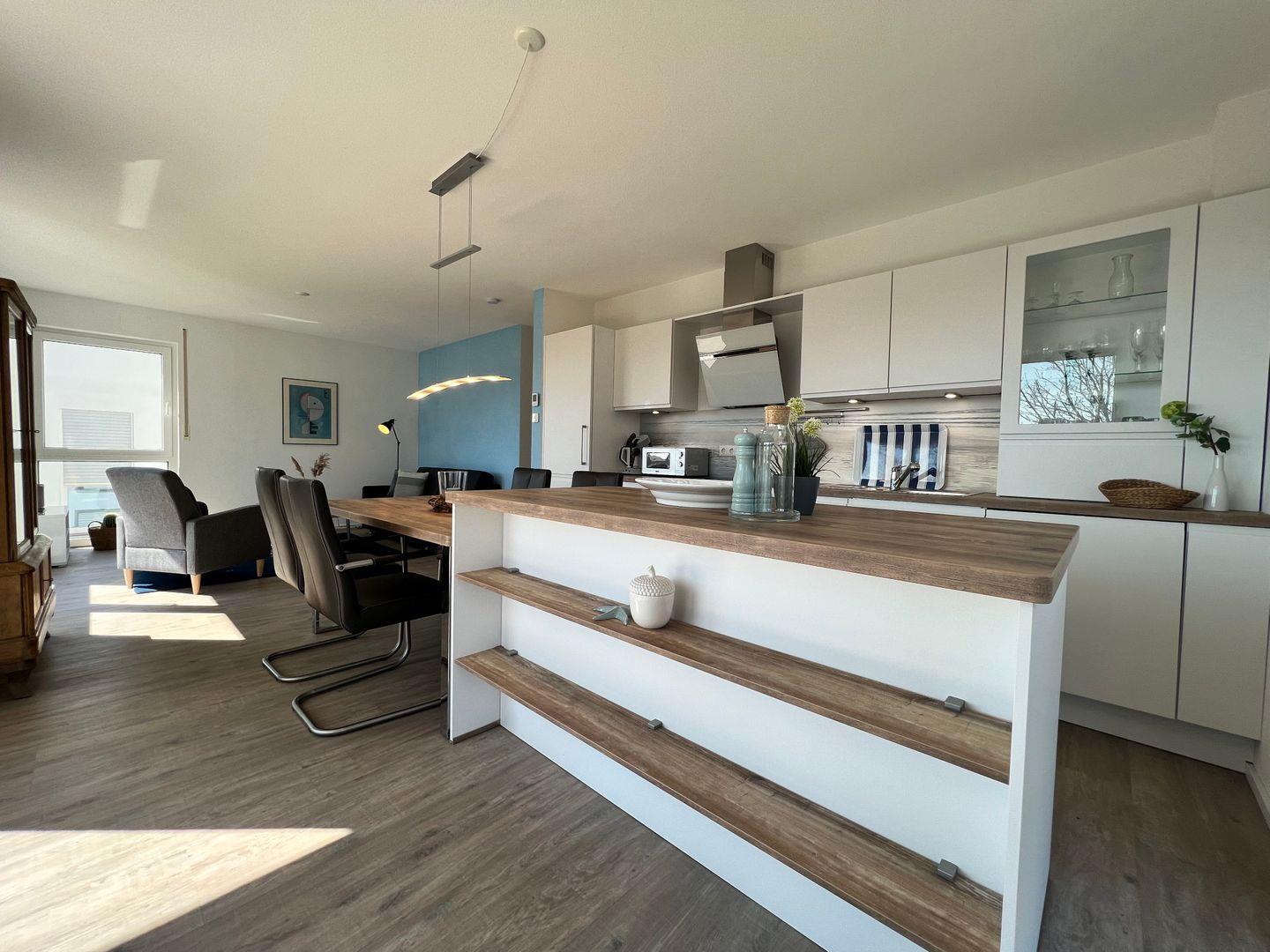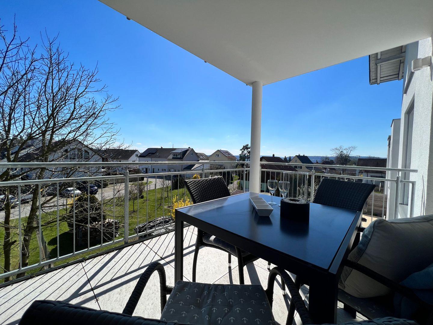 Die ruhig gelegene OG-Ferienwohnung bietet auf ca. 100 qm Platz für 2-6 Personen. Ein heller, freundlicher Flur mit Garderobe - ein geräumiger Wohn- und Essbereich mit Zugang zum sonnigen Balkon - eine offen gestaltete Küche mit Kücheninsel - ein modernes Badezimmer mit bodentiefer Dusche, Badewanne, WC und Waschtisch - zwei gemütliche Schlafzimmer mit Boxspringbetten - in dieser Ferienwohnung verbringen Sie einen erholsamen Urlaub am Bodensee.