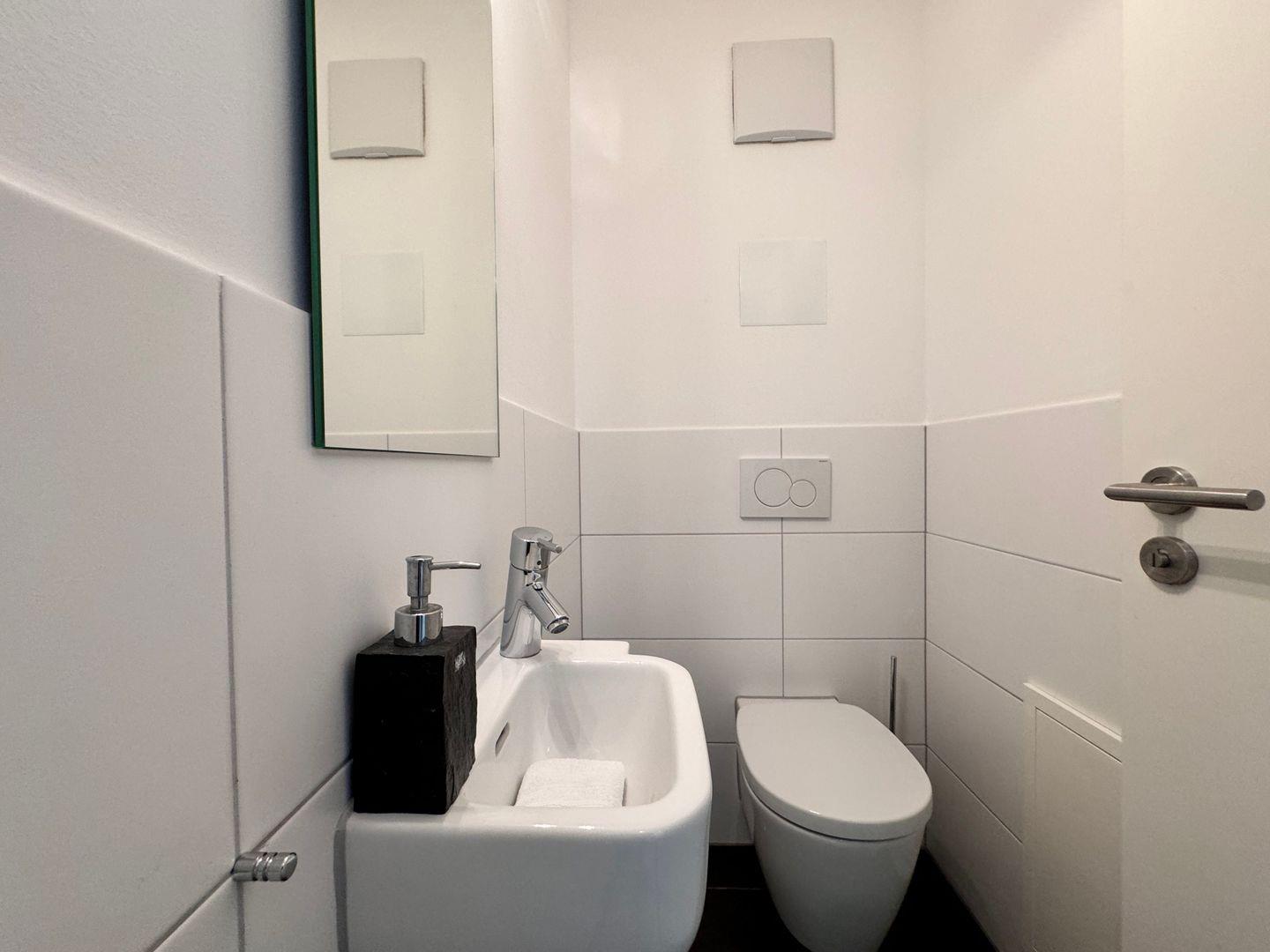 Im modernen Naturstein-Badezimmer finden Sie eine großzügige, bodenebene Regendusche, eine entspannende Badewanne, einen beleuchteten Waschtisch mit Ablagefläche sowie ein WC. Ein zusätzliches, separates Gäste-WC erhöht den Komfort.