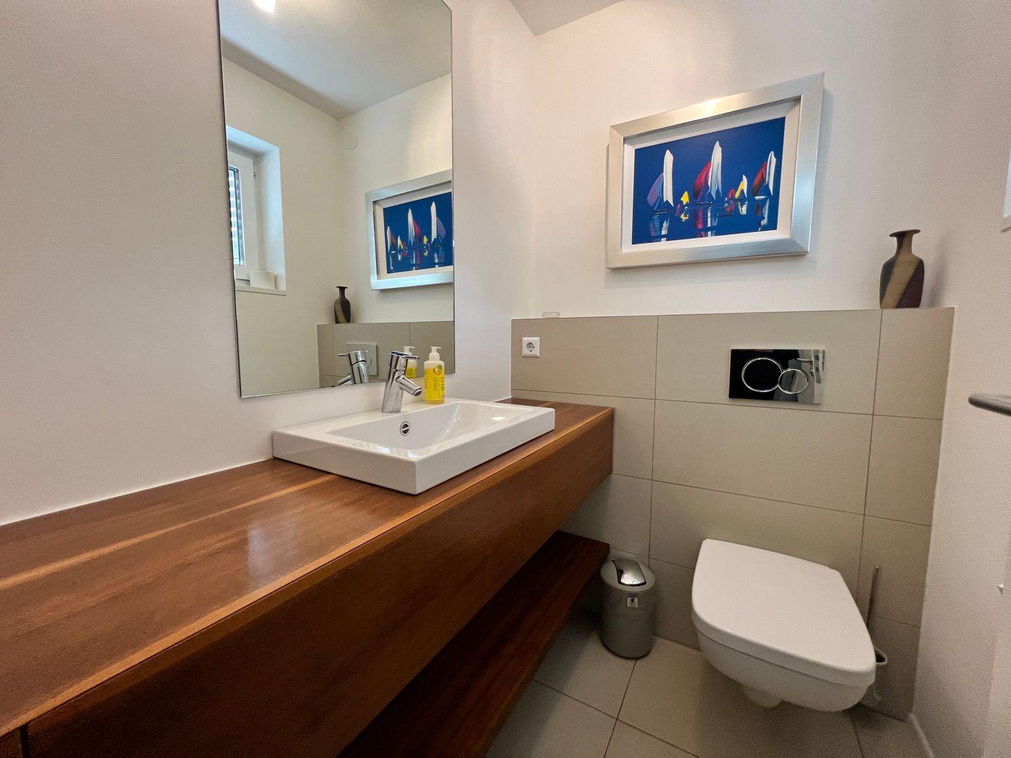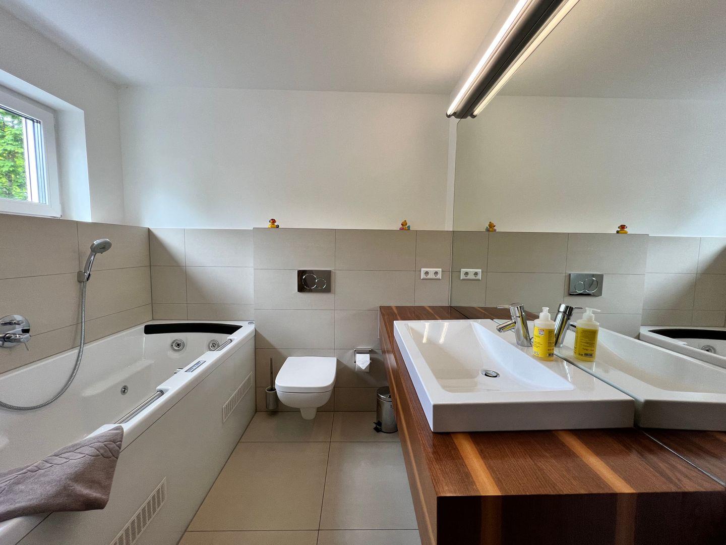 Drei Schlafzimmer mit hochwertigen Doppelbetten (180x200 cm) und geräumigen Kleiderschränken bieten besten Schlafkomfort. Das Badezimmer verfügt über einen Whirlpool und eine begehbare Dusche. Ein zusätzliches Gäste-WC ist vorhanden.