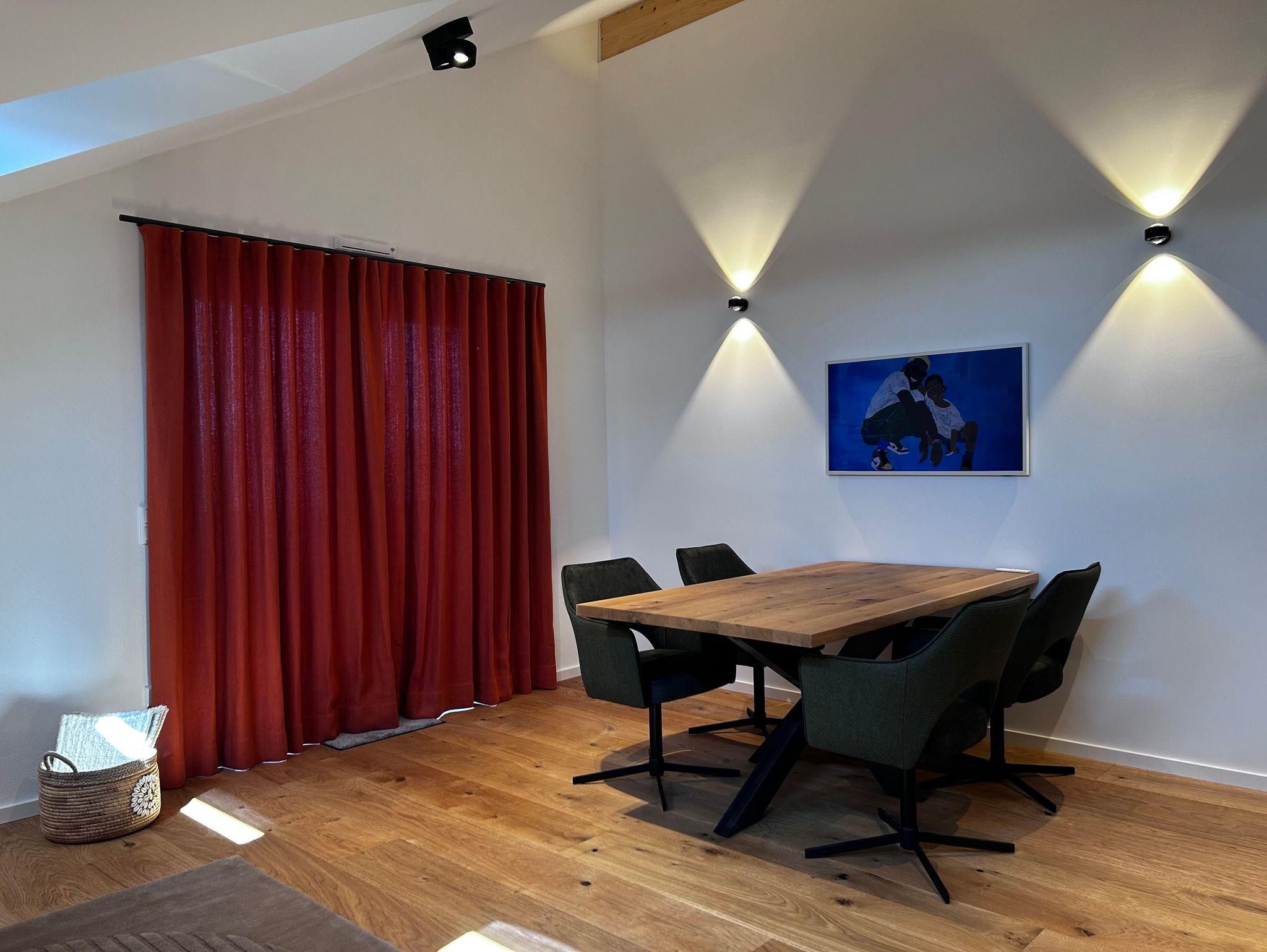 Hier ist nichts dem Zufall überlassen: Edler Parkettboden, maßgefertigte Schreinerküche, moderne Designerleuchten und fein ausgewählte Textilien schaffen eine Wohnatmosphäre, die sowohl puristisch als auch gemütlich ist. Ob am schönen Holz-Esstisch unter der offenen Dacharchitektur oder am Sommerabend auf dem Balkon – hier fühlst du dich sofort wie zuhause (nur besser).