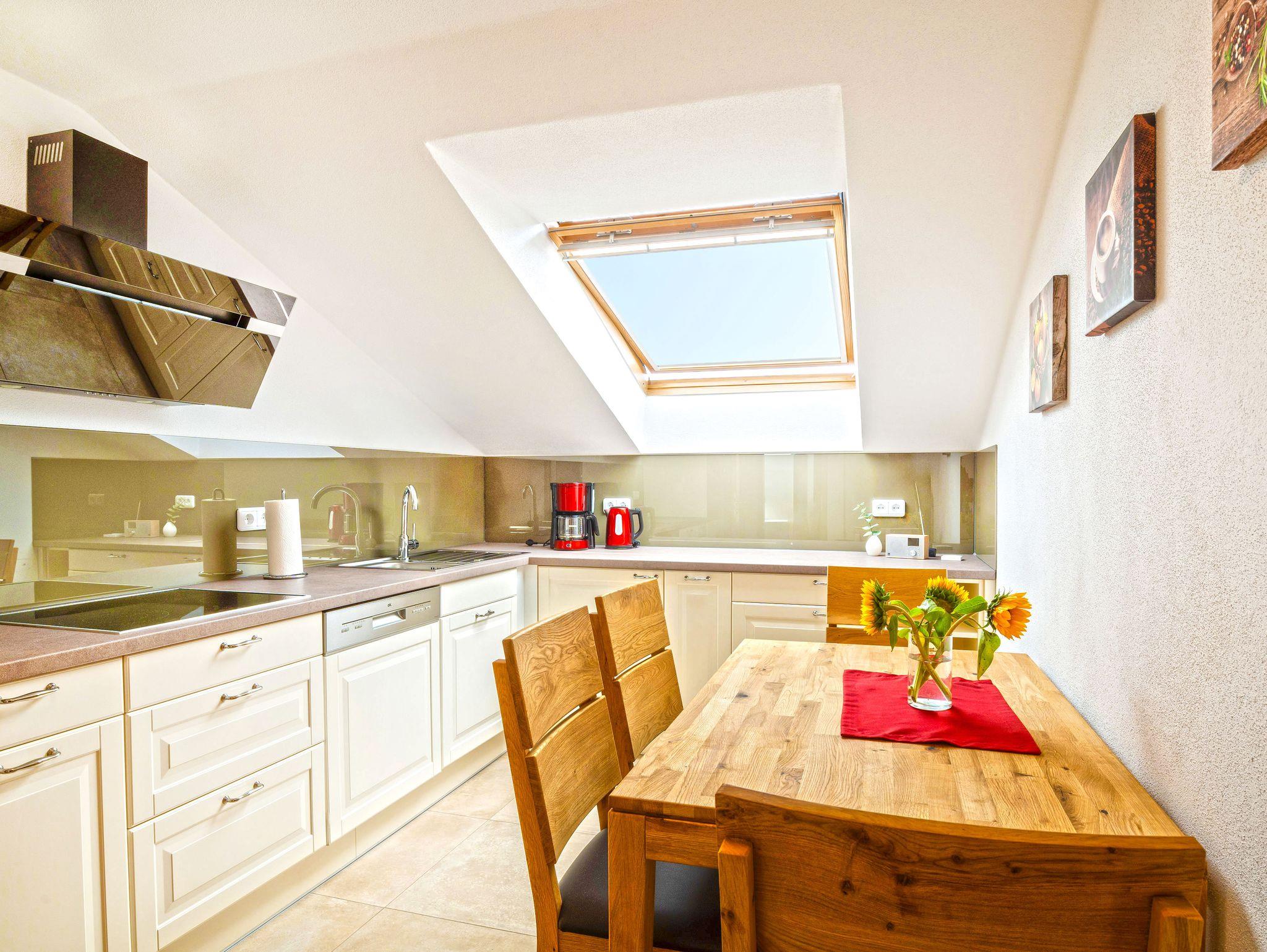 Unsere Ferienwohnung wurde komplett energetisch saniert und befindet sich im 1. Obergeschoss. Hochwertig und komfortabel ausgestattet mit modernen Einrichtung. Mit 100m² Wohnfläche bietet sie viel Platz für 1-4 Personen. Kinder sind bei uns sehr willkommen (Babybett und Hochstuhl kostenlos). Fußbodenheizung im gesamten Obergeschoß. Hand- und Duschtücher stehen für Sie zur Verfügung.