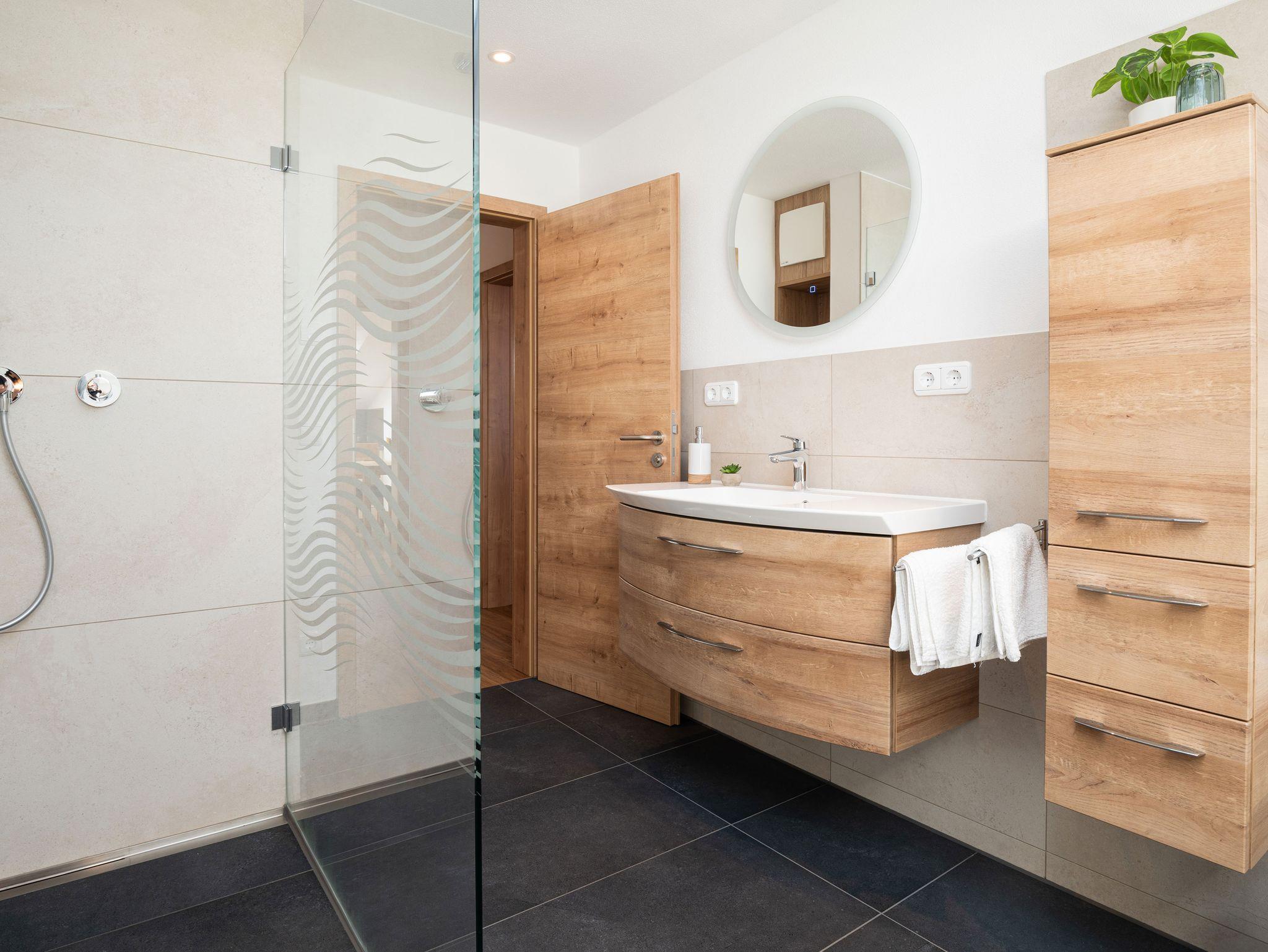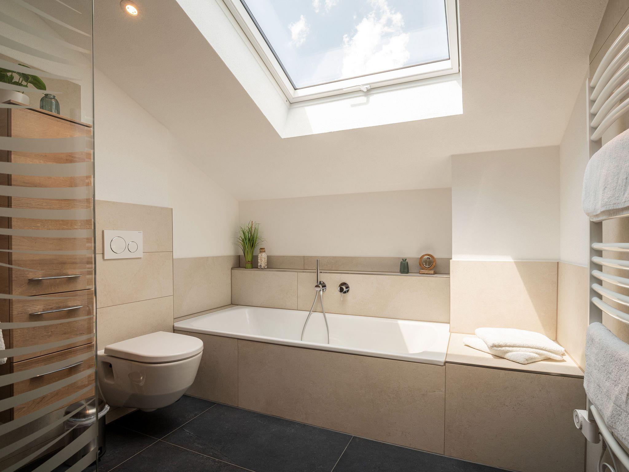 Bad: Badewanne, ebenerdige Dusche mit Glaswand, elektrischer Handtuchtrockner, Fön, Flüssigseife, Kosmetiktücher, LED Spiegel, Sitzplatz, Toilettenpapier, Wandheizung, WC, Waschtisch.