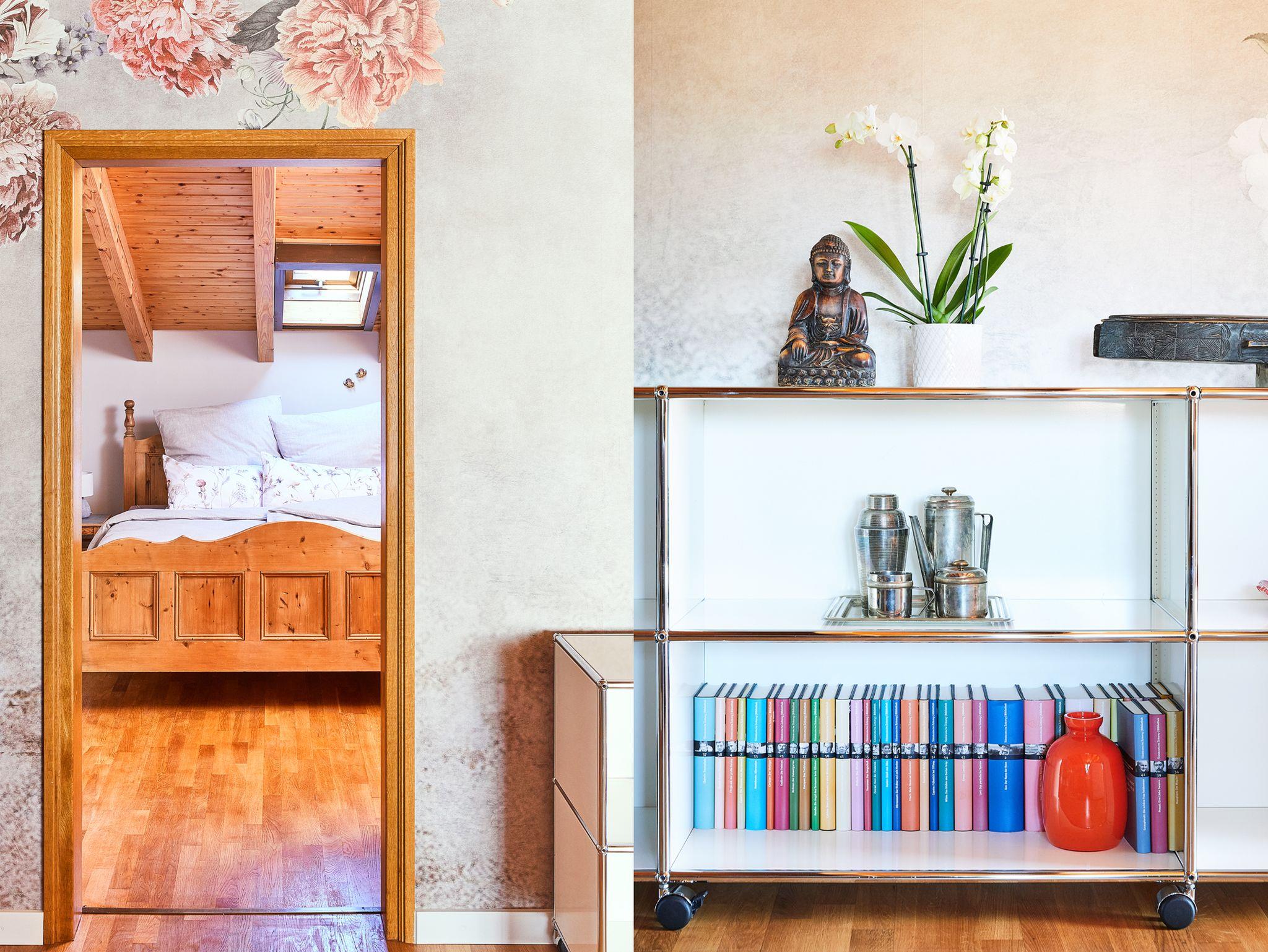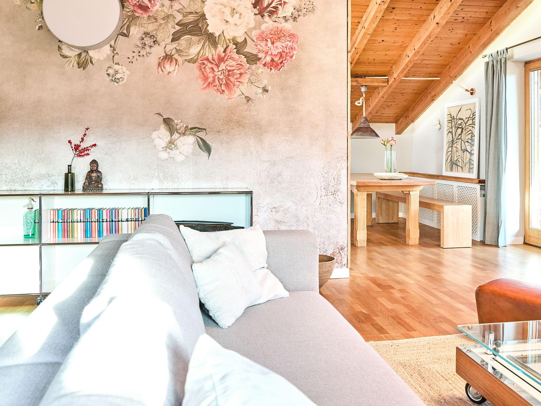 Der großzügige Wohnraum mit bequemen Sofa-Chaiselounge-Kombination und Leseecke wird durch die außergewöhnliche Pfingstrosen-Tapete stilvoll abrundet. Das Regal mit der kleinen Bibliothek aus Büchern und Magazinen lädt zum Stöbern ein.