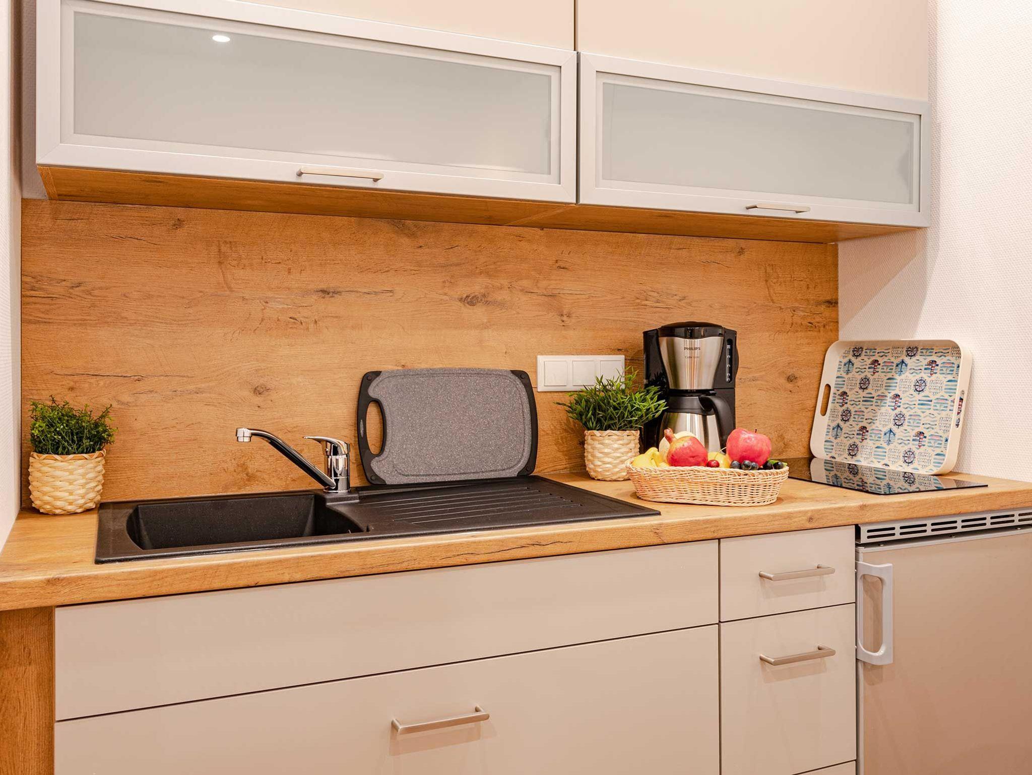 - Essplatz, Doppelbett (1,80m breit), Kleiderschrank, Flachbild-TV, Pantryküche (Kühlschrank, 2 Kochplatten, Spüle) mit Geschirr, Kaffeemaschine, Wasserkocher, Toaster