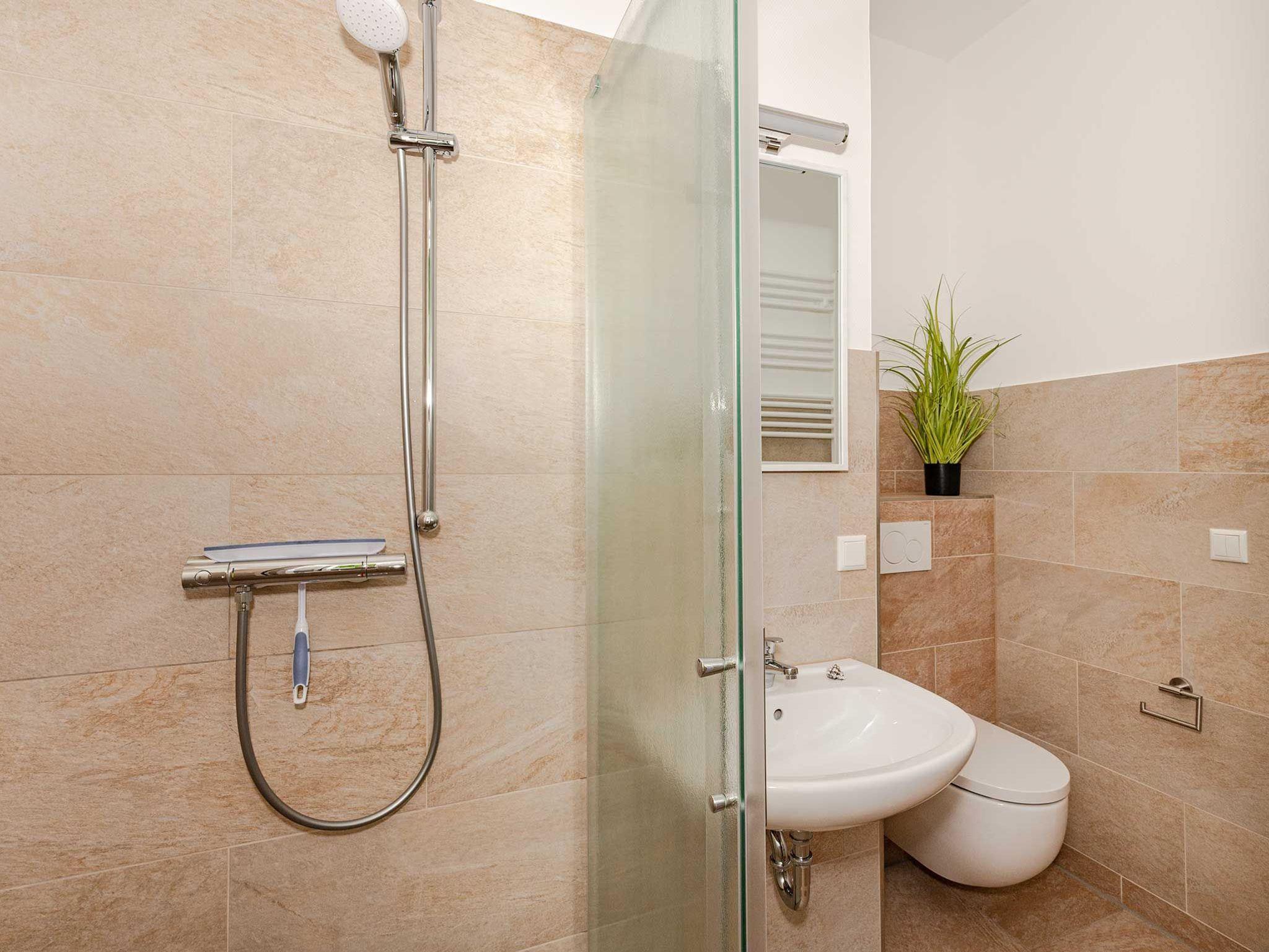 Sie besteht aus einem kombinierten Wohn-/Schlafraum mit integrierter Küchenzeile und einem Bad mit Dusche/WC.