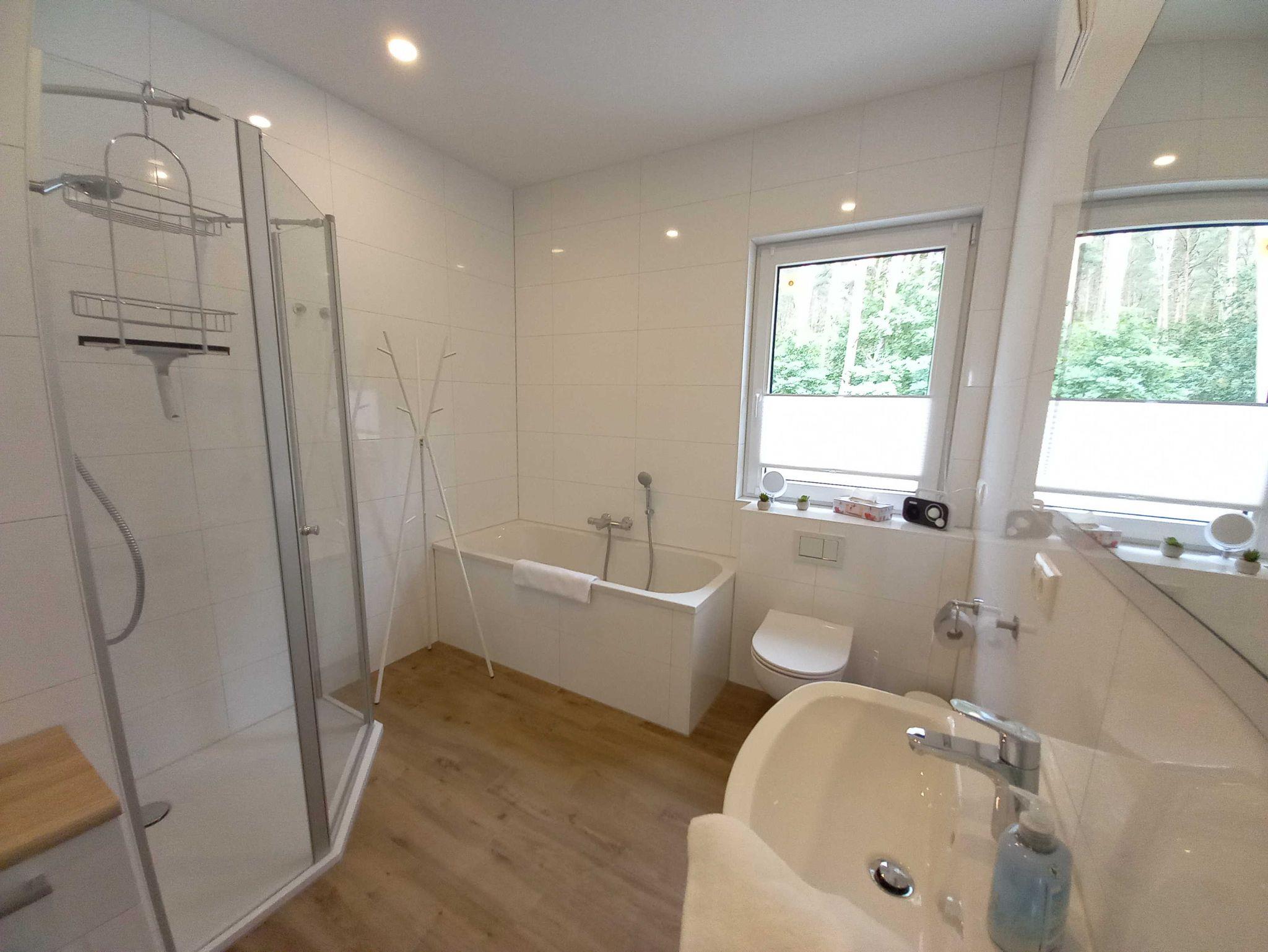 Moderne Ausstattung des gesamten Hauses mit Flur, zwei Schlafzimmern, zwei Bädern, einer Küche, einem Wohnzimmer, großer Terrasse, eigenem Garten, Gartenhaus und Abstellraum mit Waschmaschine