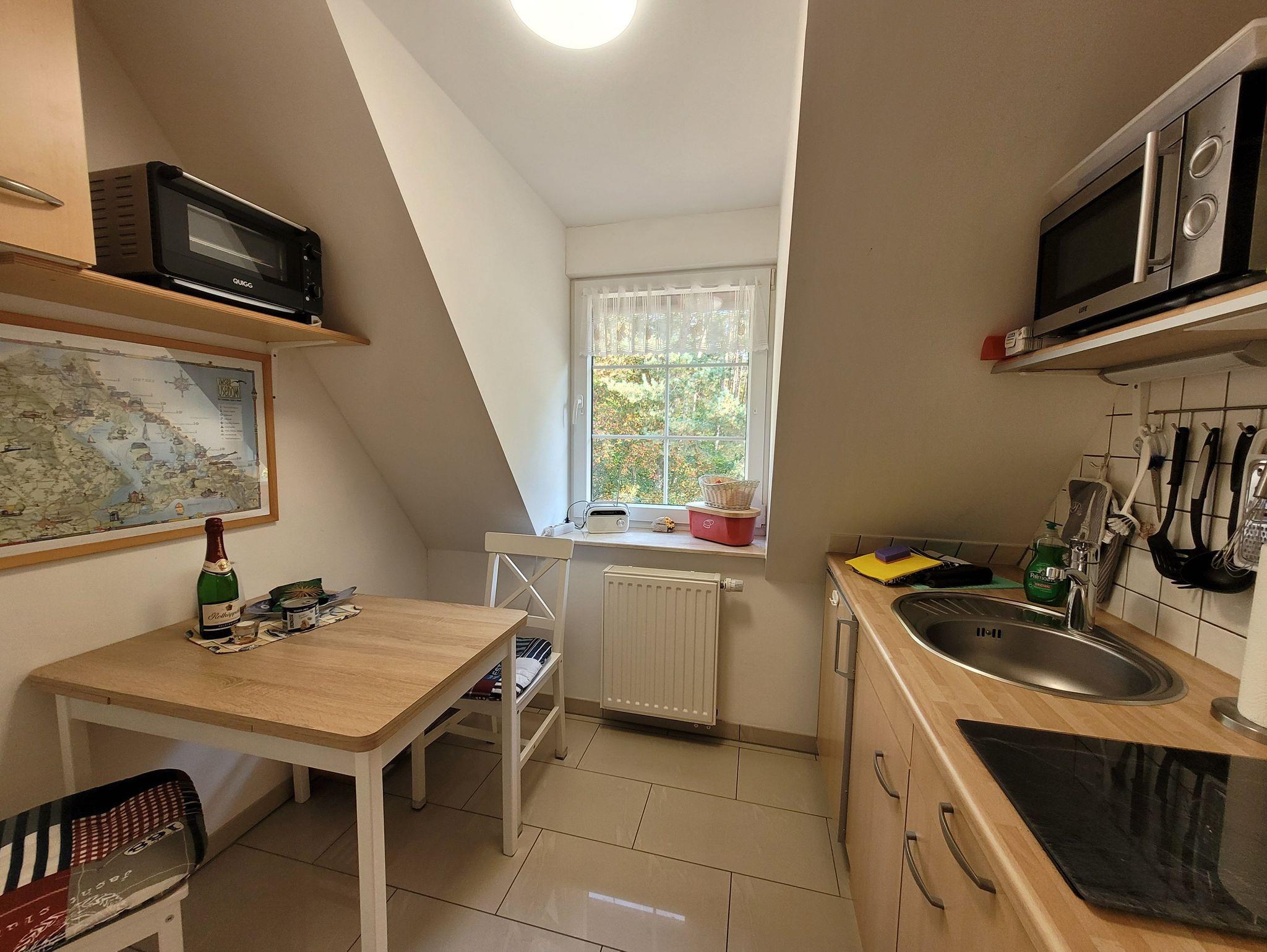 Die Ferienwohnung befindet sich im Obergeschoss des Hauses. Sie hat einen kleinen Flur, ein großes Bad, ein Wohnzimmer, eine kleine separate Küche mit Waldblick und ein Schlafzimmer. Über das Wohnzimmer gelangt man auf den Balkon mit herrlichem Blick auf das Hinterland von Ückeritz und auf das Achterwasser. Bei Bedarf können im Wohnzimmer zwei weitere Personen die Couch mit Schlaffunktion nutzen.