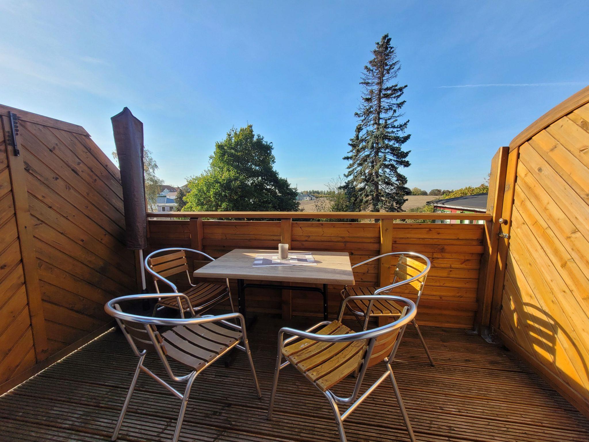 Über das Wohnzimmer gelangt man auf den Balkon mit herrlichem Blick auf das Hinterland von Ückeritz und auf das Achterwasser.