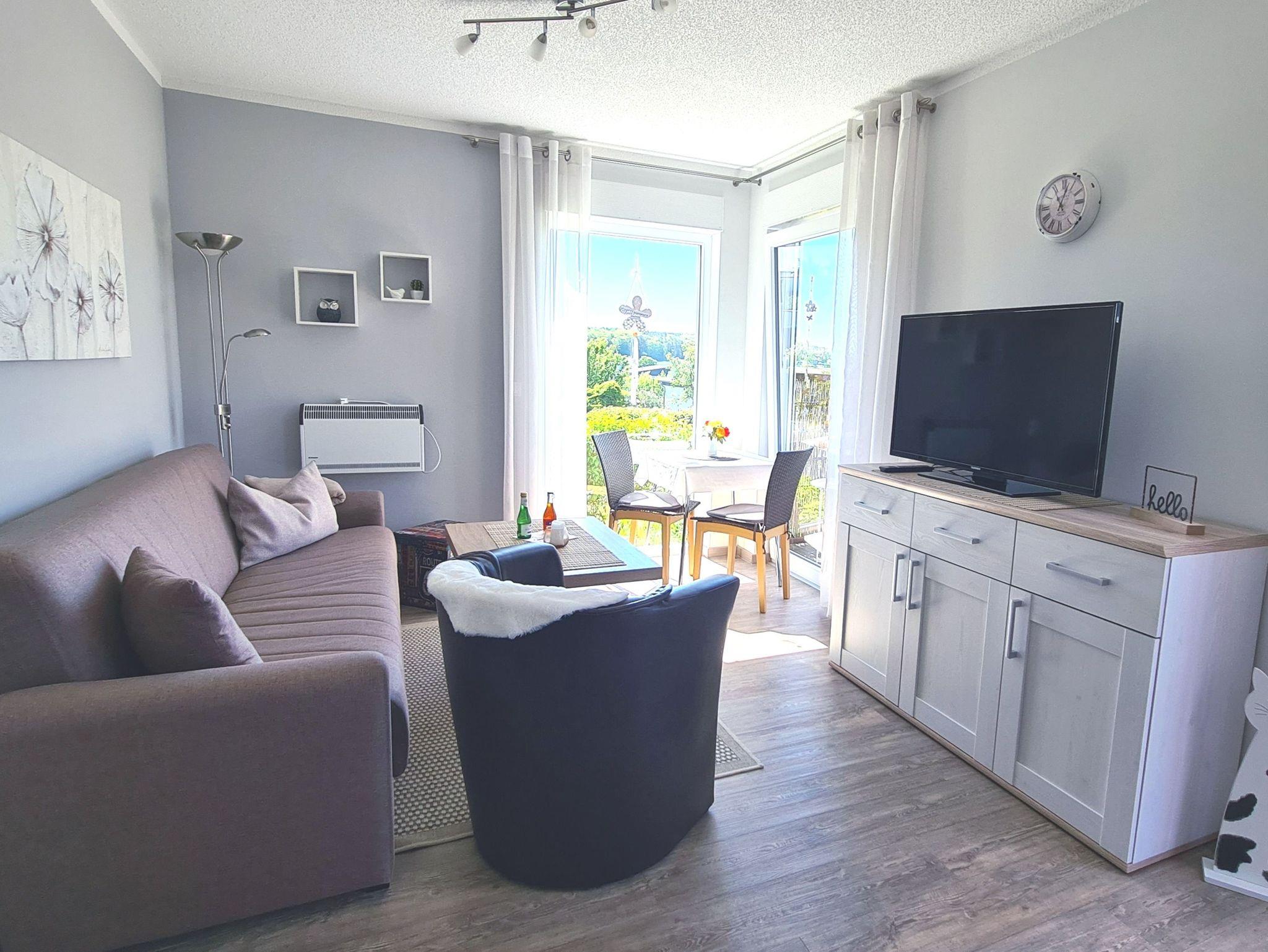 Von der möblierten Terrasse kann man das nur wenige Gehminuten entfernte Achterwasser sehen.