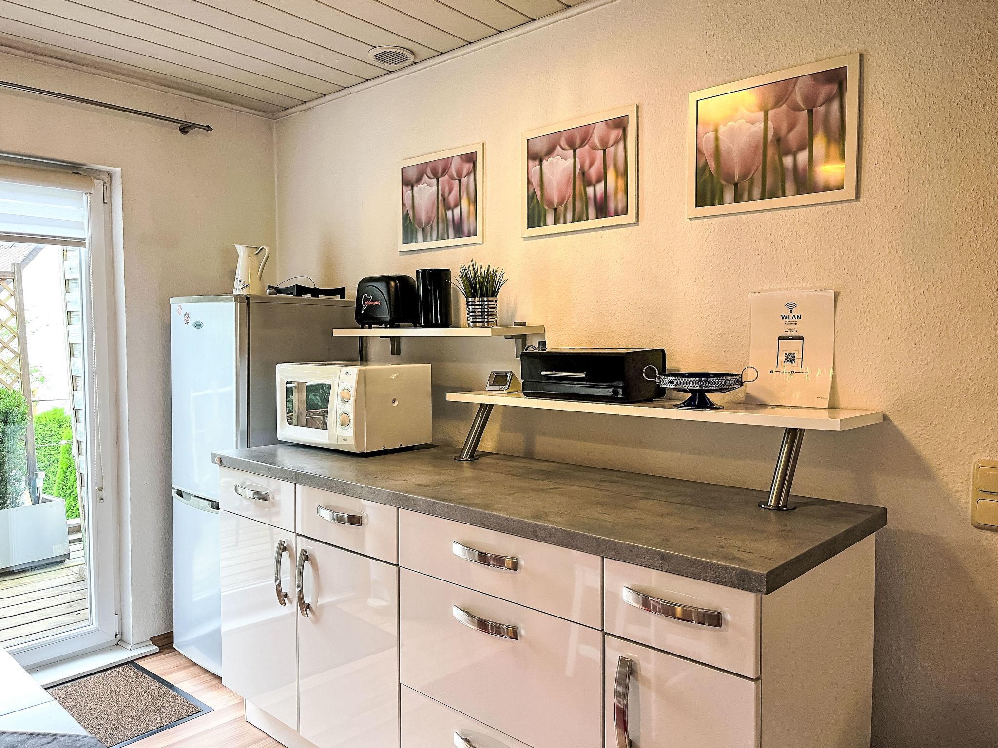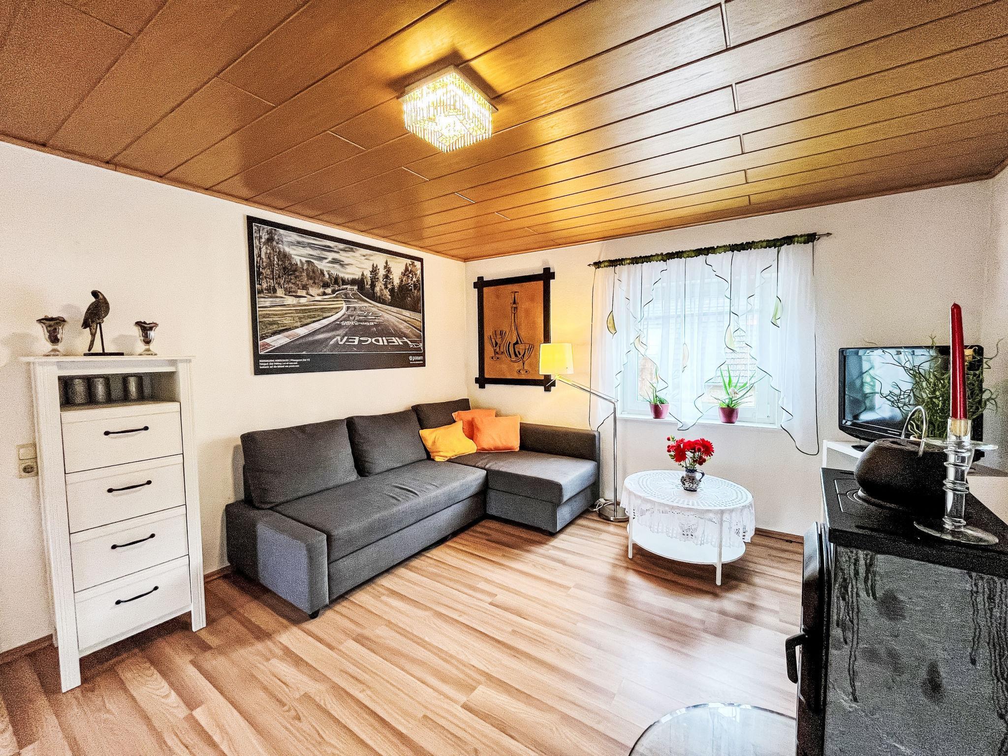 "Ferienwohnung Renata 1 nahe Nürburgring", 3-room apartment 60 m2, on the upper floor. Object suitable for 5 adults + 2 children. Simple and cosy furnishings: upper floor: living/dining room with 1 double sofabed (140 cm, length 200 cm), Scandinavian wood stove, dining table and TV (flat screen). Exit to the balcony. 1 double bedroom with 1 double bed (180 cm, length 200 cm). 1 small room with 1 french bed (100 cm, length 200 cm). 1 room with 2 beds (80 cm, length 200 cm). Kitchen-/living room (oven, dishwasher, 4 ceramic glass hob hotplates, toaster, kettle, microwave, freezer, electric coffee machine). Shower/WC. Heating. Small balcony. Balcony furniture. Facilities: Internet (WiFi, free). Please note: non-smokers only. Smoke alarm.