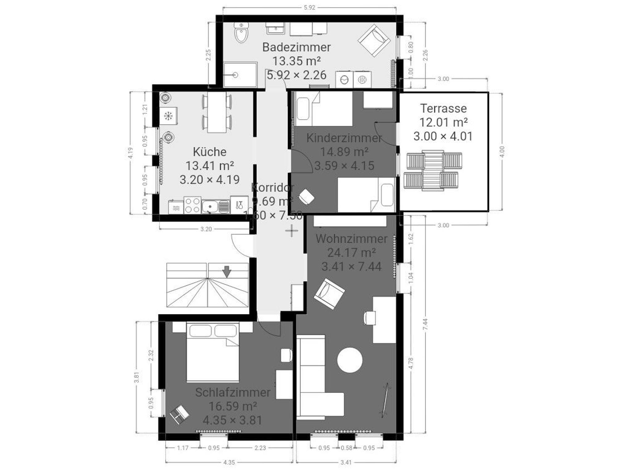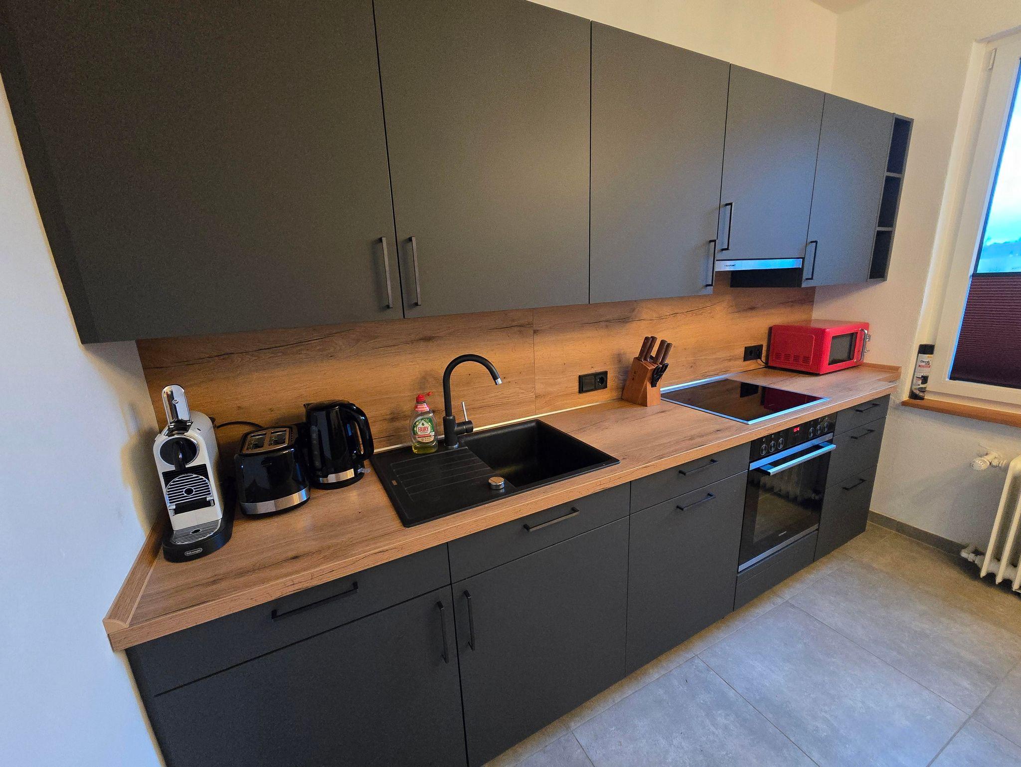 Die vollausgestatte moderne Küche (Induktionskochfeld, Ofen, Geschirrspüler, Microwelle, Kühlschrank mit Gefrierfach, etc.) ist groß genug, um mit der Familie nicht nur Essen zuzubereiten, sondern auch gemütlich zu speisen.