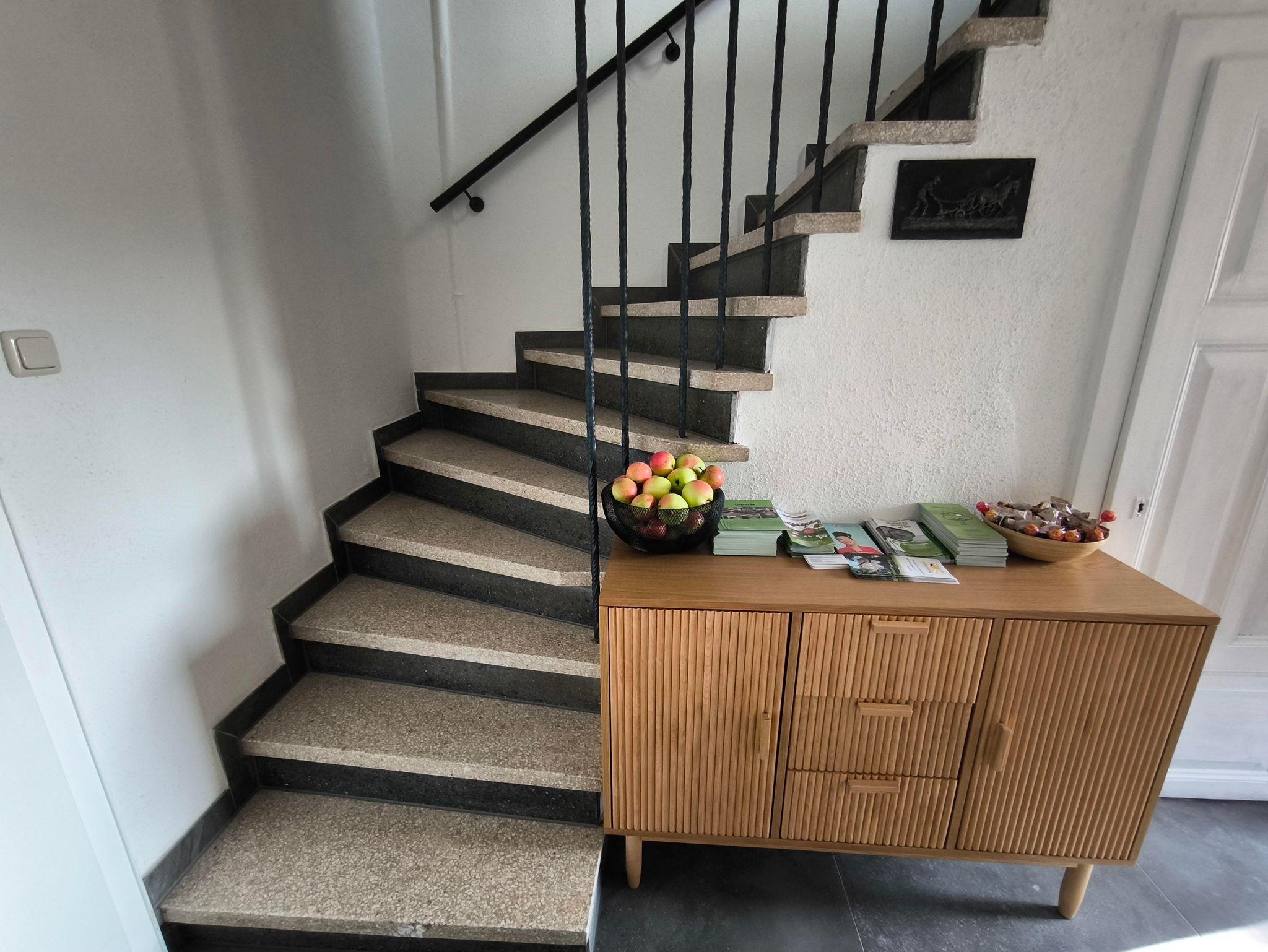 Eine Terrasse und die Nutzung des Gartens runden die Möglichkeiten ab. Je nach Saison darf auf der fußläufig (ca. 500m) zu erreichenden Streuobstwiese (www.obstplus.de) gerne selbst Obst gepflückt werden.