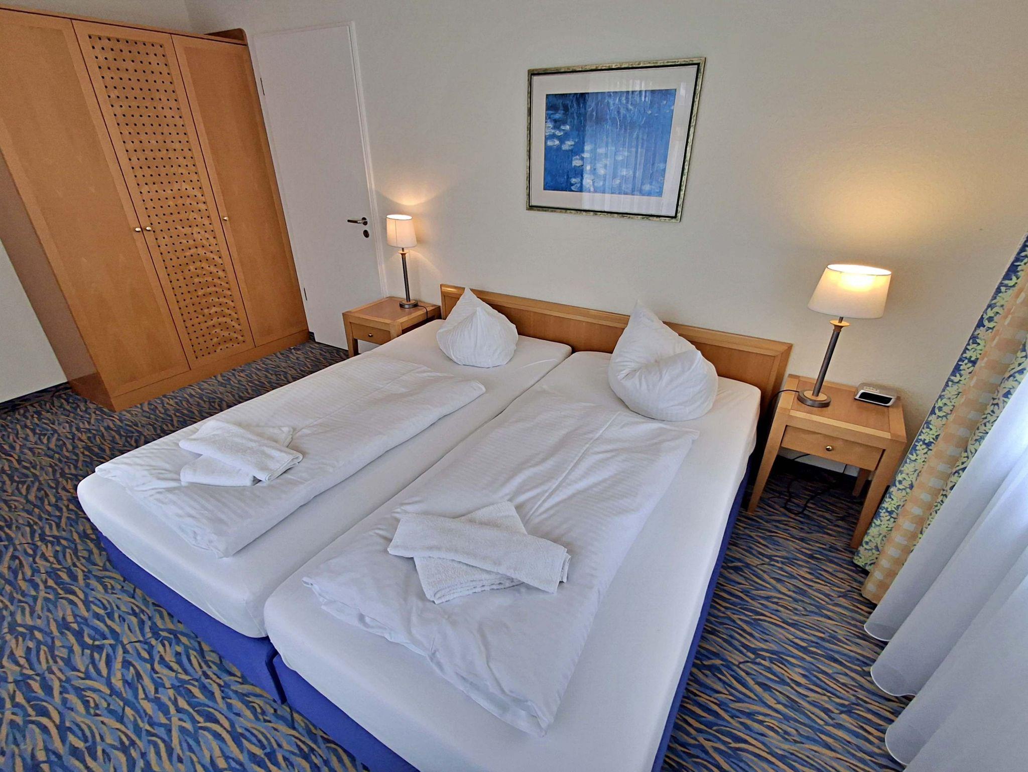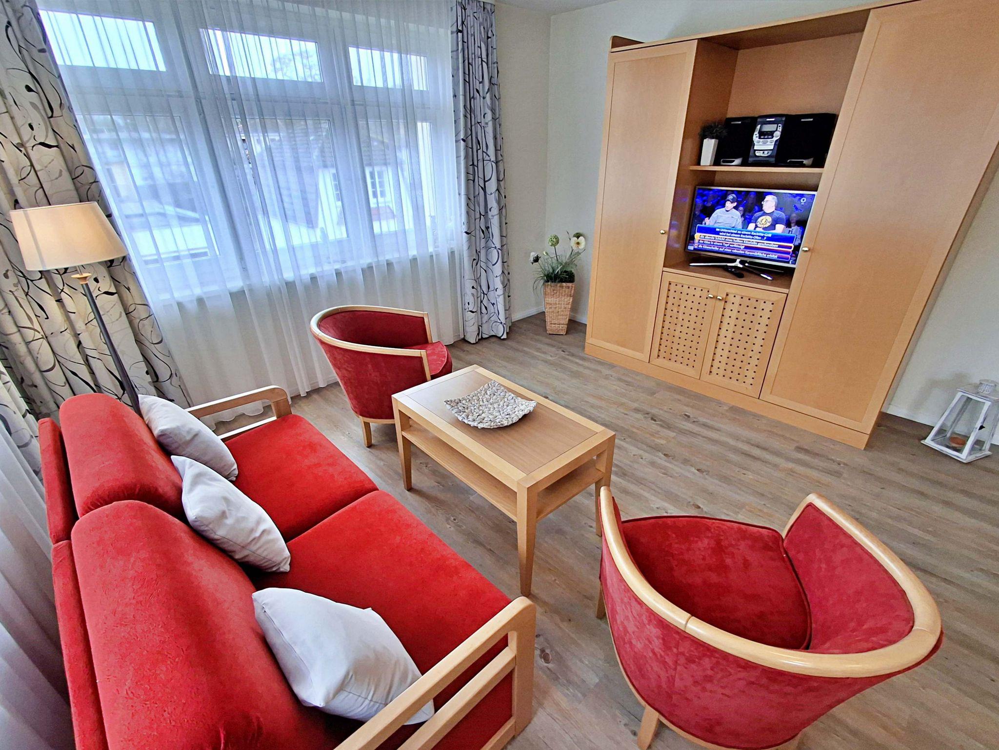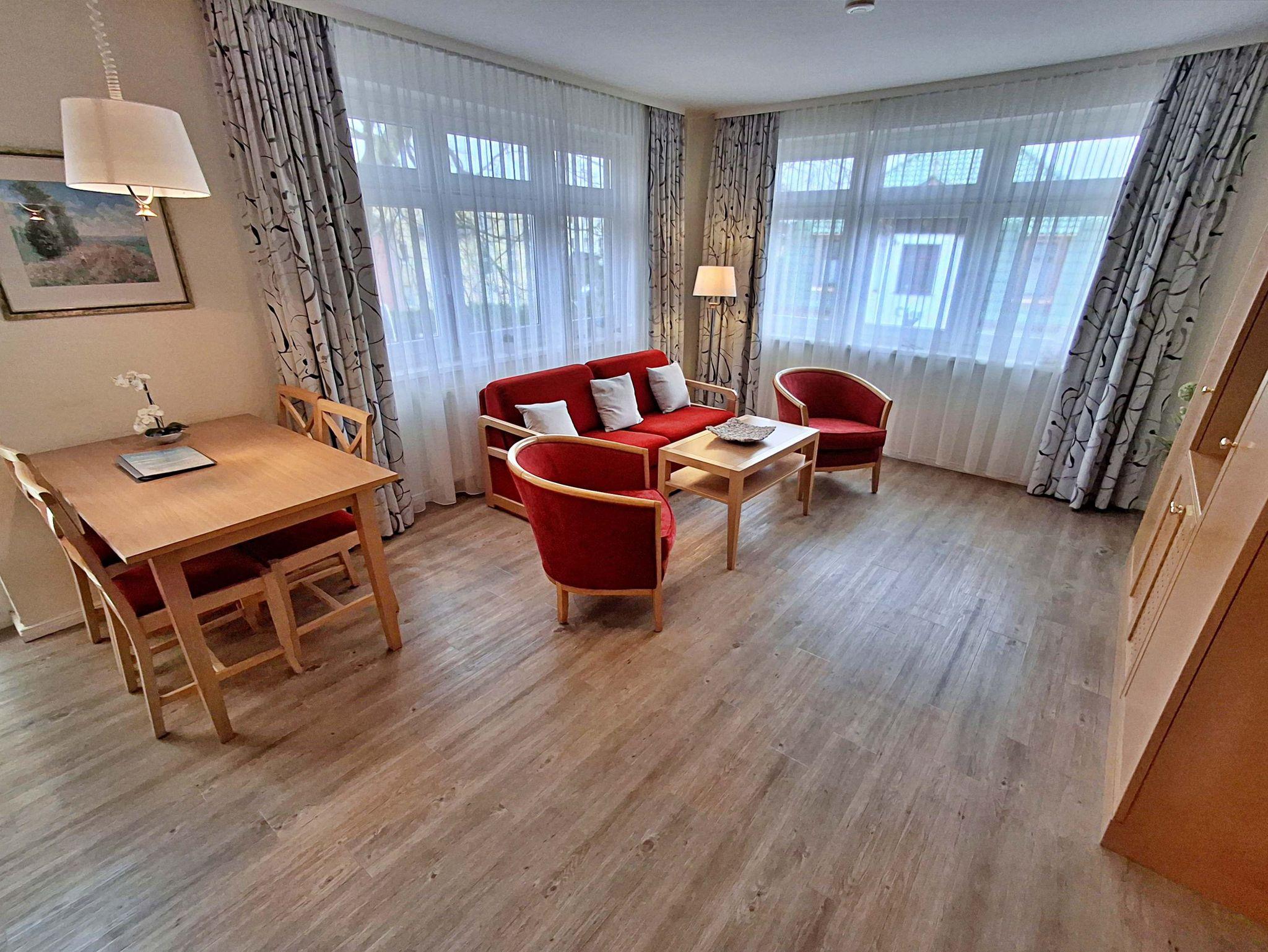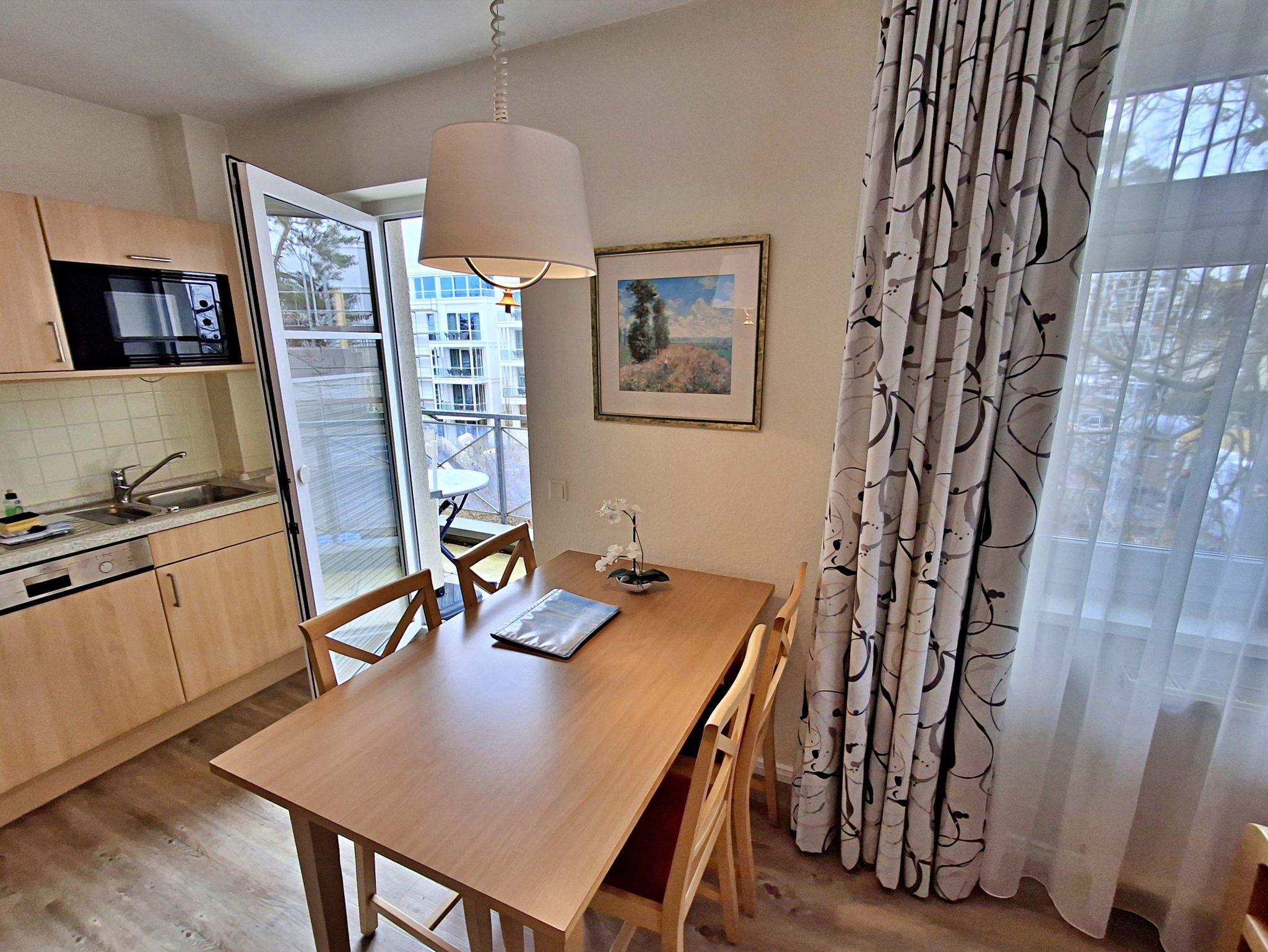 Die 54 qm große 2-Raum-Ferienwohnung befindet sich im zweiten Obergeschoss (Süd-Ostlage) der Appartementanlage und ist für 2 Personen ausgestattet. Die Wohnung verfügt über ein Wohnzimmer mit gemütlichem Sofa, Sessel sowie einer Essecke mit 4 Stühlen. Für die Unterhaltung sorgen ein Flachbild-TV und eine Stereo-Anlage. Die vollständig ausgestattete Küche mit 4-Plattenherd, Backofen, Mikrowelle, Kühlschrank mit Gefrierfach und Spülmaschine lässt keine Wünsche offen. Im Schlafzimmer befindet sich ein Doppelbett und ein geräumiger Kleiderschrank. Das Tageslicht-Bad ist mit Dusche/WC und Haarfön ausgestattet. Ein Balkon lädt zum Sitzen und Verweilen ein. Hier können Sie bei schönem Wetter schon morgens Ihren Kaffee genießen oder den Abend bei einem Glas Wein ausklingen lassen. WLAN steht Ihnen kostenfrei zur Verfügung.