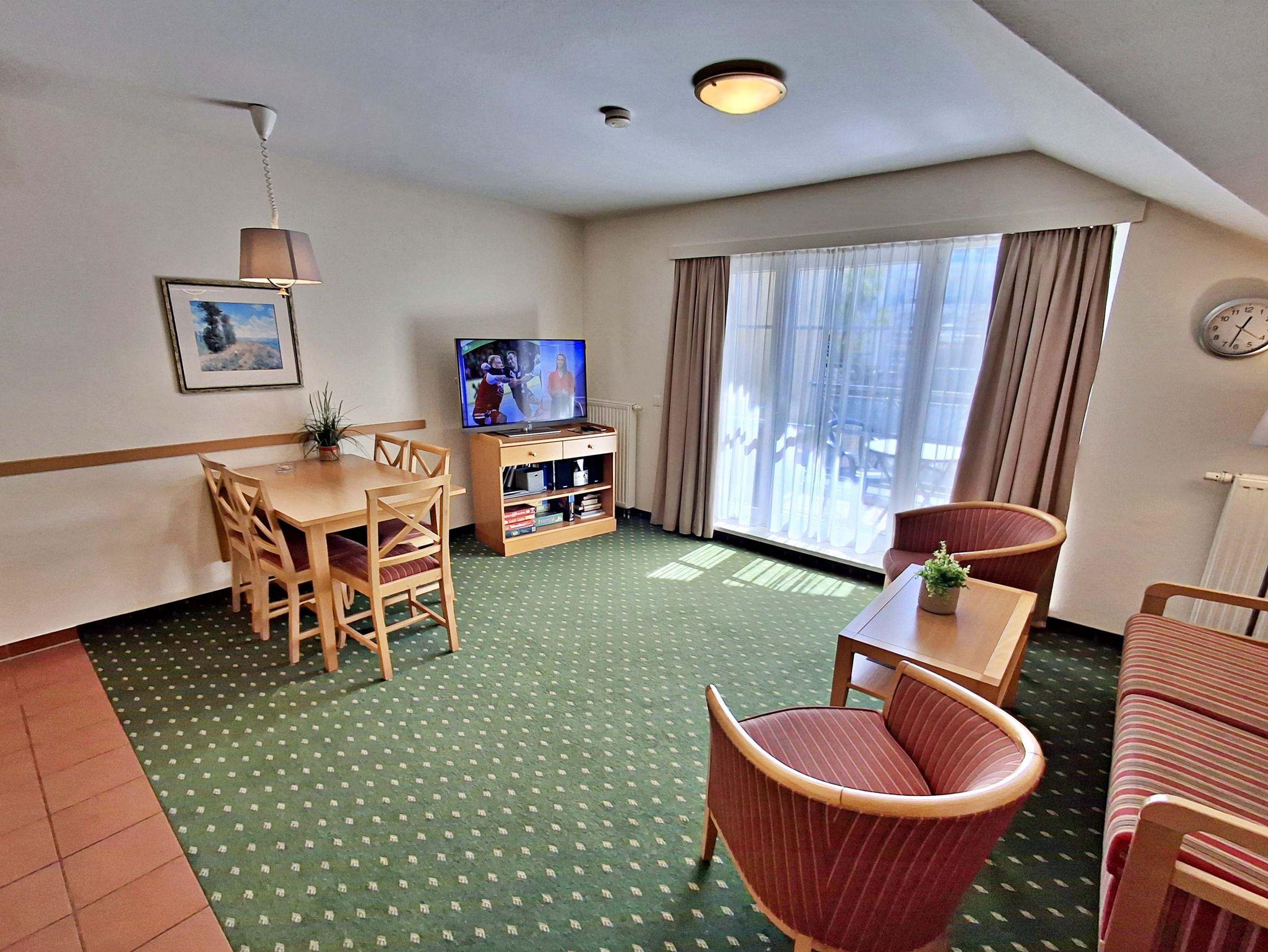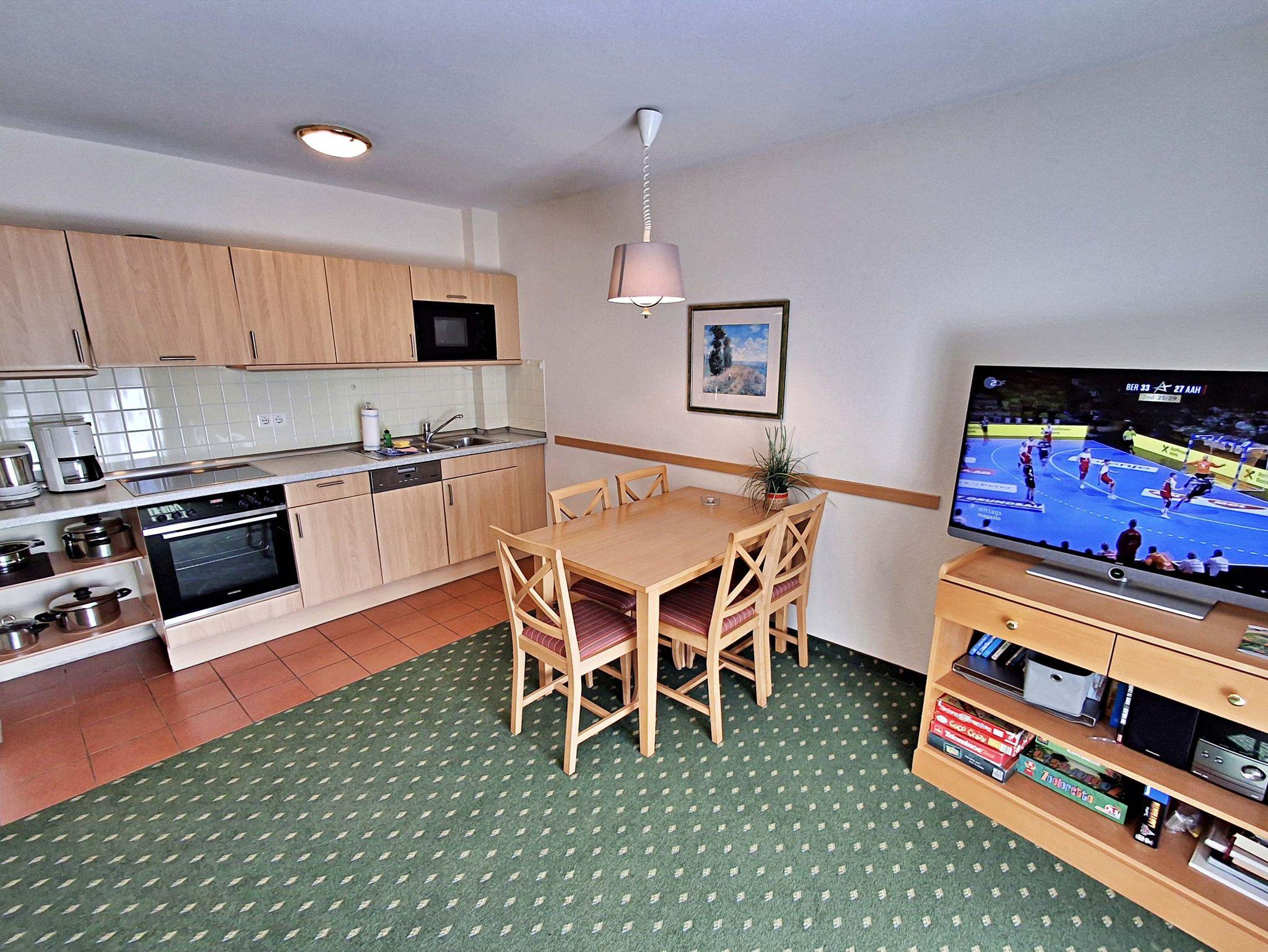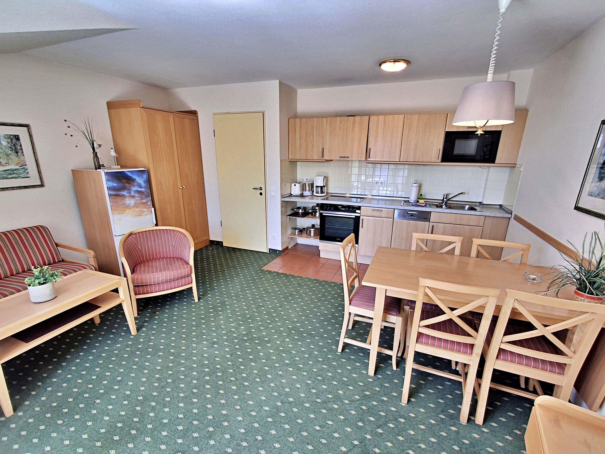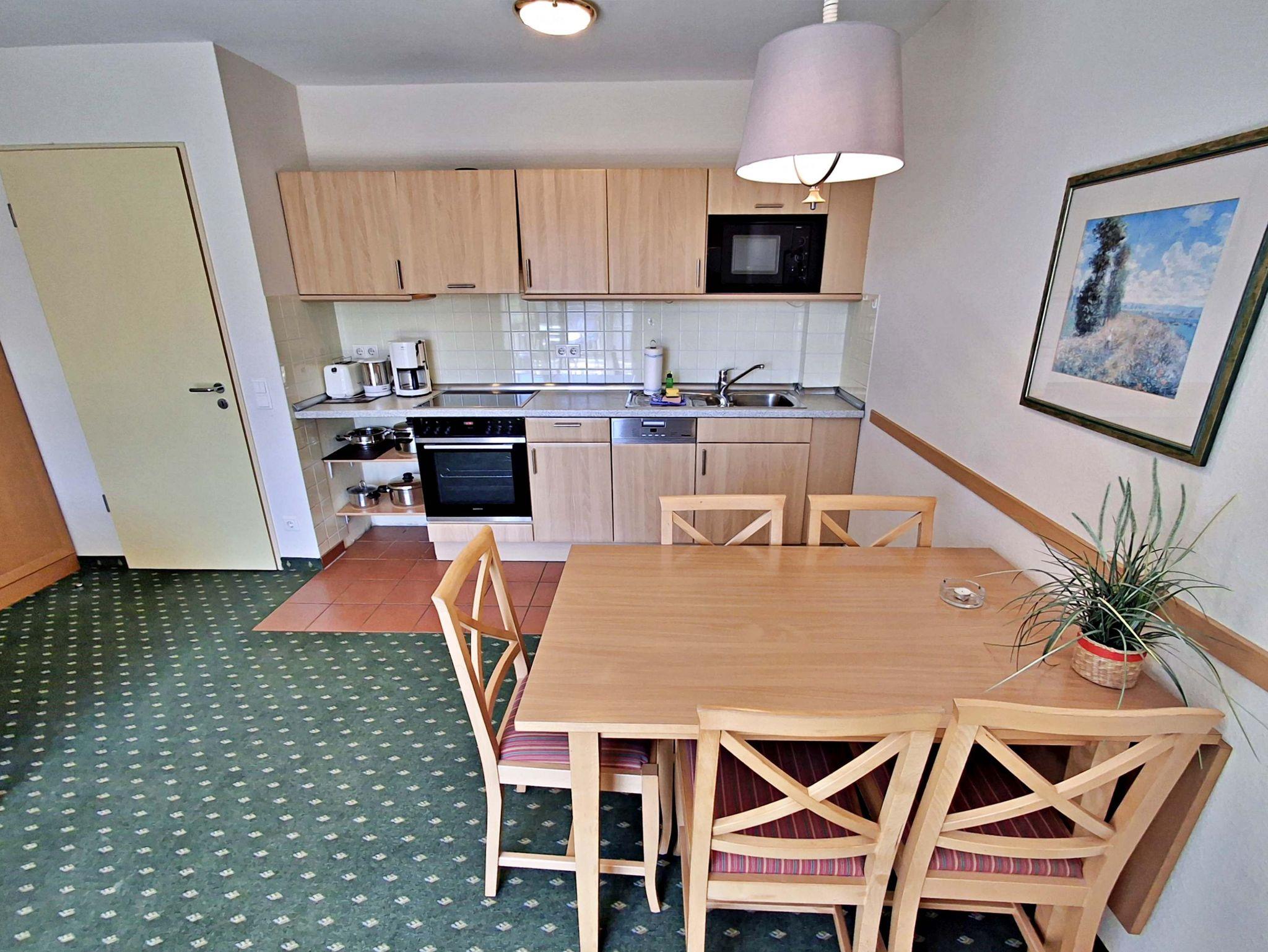 Die 68 qm große 3-Raum-Ferienwohnung (Süd-Ost-Seite) befindet sich im 3. OG der Appartementanlage und ist für 5 Personen (4 Erwachsene und ein Kind bis 10 Jahre) ausgestattet. Der Aufzug fährt bis zum 2. OG. Die Wohnung befindet sich in der 3. Etage. Der Aufzug fährt bis zum 2.OG. Die Wohnung verfügt über ein Wohnzimmer mit Sofa, Sessel sowie Esstisch mit 4 Stühlen. Für die Unterhaltung sorgen ein Flachbild-TV, eine Stereo-Anlage und DVD-Player. Die vollständig ausgestattete Küchenzeile mit Ceranherd, Backofen, Mikrowelle, Spülmaschine und Kühlschrank mit Gefrierfach lässt keine Wünsche offen.Beide Schlafzimmer sind mit Doppelbetten ausgestattet. Das Tageslicht-Bad ist mit Dusche/WC und Haarfön ausgestattet. Eine Loggia lädt zum Sitzen und Verweilen ein und komplettiert die Ausstattung der Wohnung. WLAN steht in der gesamten Wohnung kostenfrei zur Verfügung.
