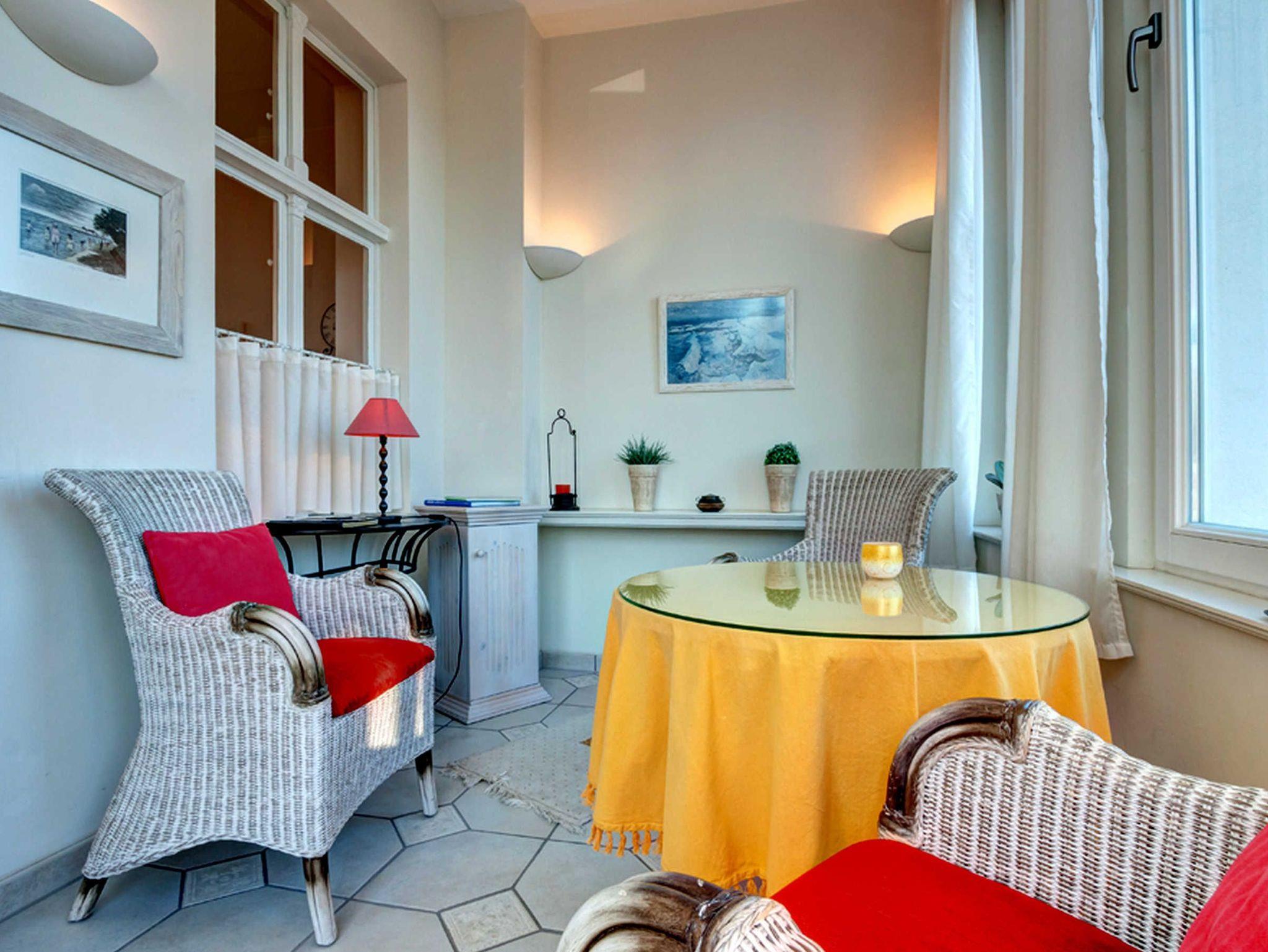 Willkommen in dieser modernen, hellen 2-Raum-Nichtraucher-Ferienwohnung im Erdgeschoss einer sanierten Villa im weißen Landhausstil. Die Wohnküche ist mit einer Couch, einem Tisch und vier Stühlen ausgestattet und bietet Unterhaltung durch einen Flachbild-TV, ein Radio mit CD-Player und einen DVD-Player.