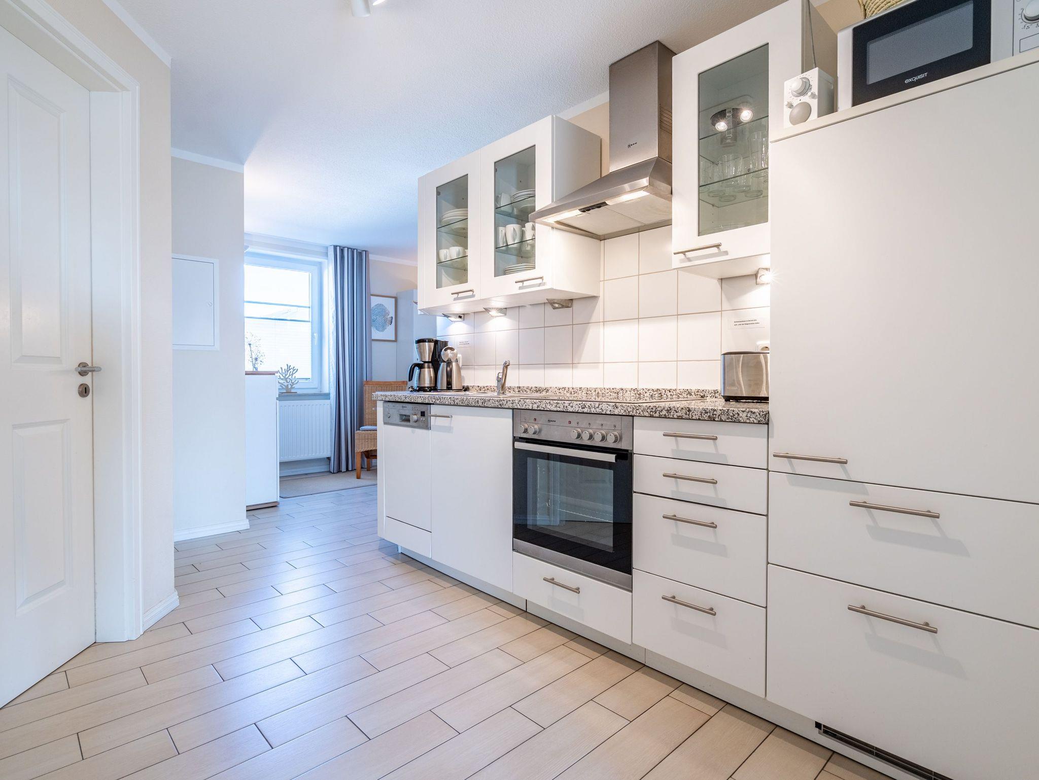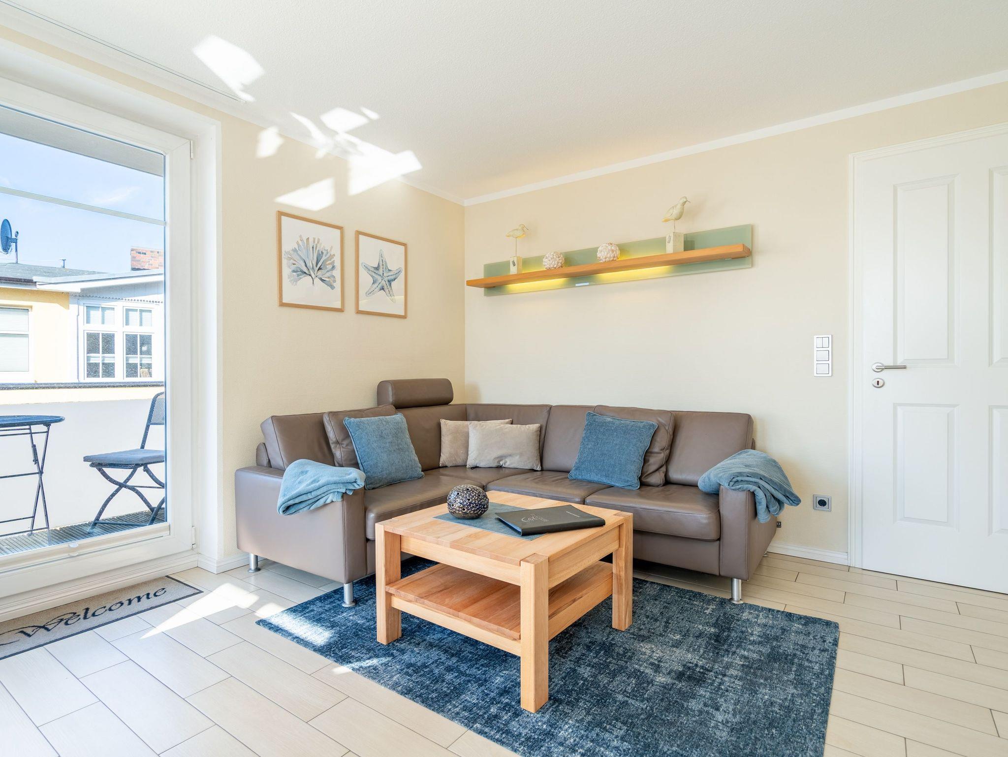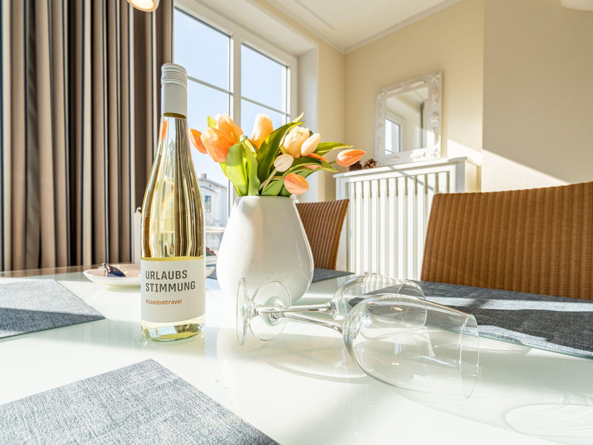 Modern. Lichtdurchflutet. Stilsicher ? so empfängt Sie die Ferienwohnung 5 im 1. Obergeschoss des neuen Hauses. Warme, an Strand und Meer erinnernde Farben, ausgesuchte Materialien und stilvolle Dekorationen verleihen dem komplett mit hellen italienischen Fliesen ausgelegten Appartement Finesse und Leichtigkeit. Der Wohnbereich ist mit einer bequemen Ledercouch und technischen Feinheiten (Flat-TV, Bose Sound Speaker 300 und Küchenradio) ausgestattet, von hier aus haben Sie Zugang zum sonnigen Südbalkon. Vom schönen Essplatz am Fenster genießen Sie den Ausblick auf die renovierten Villen in der Vinetastraße. Eine offene, komplett ausgestattete Küche mit Granitarbeitsplatte, ein gemütliches Schlafzimmer mit Doppelbett (1,80 m x 2 m) und Flat-TV sowie ein großzügiges Duschbad mit Fenster ergänzen die Wohnung und bieten Platz für 2 Personen. Als kleines Sommer-Highlight stellen wir Ihnen in den warmen Monaten (je nach Witterung) einen Strandkorb am Strand zur Verfügung ? genießen Sie die Auszeit! Das WLAN-Netz ist kostenfrei nutzbar. Zur Wohnung gehört außerdem der Tiefgaragenstellplatz Nr. 5 ? bequem, sicher und direkt am Haus. Ankommen, abschalten, Urlaub genießen.