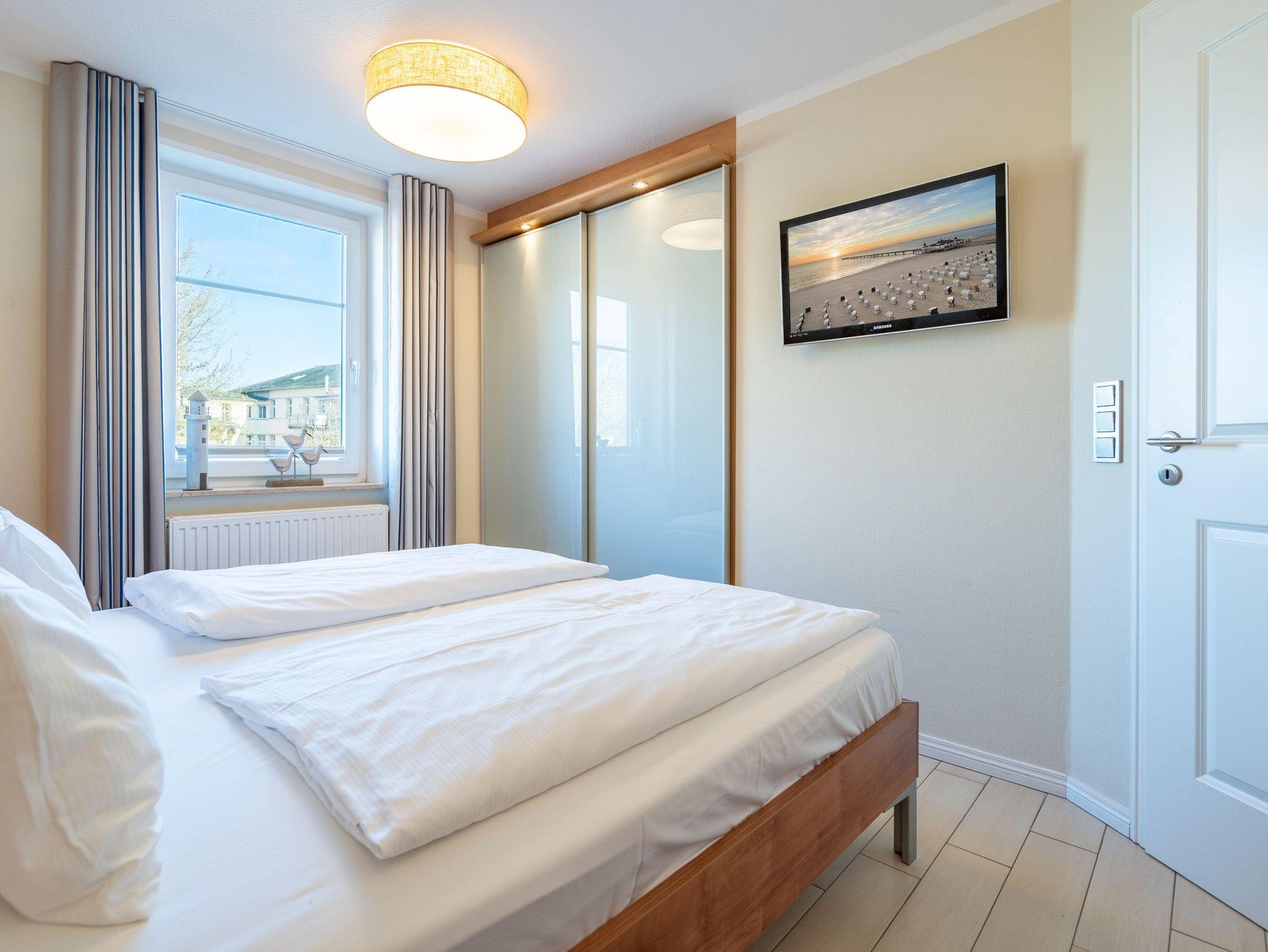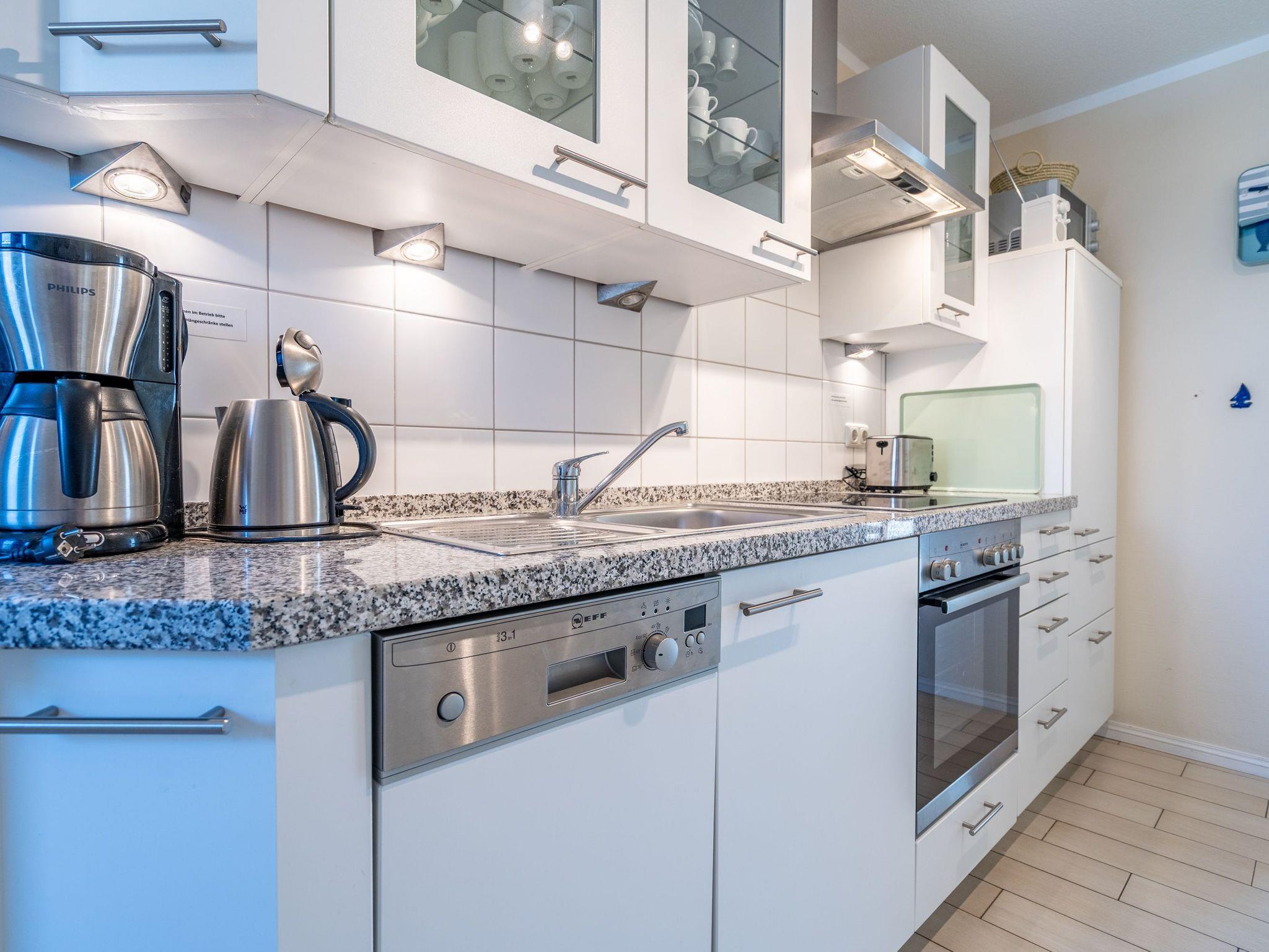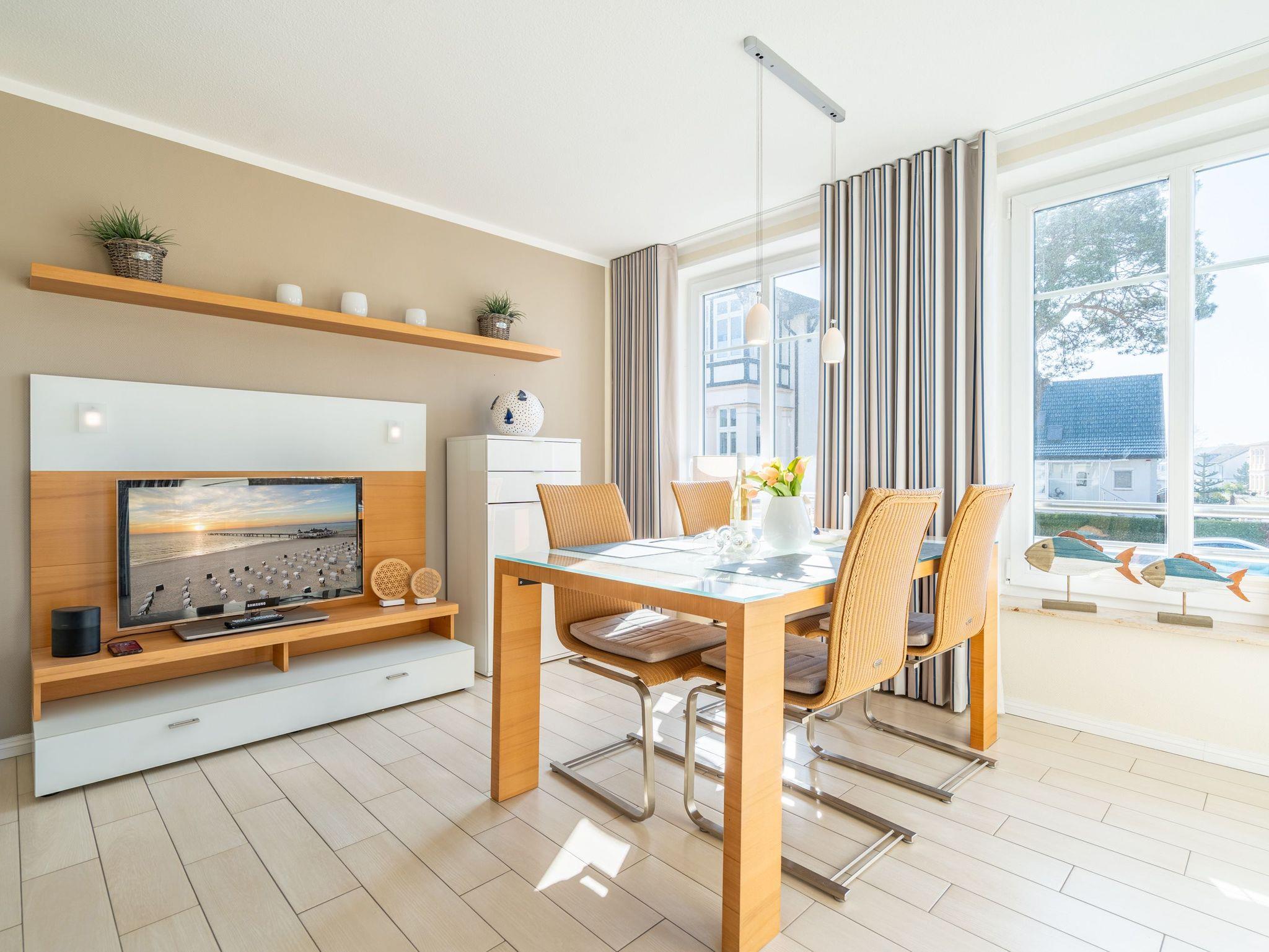 Modern. Lichtdurchflutet. Stilsicher ? so empfängt Sie die Ferienwohnung 5 im 1. Obergeschoss des neuen Hauses. Warme, an Strand und Meer erinnernde Farben, ausgesuchte Materialien und stilvolle Dekorationen verleihen dem komplett mit hellen italienischen Fliesen ausgelegten Appartement Finesse und Leichtigkeit. Der Wohnbereich ist mit einer bequemen Ledercouch und technischen Feinheiten (Flat-TV, Bose Sound Speaker 300 und Küchenradio) ausgestattet, von hier aus haben Sie Zugang zum sonnigen Südbalkon. Vom schönen Essplatz am Fenster genießen Sie den Ausblick auf die renovierten Villen in der Vinetastraße. Eine offene, komplett ausgestattete Küche mit Granitarbeitsplatte, ein gemütliches Schlafzimmer mit Doppelbett (1,80 m x 2 m) und Flat-TV sowie ein großzügiges Duschbad mit Fenster ergänzen die Wohnung und bieten Platz für 2 Personen. Als kleines Sommer-Highlight stellen wir Ihnen in den warmen Monaten (je nach Witterung) einen Strandkorb am Strand zur Verfügung ? genießen Sie die Auszeit! Das WLAN-Netz ist kostenfrei nutzbar. Zur Wohnung gehört außerdem der Tiefgaragenstellplatz Nr. 5 ? bequem, sicher und direkt am Haus. Ankommen, abschalten, Urlaub genießen.