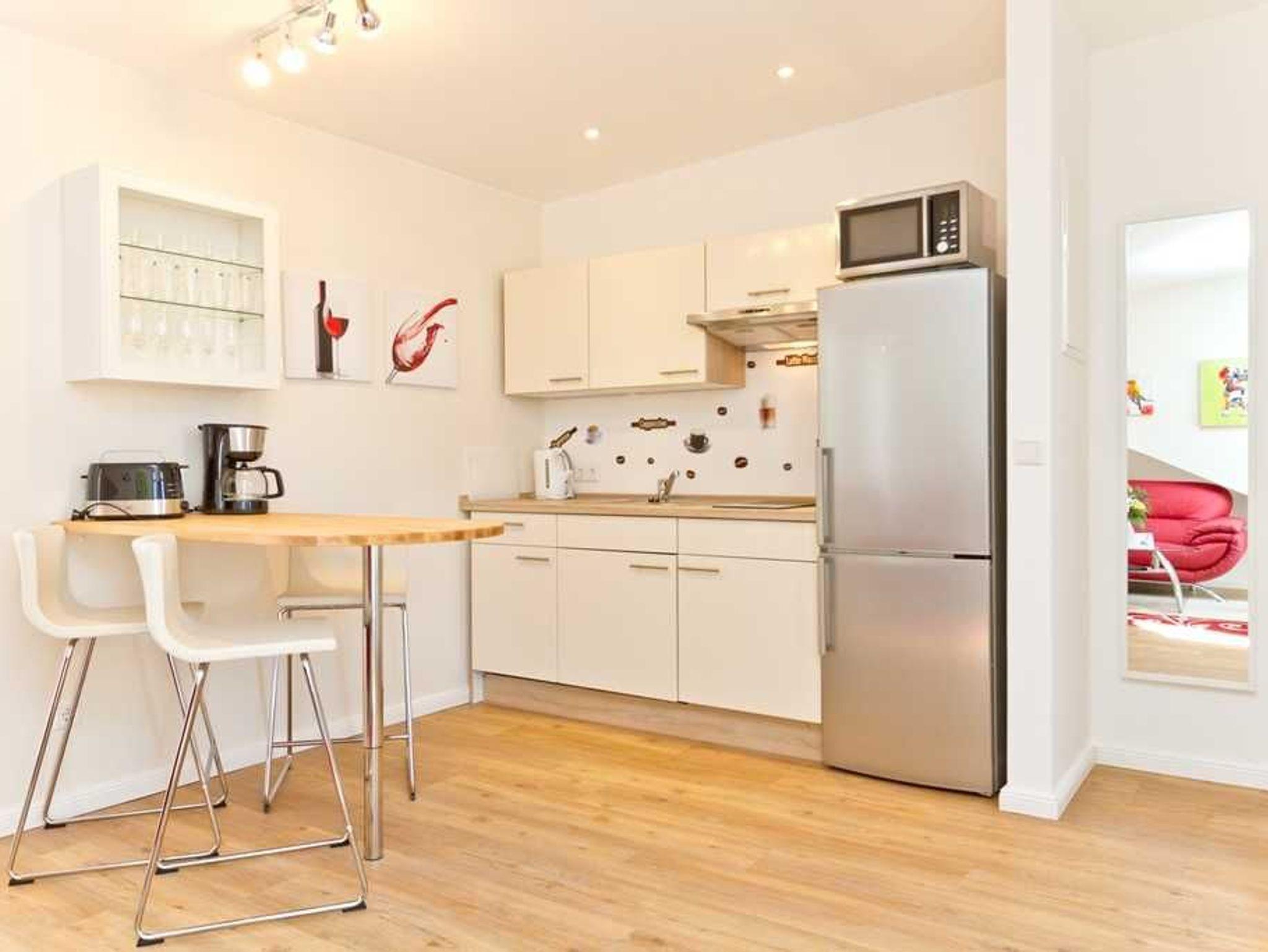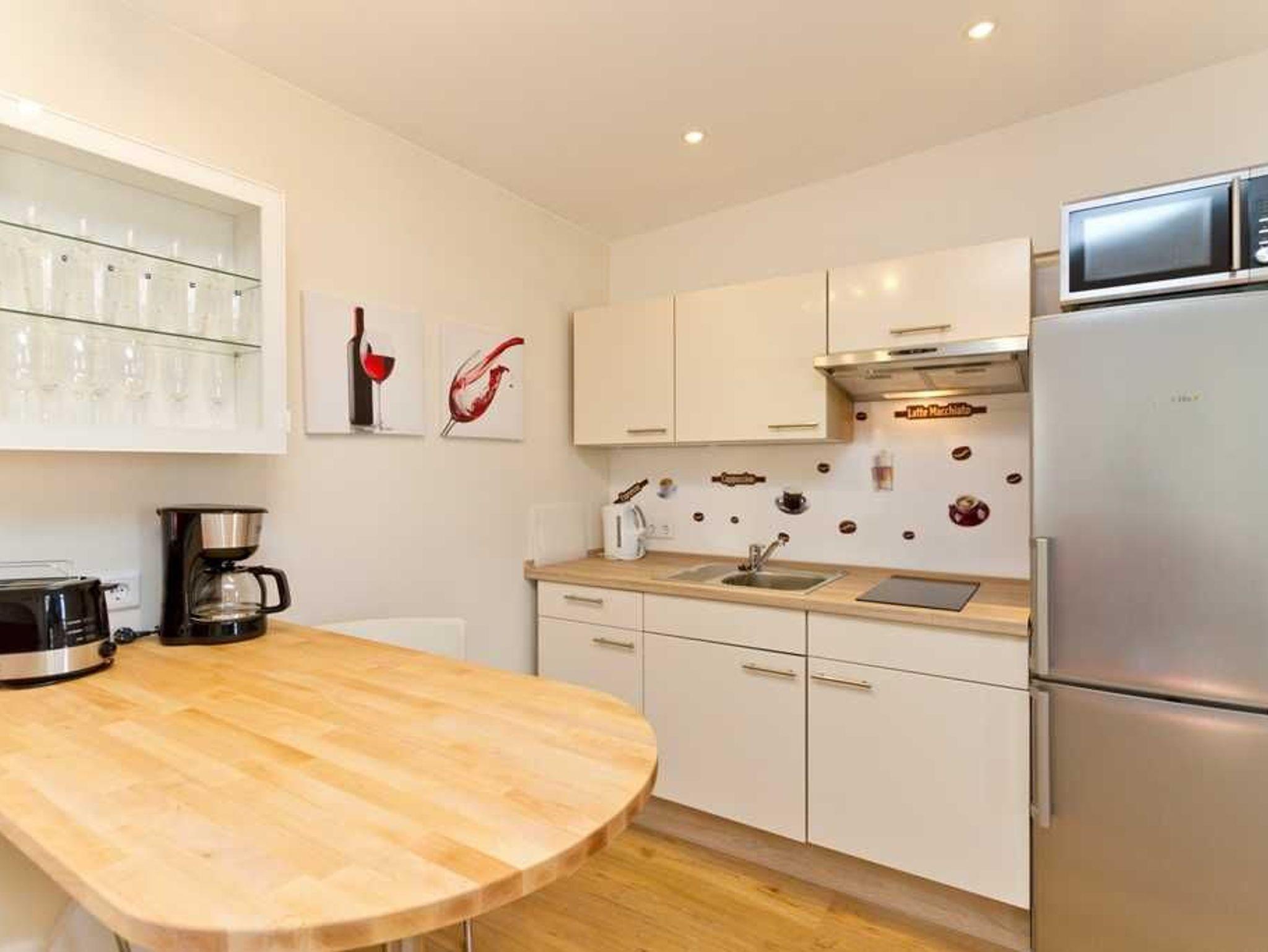 Freuen Sie sich auf einen gemütlichen Wohnraum inkl. Dachschrägen, mit einem Tresen und 3 Barstühlen sowie einer offenen Küchenzeile inkl. Ceranfeld, Mikrowelle mit Backofenfunktion, Kühlschrank und Geschirrspüler. Der angrenzende Balkon lädt zu einem Frühstück unter freiem Himmel oder das Gläschen Wein am Abend ein.
