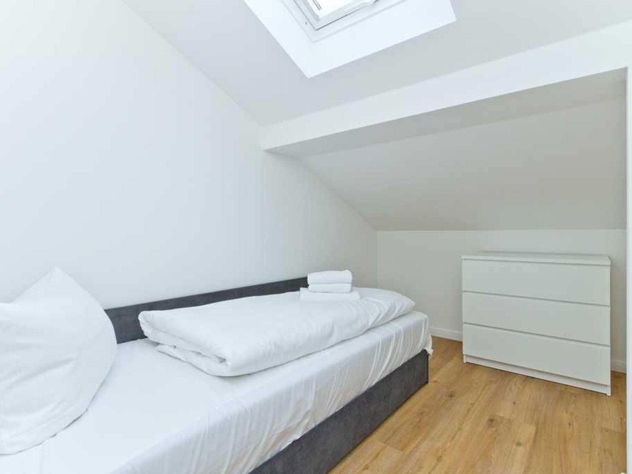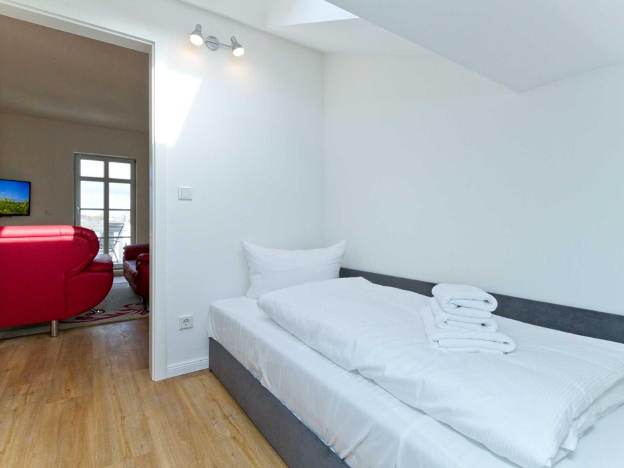 Das Elternschlafzimmer ist mit einem Boxspringbett (160 cm x 200 cm) ausgestattet. In dem 2. Schlafraum erwartet Sie ein Einzelbett. In beiden Räumen freuen sich Kommoden und Wandhaken auf Ihre Urlaubsgarderobe.