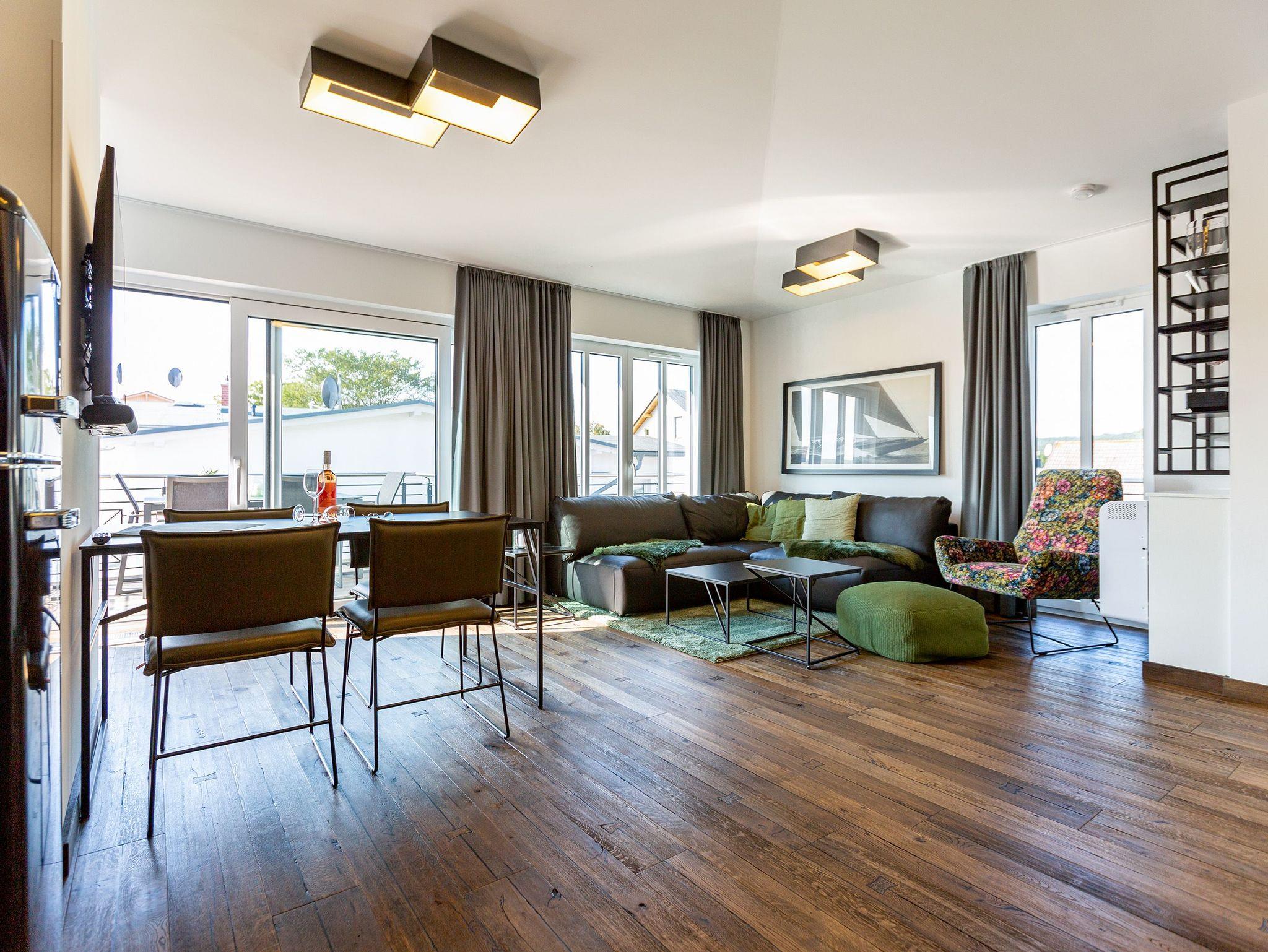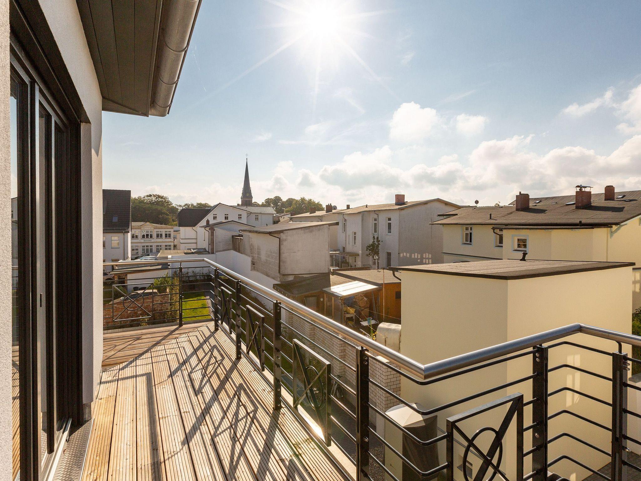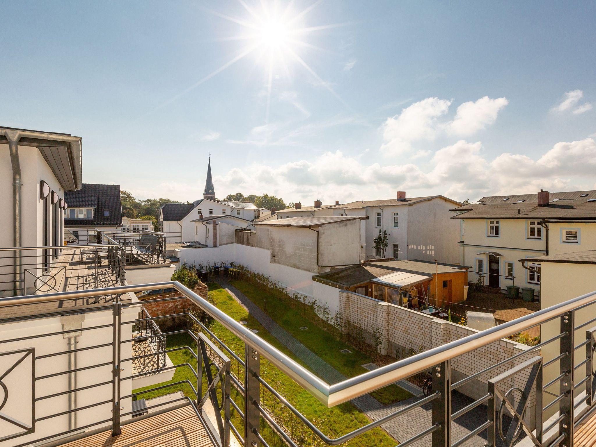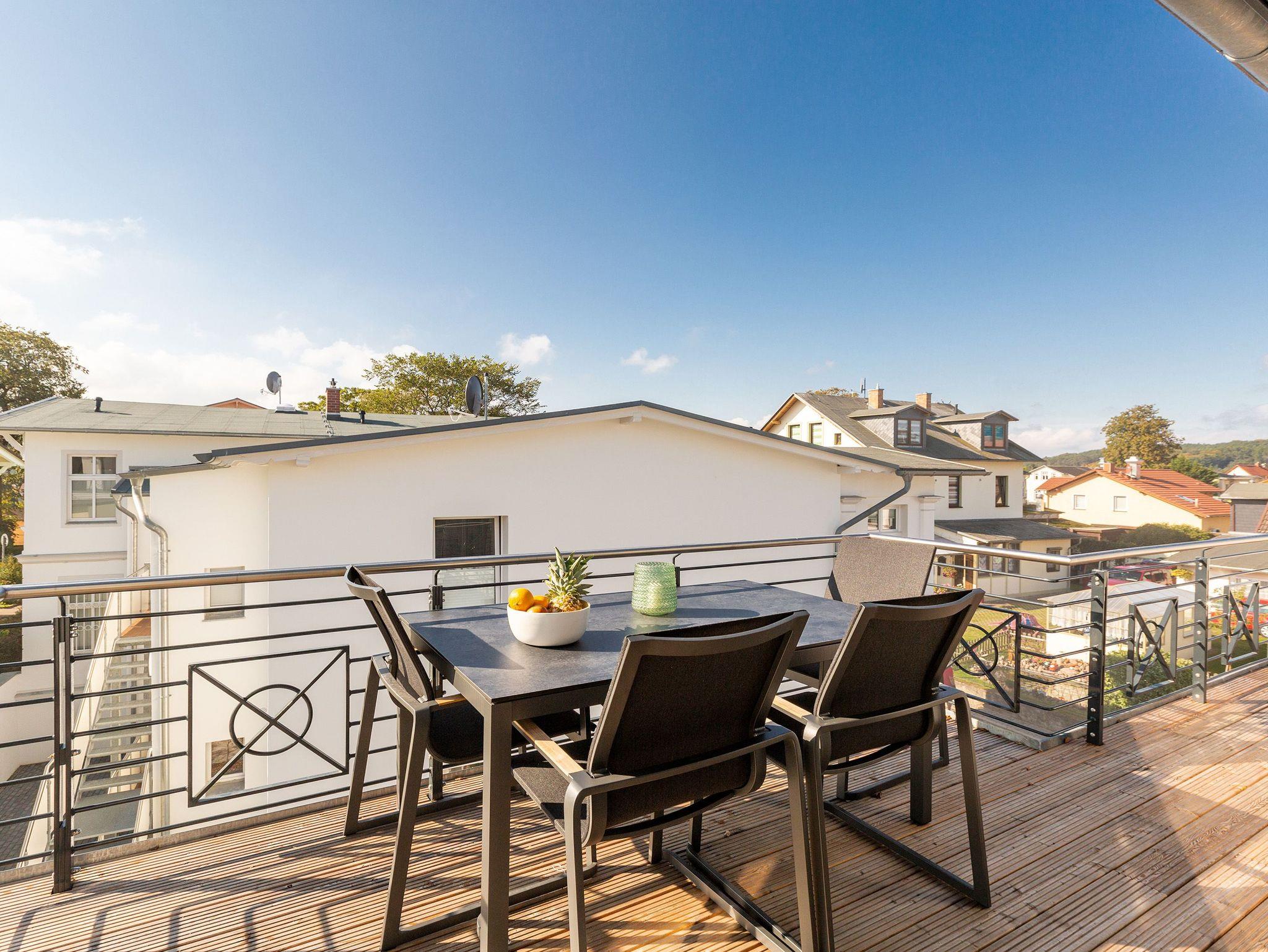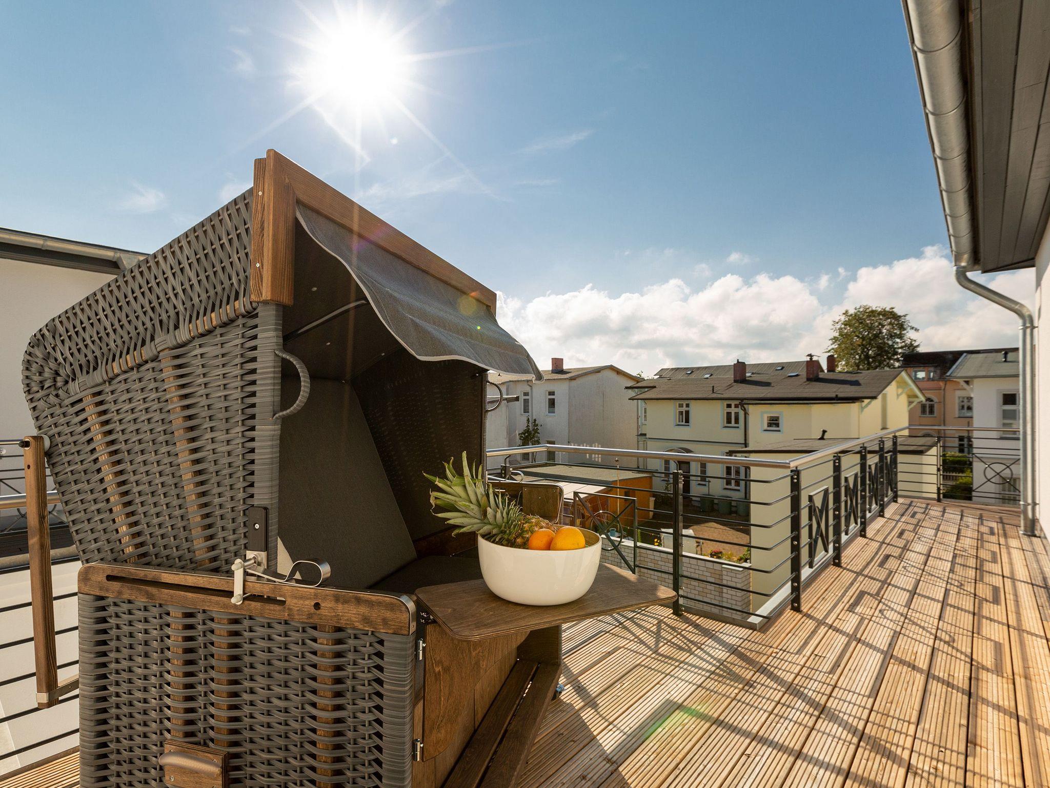 Herzlich Willkommen, über den Dächern von Ahlbeck. Auf der 42 Quadratmeter großen und umlaufenden Dachterrasse (OST/SÜD/WEST) werden Urlaubsträume wahr. In diesem stylischen, 66 Quadratmeter großen Penthouse ist nichts von der Stange. Die Möbel wurden von einem Metalldesigner und einer Tischlerei Manufaktur eigens dafür angefertigt. Filigrane Möbel handgefertigt aus Stahl, ebenso die Schränke und Regale mit Oberflächen aus echtem Beton, überzeugen durch haptische Eindrücke und durch Leichtigkeit auf einem neuen Level. In diesem Drei-Zimmer-Appartement können bis zu vier Personen eine besonders schöne und ruhige Auszeit genießen und sich rundum entspannen. Einfach in den XL-Strandkorb (Volllieger) fallen lassen und schon sind sie mittendrin im Ostseeurlaub. Auch ihren geliebten Vierbeiner dürfen sie hier sehr gerne mitbringen. In einem der beiden Schlafzimmer steht sogar ein Hundebett für Ihre Fellnase bereit. Ein Fahrstuhl bringt sie von der Tiefgarage bis direkt unters Dach. Treten sie ein in einen offenen und wunderschön eingerichteten Wohnbereich mit großer Wohnlandschaft, bequemen Sessel, Flat-TV und noblen Essplatz. Die hohen Räume und die offene Raumarchitektur erfrischen bereits beim Eintreten in die Suite. In diesem Quartier trifft Kunst auf Design und Gemütlichkeit auf erlesene Materialien. Vom Echtholzparkett aus Eiche, über dimmbare Leuchten von FIBIA, bis hin zu funkelnden Drahtglas-Accessoires alles ist aufeinander abgestimmt und vermittelt ein besonderes Urlaubsgefühl. Kalten Füßen können sie ade sagen, denn das Appartement ist mit einer Wohlfühl-Fußbodenheizung ausgestattet. Zudem verfügt ihr Feriendomizil im Wohn-/Essbereich über eine Klimaanlage. Das WLAN können sie kostenfrei benutzen. Die im offenen Wohnzimmer integrierte Küche ist mit Markengeräten wie Backofen mit Mikrowelle, Geschirrspüler und einem Induktionskochfeld sowie erlesenem Geschirr und Besteck bestens ausgestattet. Im geräumigen Gefrier-Kühlschrank finden viele Lebensmittel und Getränke Platz. Zwei Schlafzimmer mit bequemen Doppelbetten (1,60 m x 2,00 m), Flat-TV, angefertigten Einbauschränken und zwei Duschbäder bieten für jeden ein persönliches Rückzugsreich. Von den beiden Schlafzimmern aus haben sie Zugang zum umlaufenden Balkon. Die beiden Dornbracht/Duravit Bäder besitzen je eine bodengleiche Dusche, einen Waschplatz und ein Toto Tornado-Flush WC. Für kühle Abende bietet eines der Bäder, mit einer Finnischen Sauna, eine eigene Wellness-Oase. Bei Ihrer Anreise liegen Handtücher für sie bereit. Auch die Betten sind dann bereits bezogen. In der Tiefgarage sind für das Appartement zwei Parkplätze reserviert.