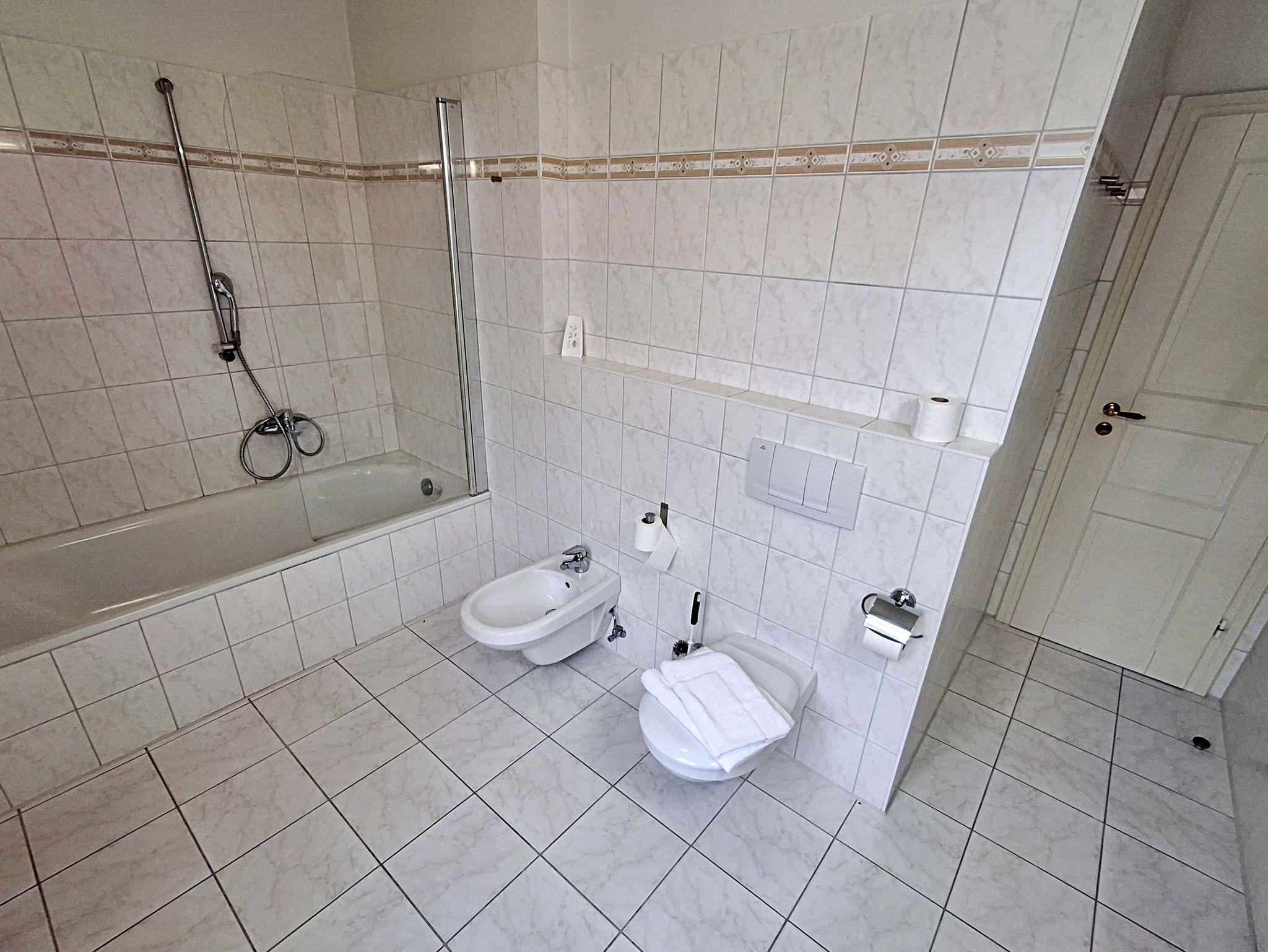 • Großes Badezimmer mit Badewanne, WC und Fenster plus zusätzliches Gäste-WC