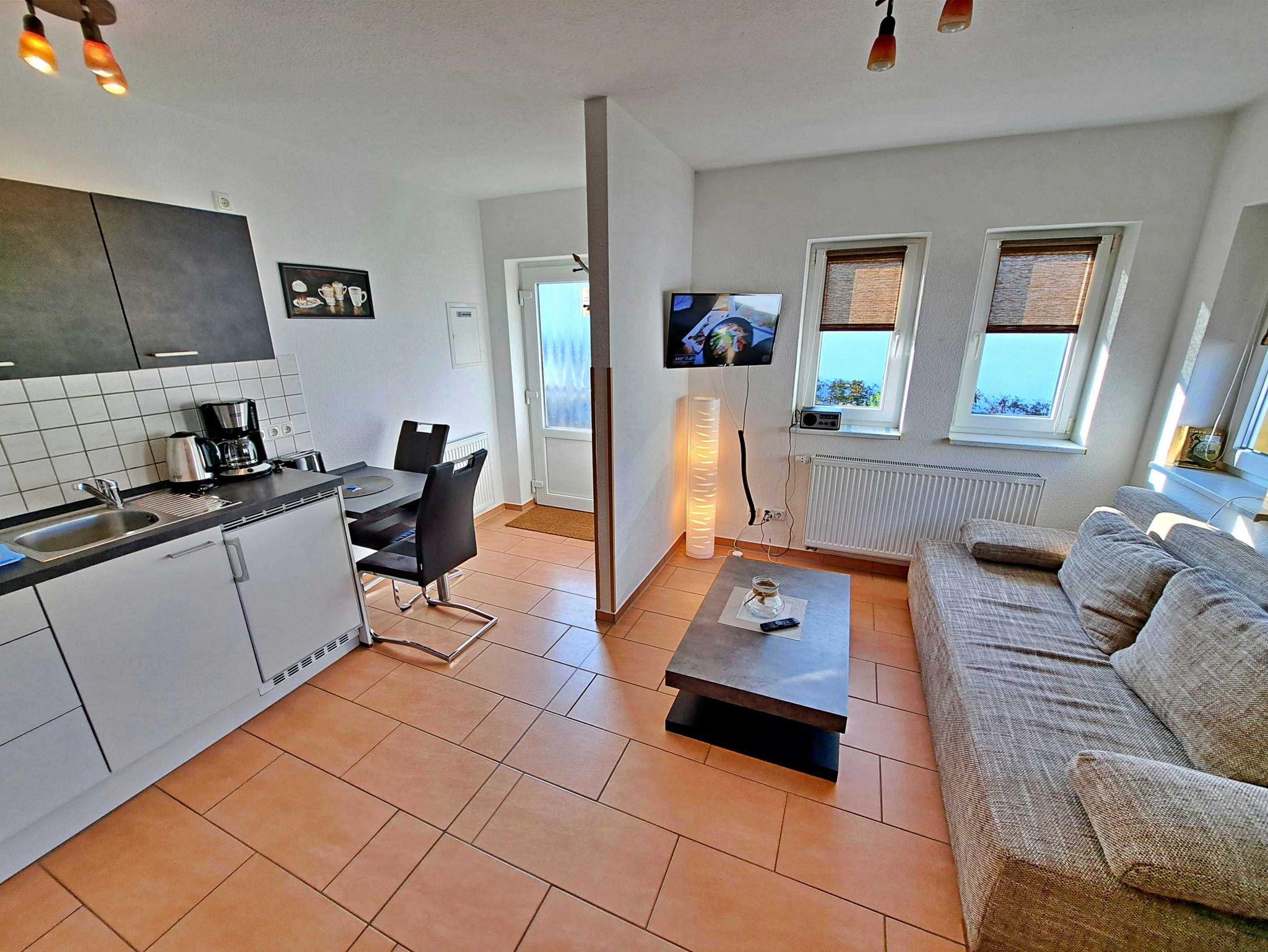 Klein und Fein - Willkommen im schönen Nichtraucher-Appartement im ersten Obergeschoss des Nebengebäudes vom “Haus Bella”! Mit seinen 25 qm ist dieser helle und einladende Raum perfekt für Ihren Aufenthalt. Der kombinierte Wohn-/Schlafraum bietet Ihnen ein bequemes Doppelbett und eine moderne Couchgarnitur, die zum Entspannen einlädt. Darüber hinaus stehen Ihnen ein Flachbild-TV, ein Esstisch mit zwei Stühlen sowie eine kleine Küchenzeile zur Verfügung, die mit einem Zwei-Platten-Herd, Mikrowelle, Kühlschrank, Toaster, Wasserkocher und Kaffeemaschine ausgestattet ist. Das Badezimmer verfügt über eine Dusche und WC. Genießen Sie auch die Sitzecke im Hof, wo Sie entspannen oder grillen können. Für Ihre Bequemlichkeit sind der Parkplatz am Haus sowie WLAN für alle Gäste kostenfrei.