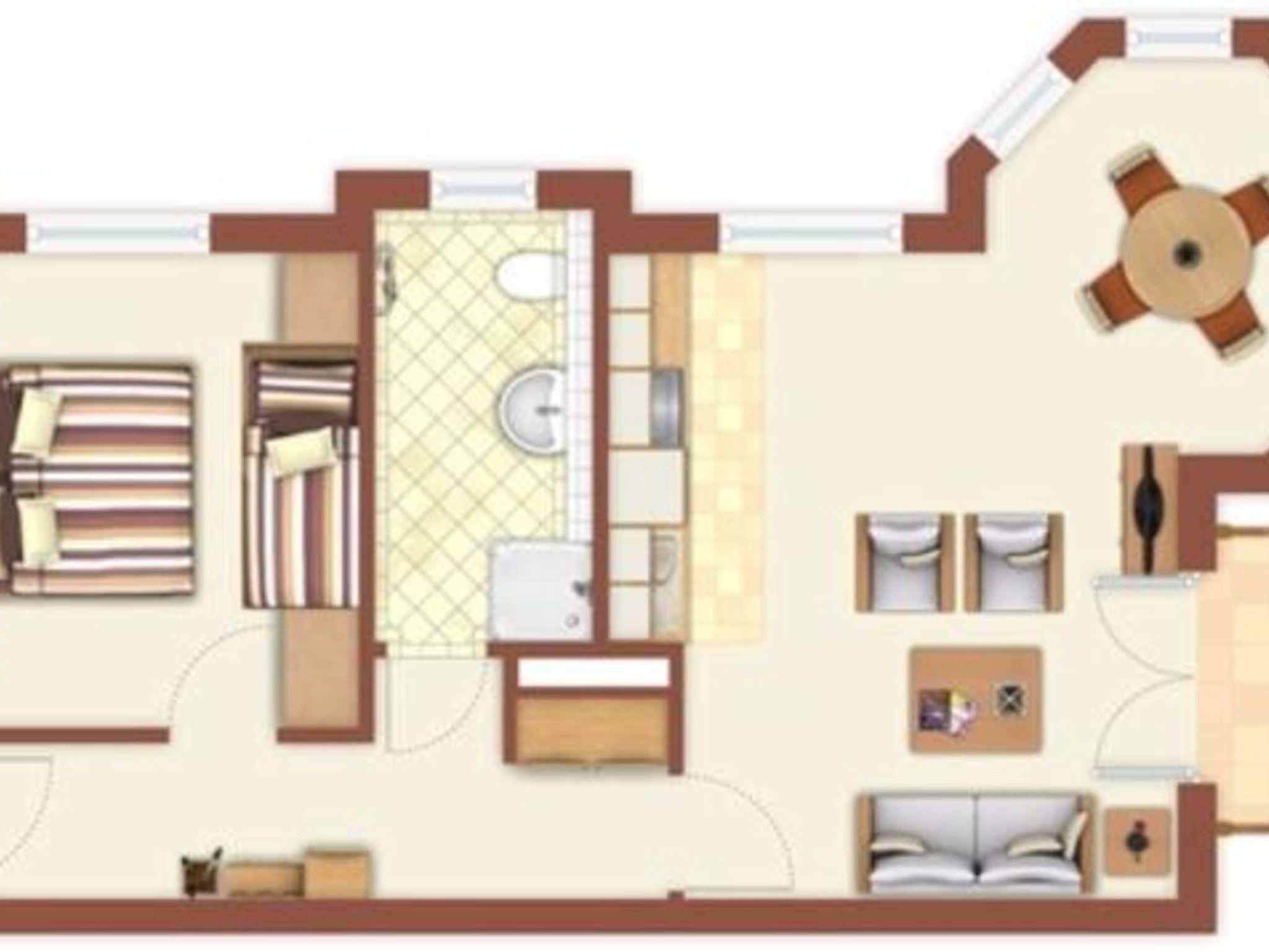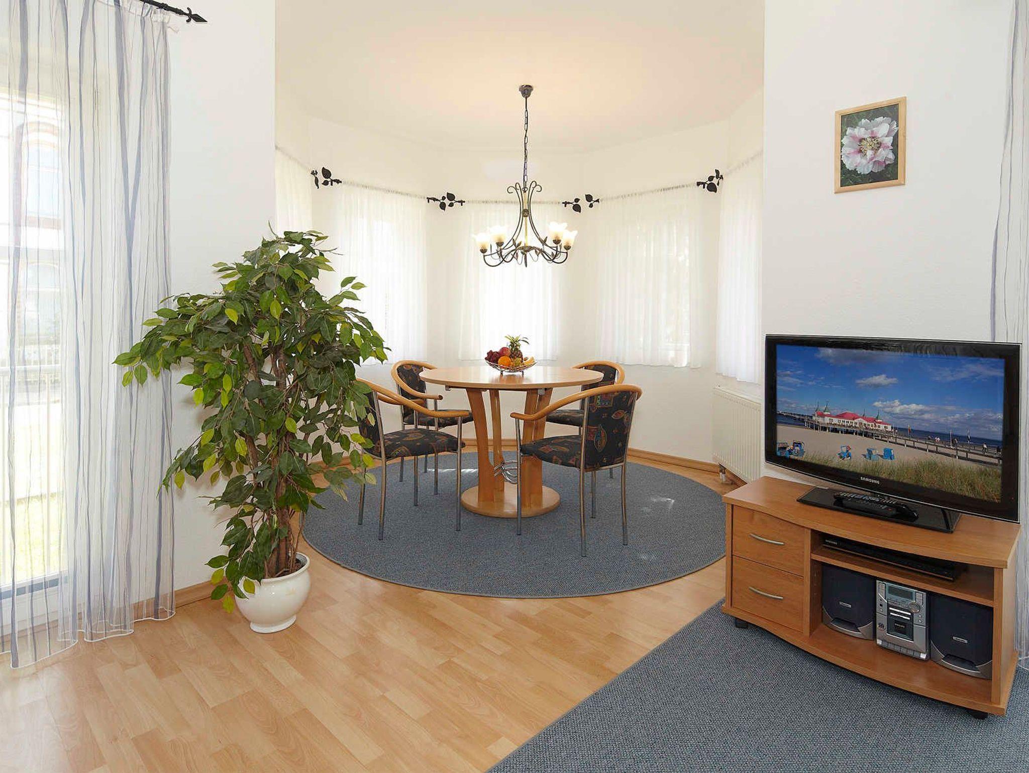 Die hochwertig eingerichtete 2-Zimmer-Ferienwohnung verfügt über ein komfortabel eingerichtetes Wohnzimmer (Flachbildfernseher, DVD-Player, etc.) mit einer komplett ausgestatteten Küchenzeile (Geschirrspüler, Mikrowelle, etc.). Im Erkerbereich des Wohnzimmers befindet sich der Esstisch. Das Schlafzimmer ist mit einem Doppelbett (neues Doppelbett 2025) sowie einem Einzelbett ausgestattet. Für Raucher gibt es eine Miniterrasse vor dem Wohnzimmer.