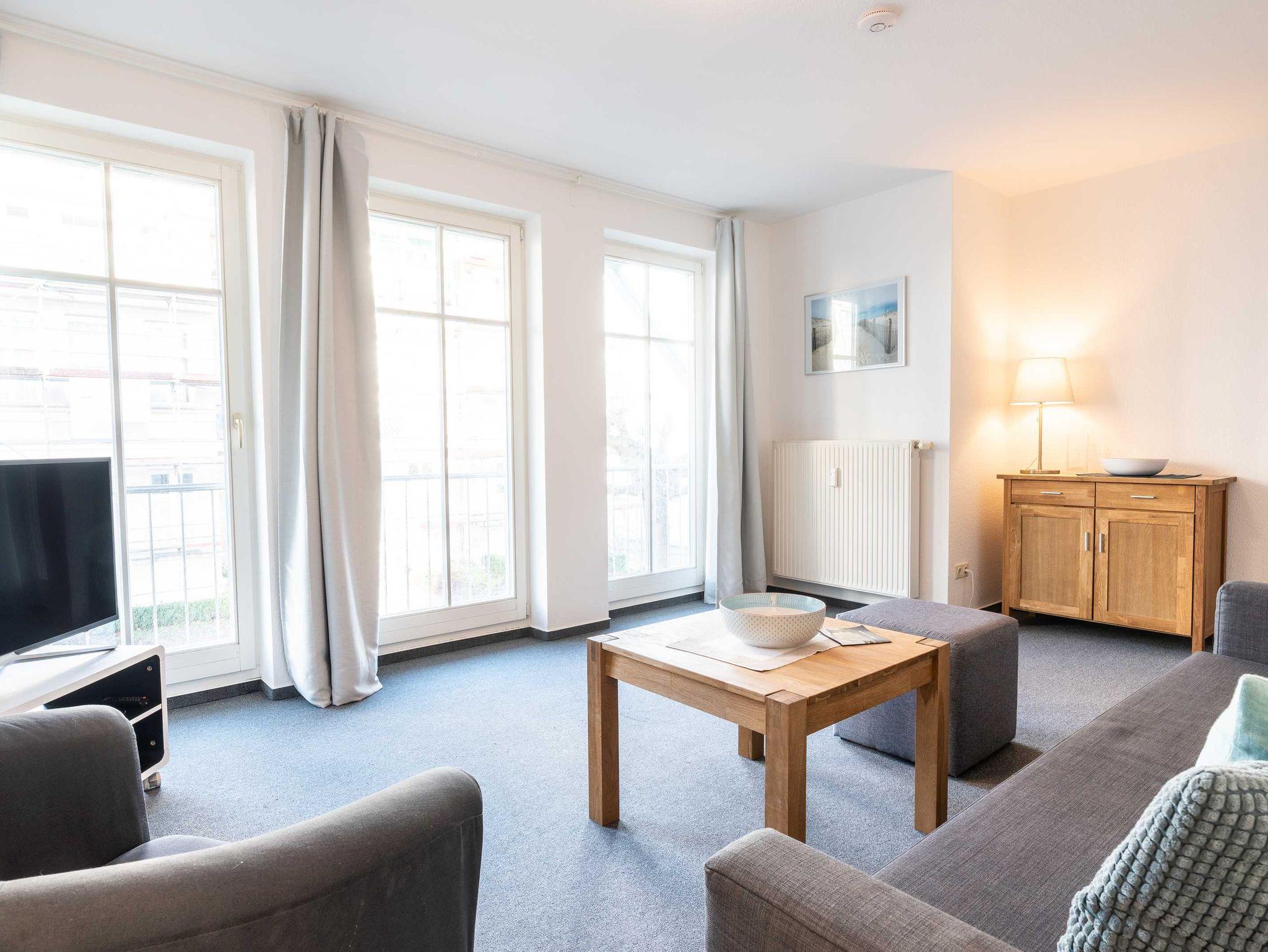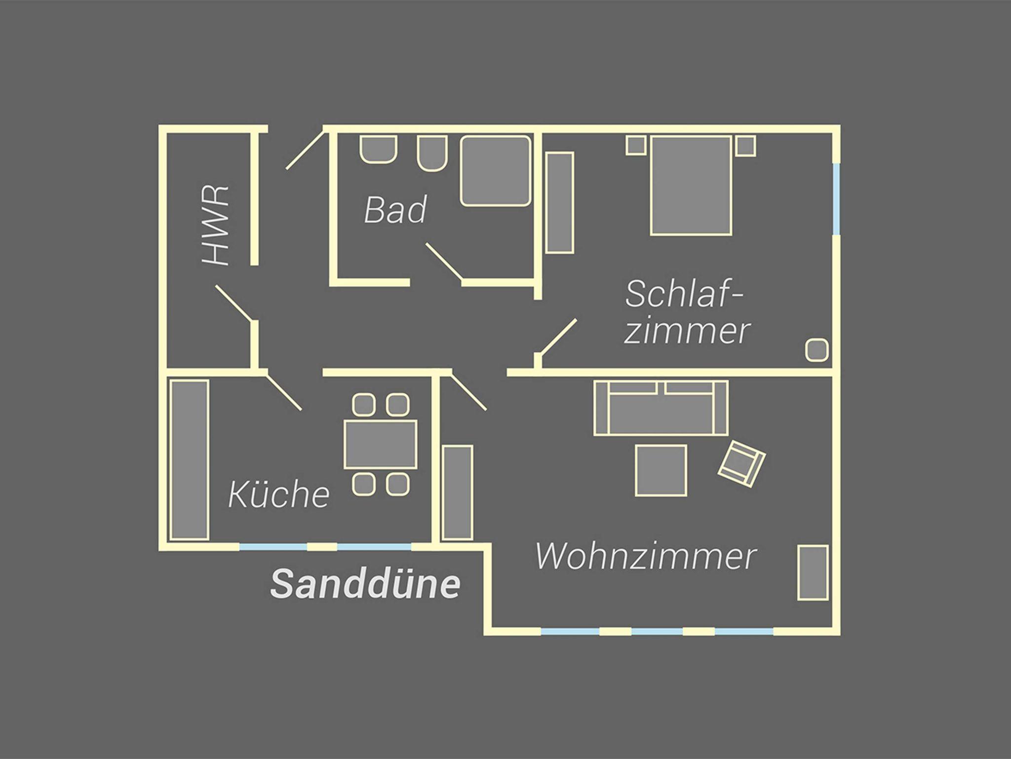 Das ca 58 qm große Appartement Sanddüne verfügt über ein Schlafzimmer mit Doppelbett und großem Kleiderschrank, ein gemütliches Wohnzimmer mit Sofa, bei dem bei Bedarf zwei weitere Gäste Platz finden).