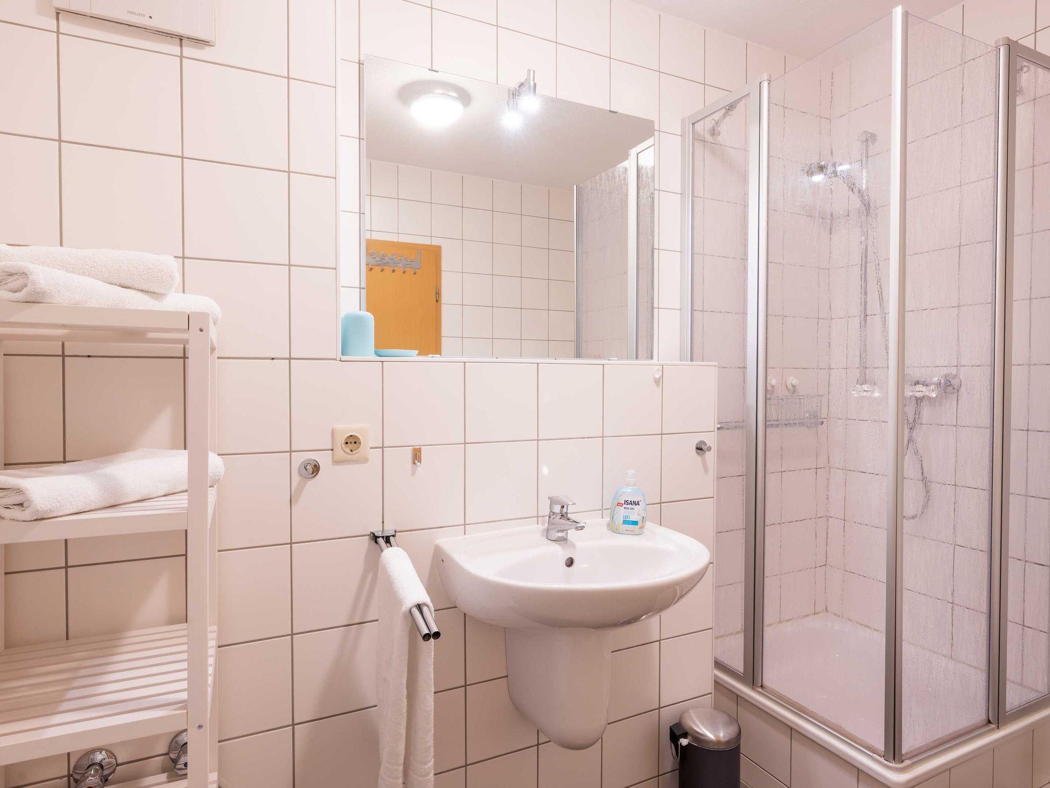 Bad mit Dusche, Waschtisch, WC und Fön.