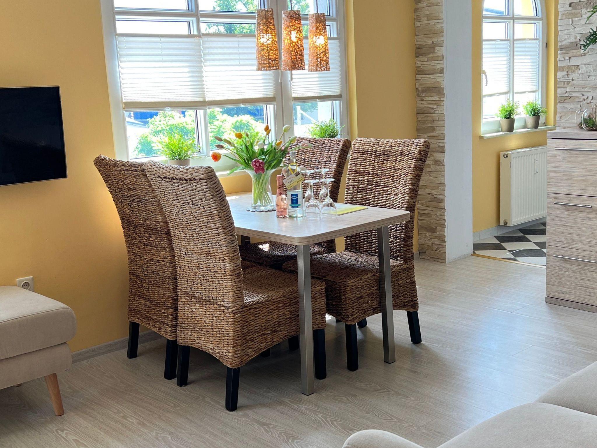 Die nur 80 Meter vom Strand entfernte Obergeschosswohnung besticht durch seine Helligkeit. Viele Fenster in einem Erker mit Tisch und Sitzmöglichkeiten dienen Ihrer Gemütlichkeit. Ein großzügiger Wohn-/Schlafraum sowie ein zweites, separates Schlafzimmer sorgen für Familien mit ausreichend Platz. Zwei große Betten (160cm und 140cm) sowie eine farblich harmonischer Ruhesessel lassen Ihrer Ruhe keine Wünsche offen. Eine moderne, grundausgestattete Einbauküche, LED-SMART-TV, HiFi-Anlage und Internetzugang lassen Sie bei uns alle Sorgen vergessen. Ihr Appartement ist sowohl Allergiker wie Nichtraucher freundlich. Weiße, kräftige Baumwollbettwäsche und weiche Handtücher werden Ihnen schmeicheln. Geschirrtücher und Duschvorleger sind vorhanden. Interessant für junge Familien sind die Unterbringungsmöglichkeiten mitgebrachten Eigentums (entweder im Haus Ihres Appartements Parterre oder im Fahrradschuppen). Auf dem Hof finden Sie Wäscheständer für Ihre nasse Wäsche. Ihrem Fahrzeug ist ein Parkplatz direkt am Ferienhaus reserviert. Für eventuell benötigte Hochstühle oder Kinderreisebetten entstehen Ihnen nach Rücksprache keine zusätzlichen Kosten. Bitte informieren Sie uns über Ihre Wünsche rechtzeitig.