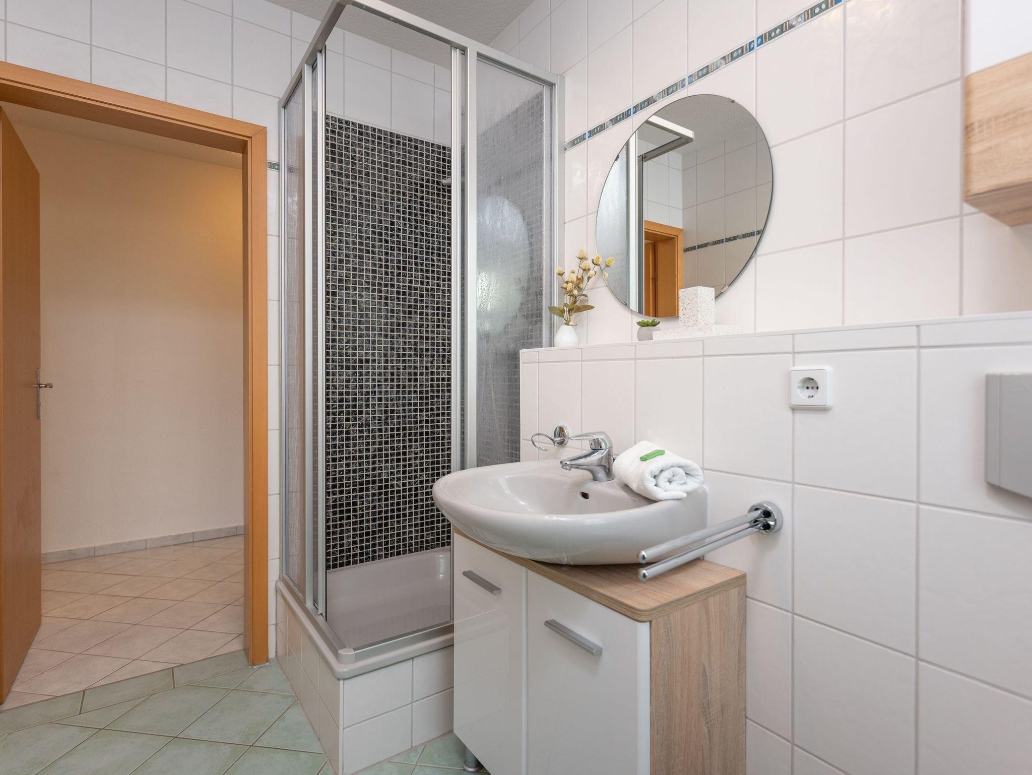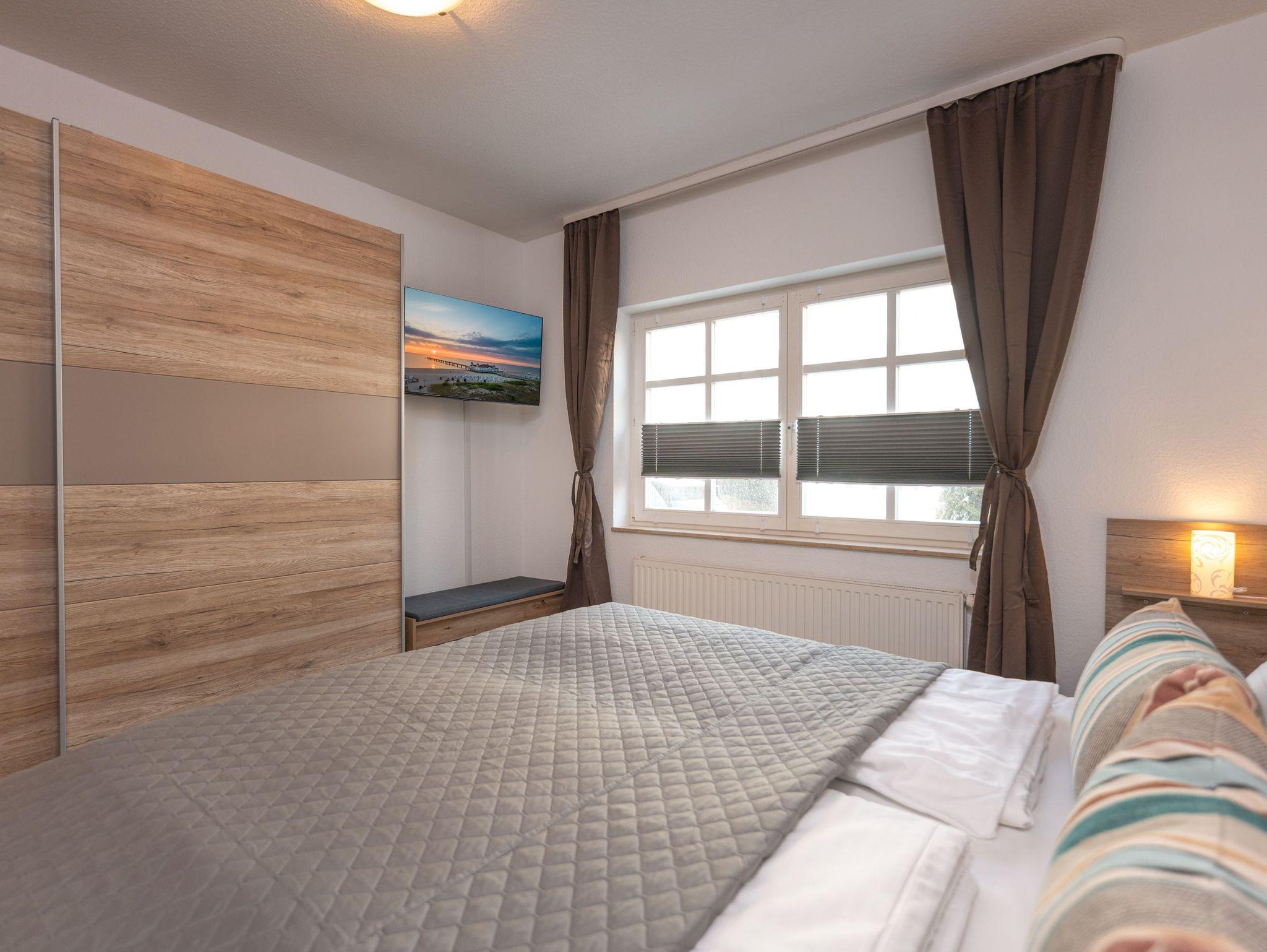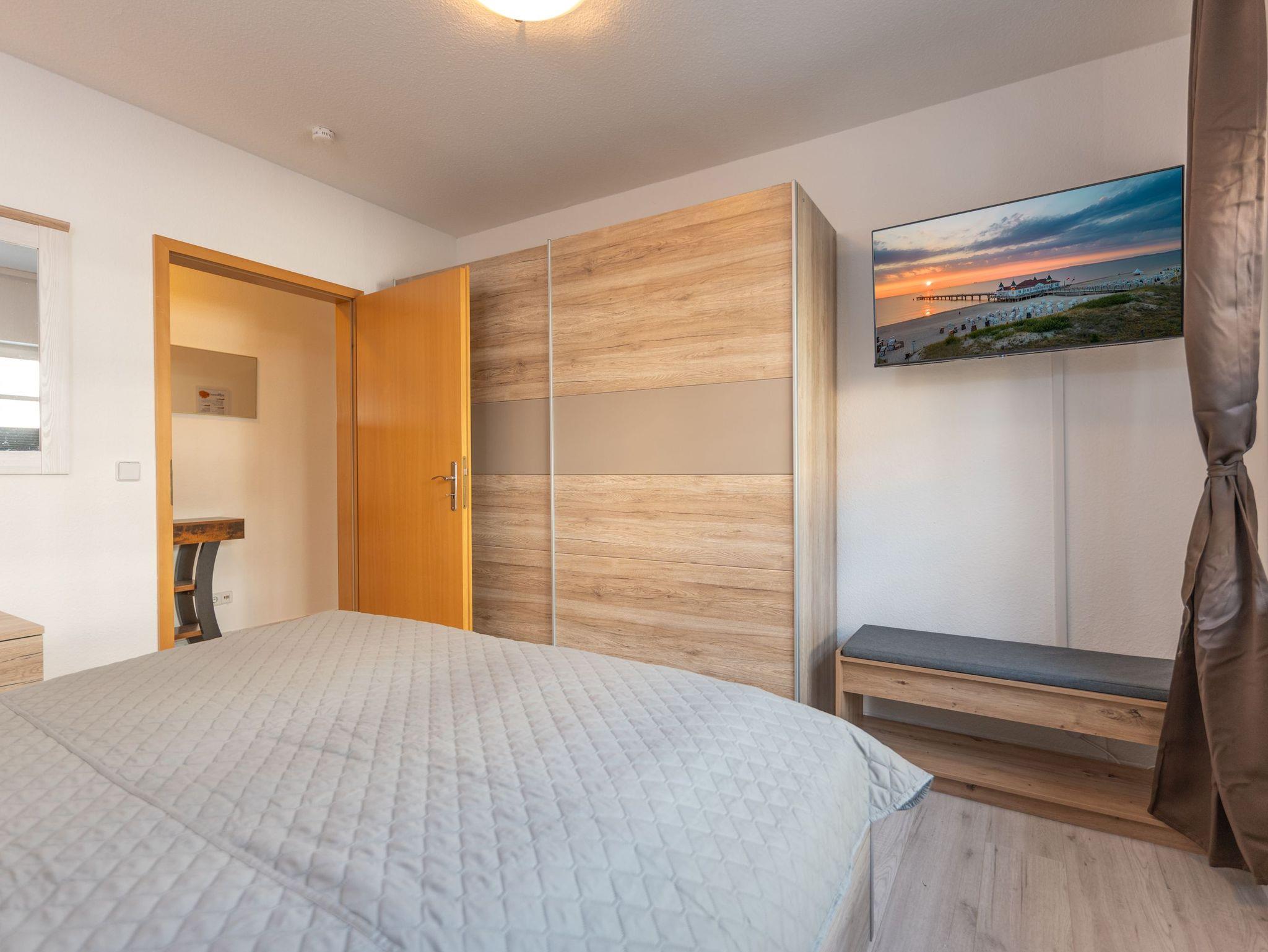Das Schlafzimmer ist mit einem komfortablen Doppelbett, einem Kleiderschrank sowie einem Fernseher ausgestattet und bietet einen angenehmen Rückzugsort. Das Badezimmer verfügt über eine Dusche und WC.