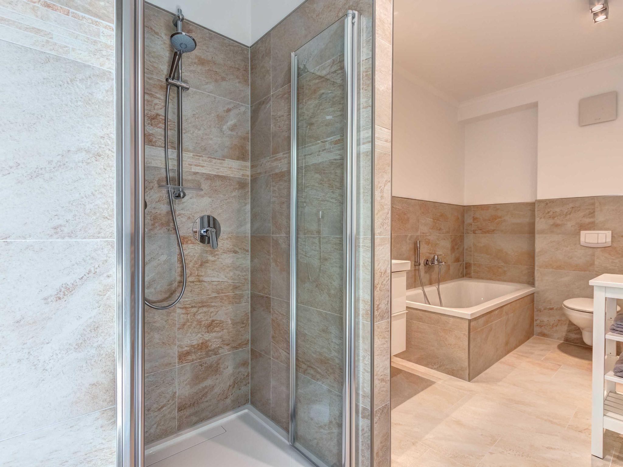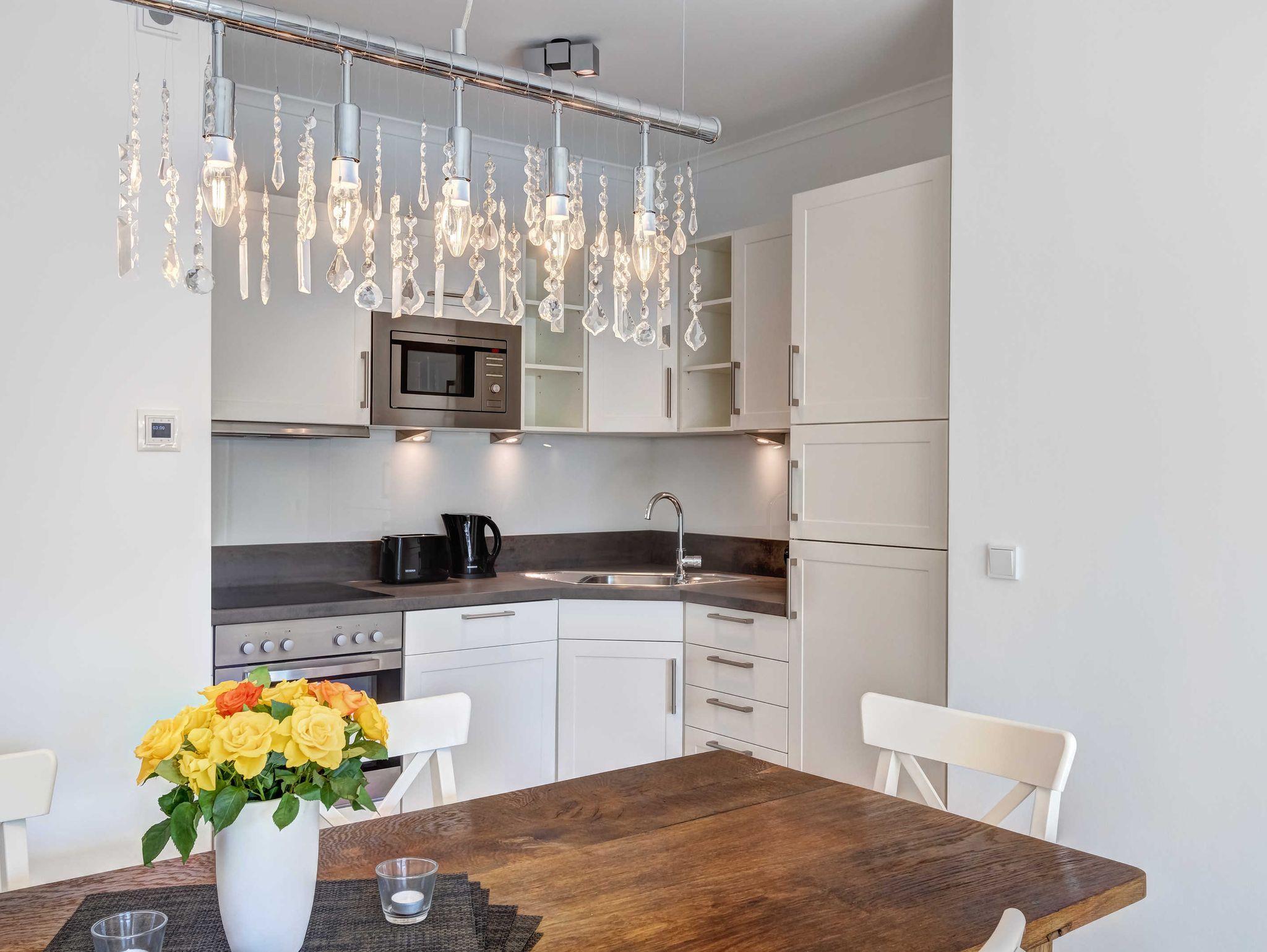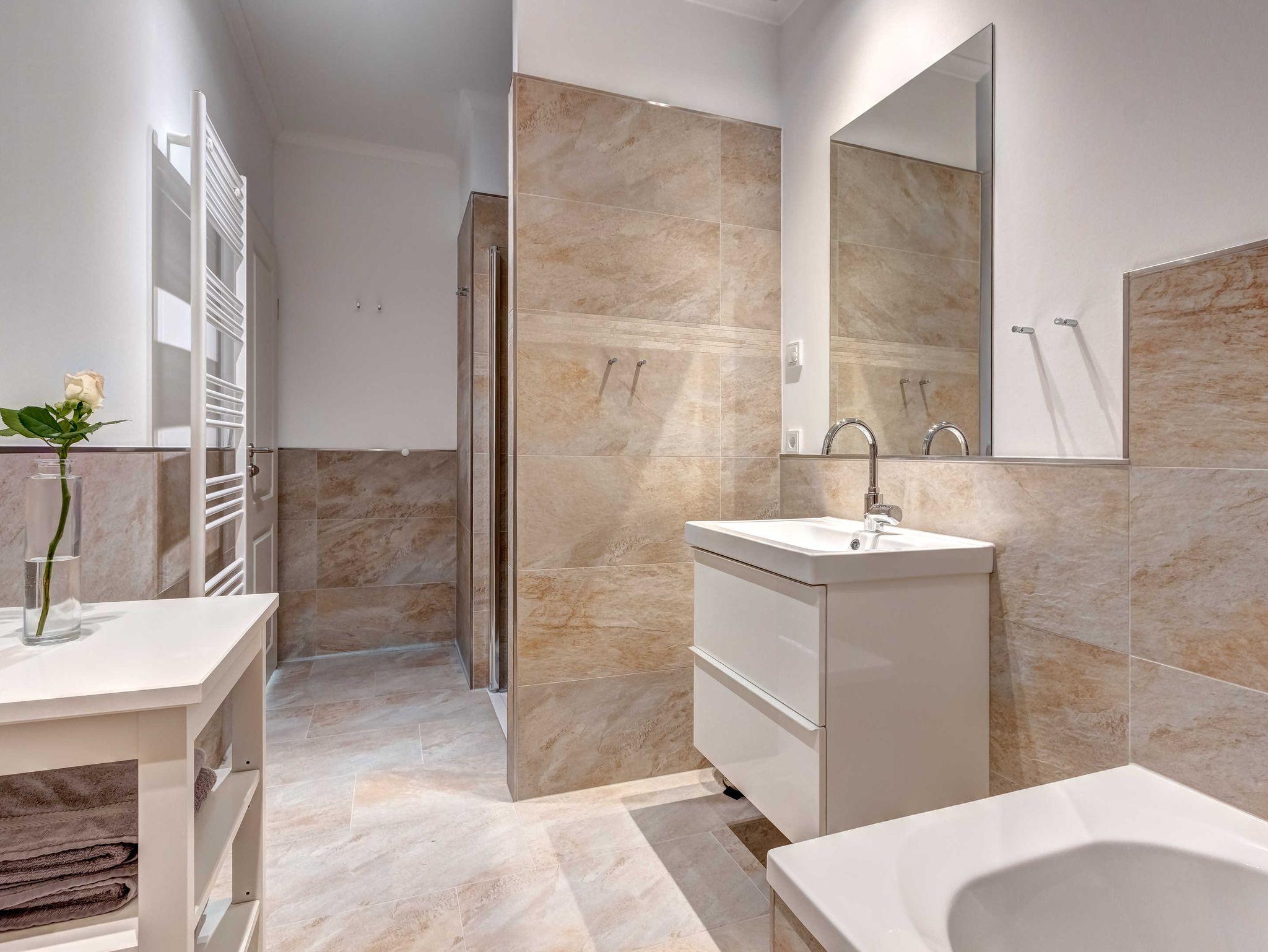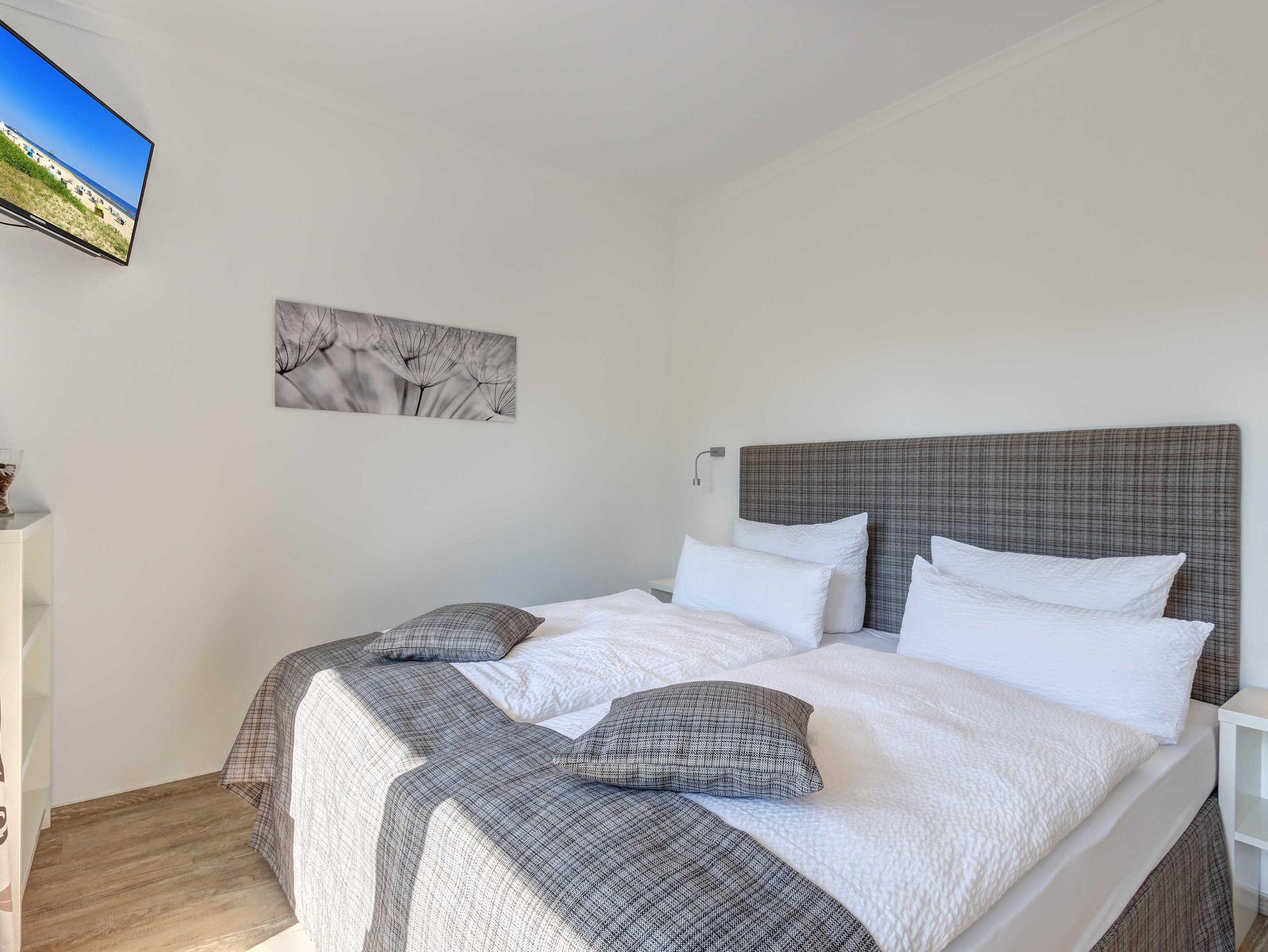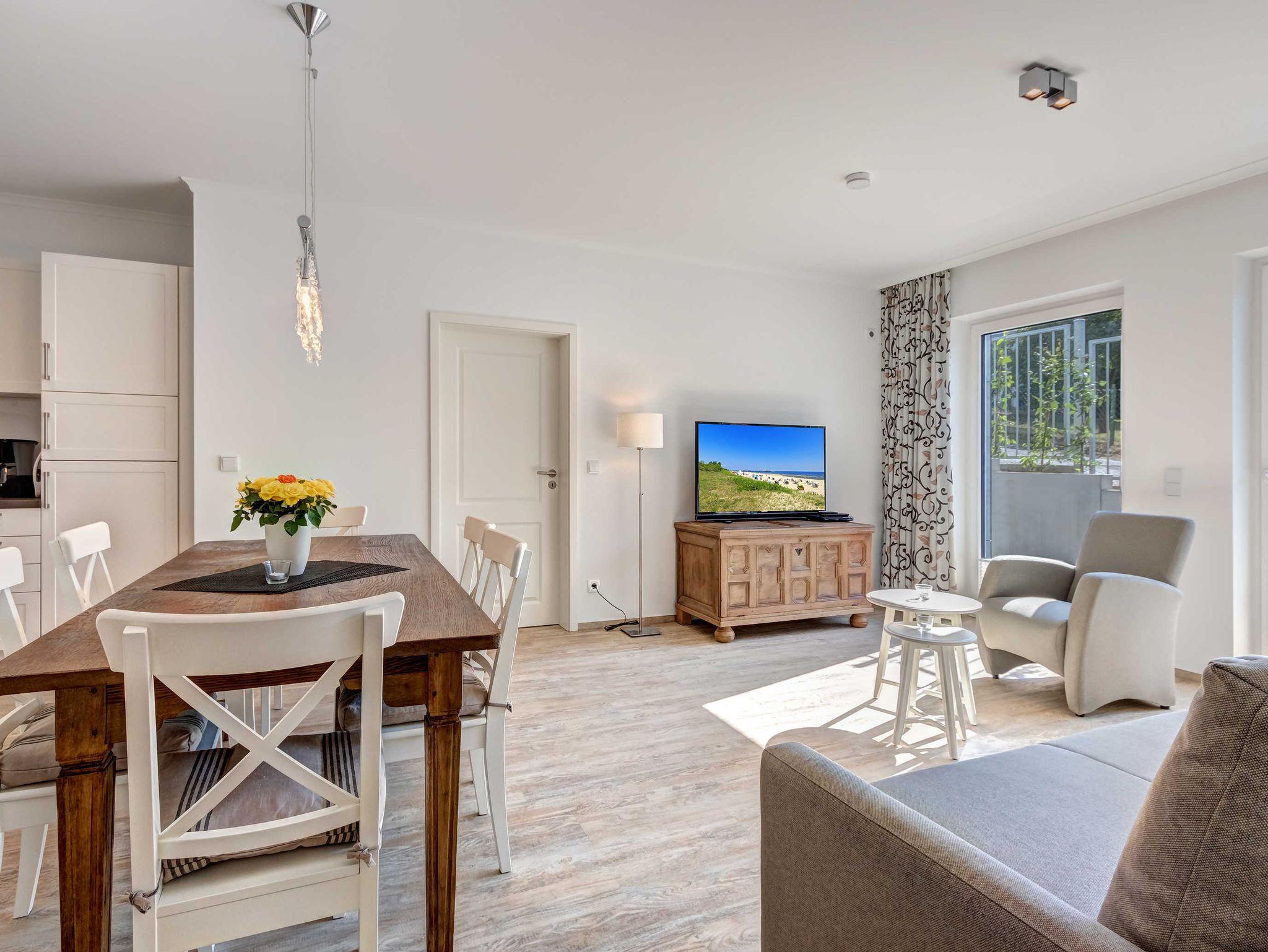 Neubau 2018 mit Fußbodenheizung. Modern eingerichtete 4-Zimmer-Wohnung mit Terrasse und Garten! Die Wohnung ist speziell für Familien mit (kleinen) Kindern gedacht, bietet aber auch bei Belegung mit 6 Erwachsenen den gewünschten Komfort.. Die Wohnung verfügt über drei separate Schlafzimmer (2 Doppelbetten, 1 Doppelschrankbett), jeweils mit zugehörigem ensuite-Bad, Wohnzimmer mit Küchenzeile und Essplatz. Von den drei Bädern sind zwei Duschbäder und eines mit Wanne und Dusche. Im eingezäunten Garten befindet sich ein kleiner Privat-Spielplatz mit Sandkasten und Spielgerät. Eines der drei Schlafzimmer (mit dem Wannenbad ensuite) verfügt über zwei Kinderreisebetten, 2 Kinderhochstühle, Wickelkommode, eine kleine Auswahl Spielzeug und ein hochwertiges ausklappbares Schrankbett, damit es auch erwachsene Gäste bequem nutzen können. Zwei Pkw-Stellplätze sind inklusive. Die Villa Teutonia liegt etwa 300m von der Strandpromenade entfernt. Zum Ortszentrum und der bekannten Ahlbecker Seebrücke sind es ca. 8-10 Minuten zu Fuß.